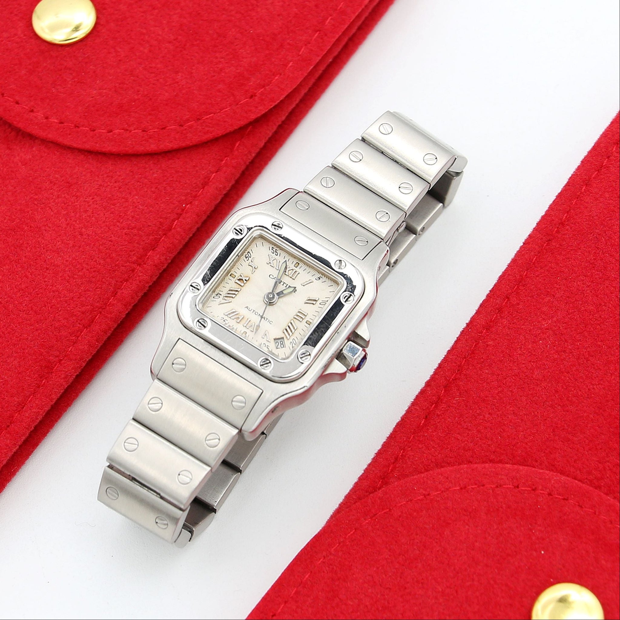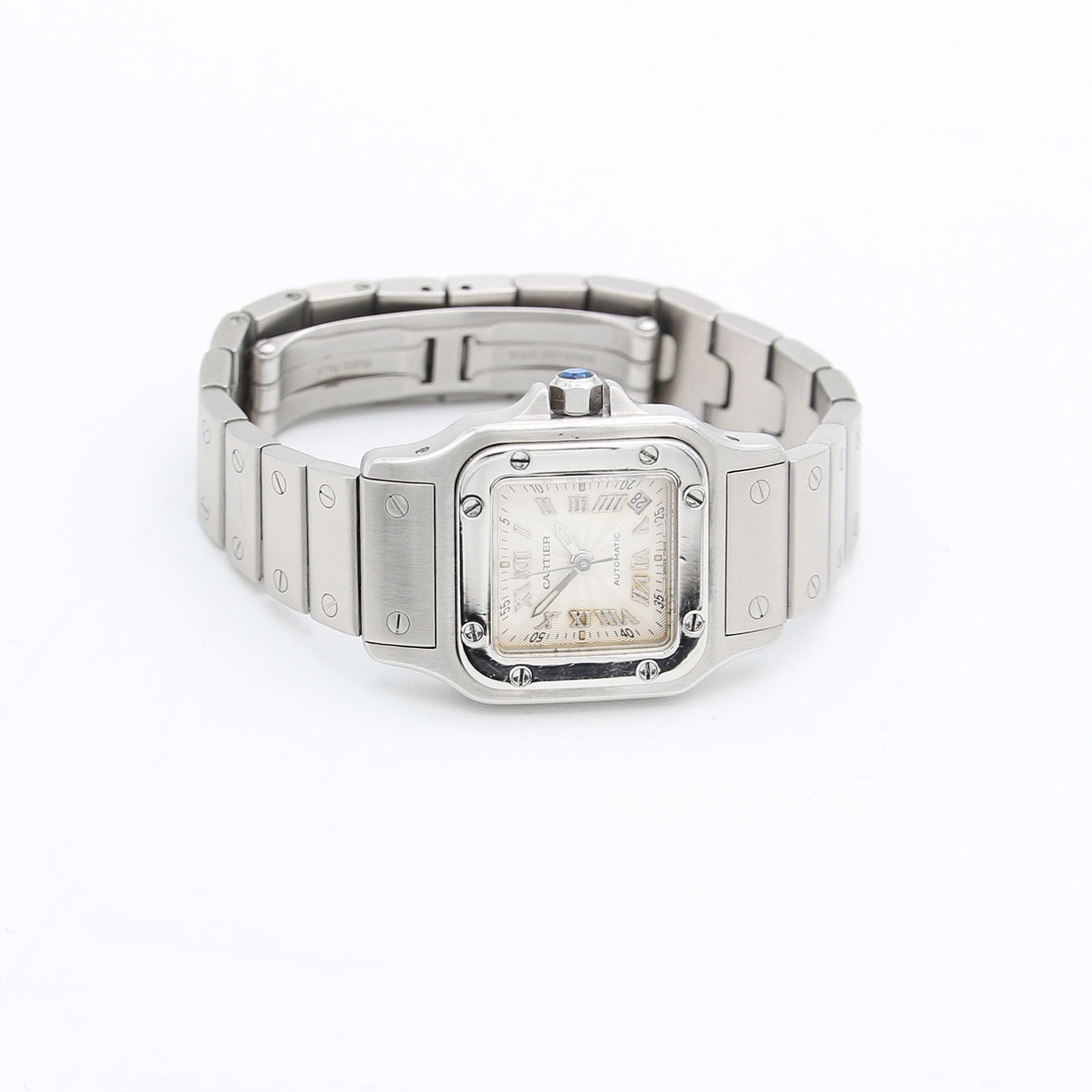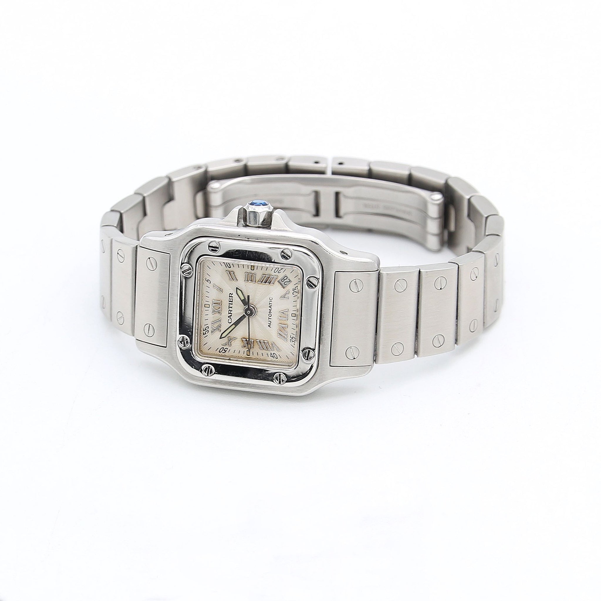 Zum Verkauf steht eine gebrauchte Vintage-Armbanduhr „Santos Galbée“ von Cartier, Ref. 2423 aus dem Jahr 2000, mechanisch mit automatischem Aufzug, in Stahl.