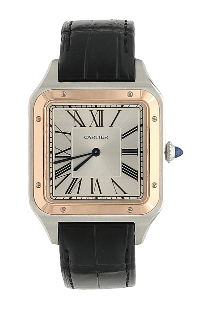 The typical details of the Santos models are all there: the sword-shaped blue polished hour and minute hands, the Roman numerals and the cabochon-set crown.