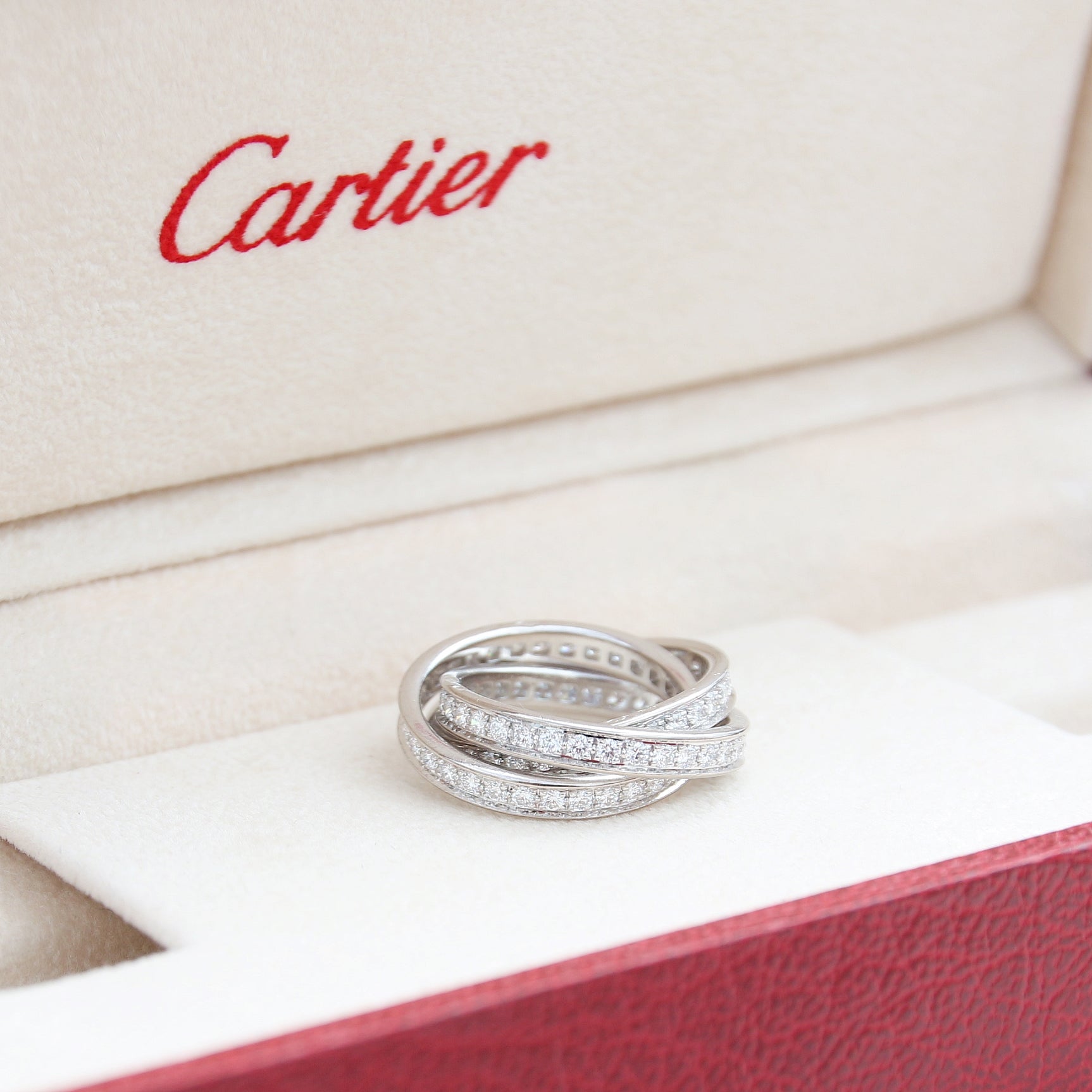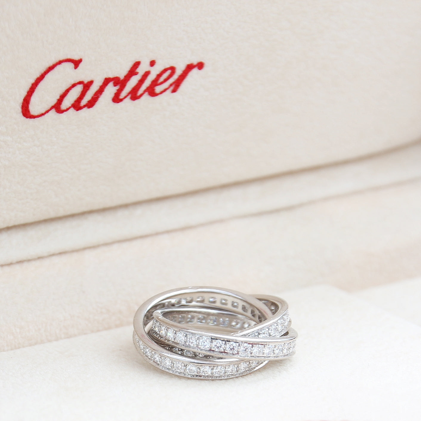 Der Dreierring kam vor fast einem Jahrhundert im Jahr 1924 auf den Markt, als Art Deco in seiner Blütezeit war. Die drei ineinander verschlungenen Ringe wurden von Louis Cartier auf Wunsch von Jean Cocteau entworfen und sind aus verschiedenen Goldtönen – Weiß-, Gelb- und Roségold – gefertigt. Sie symbolisieren Freundschaft, Treue und Liebe.