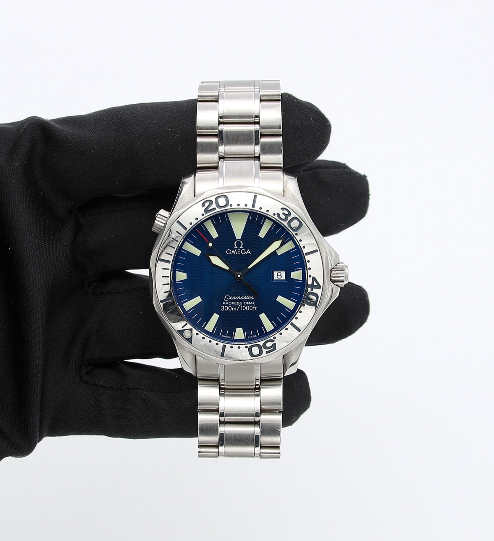 Die Omega Seamaster Diver 300m 2265.80 verfügt über ein 41-mm-Edelstahlgehäuse, das ein blaues Wellenzifferblatt an einem Edelstahlarmband umgibt.
