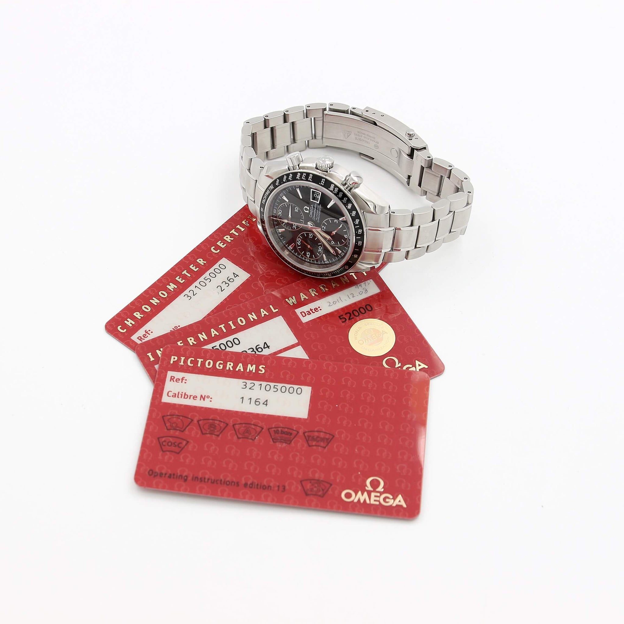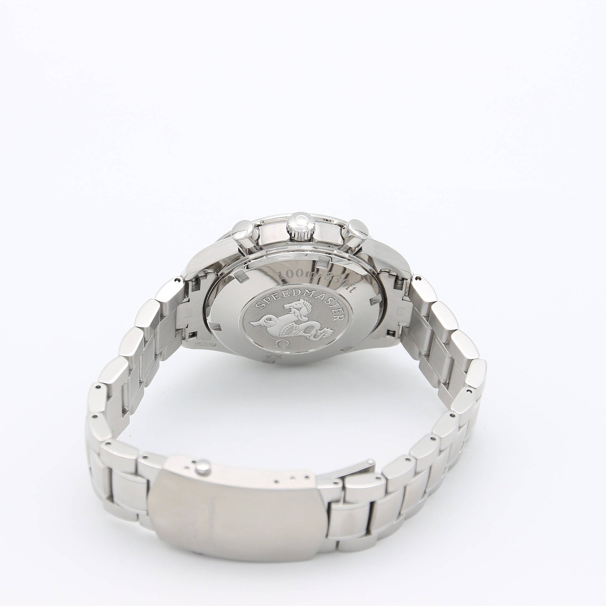 Features of this Omega Speedmaster include hours, minutes, seconds, chronograph, and date.