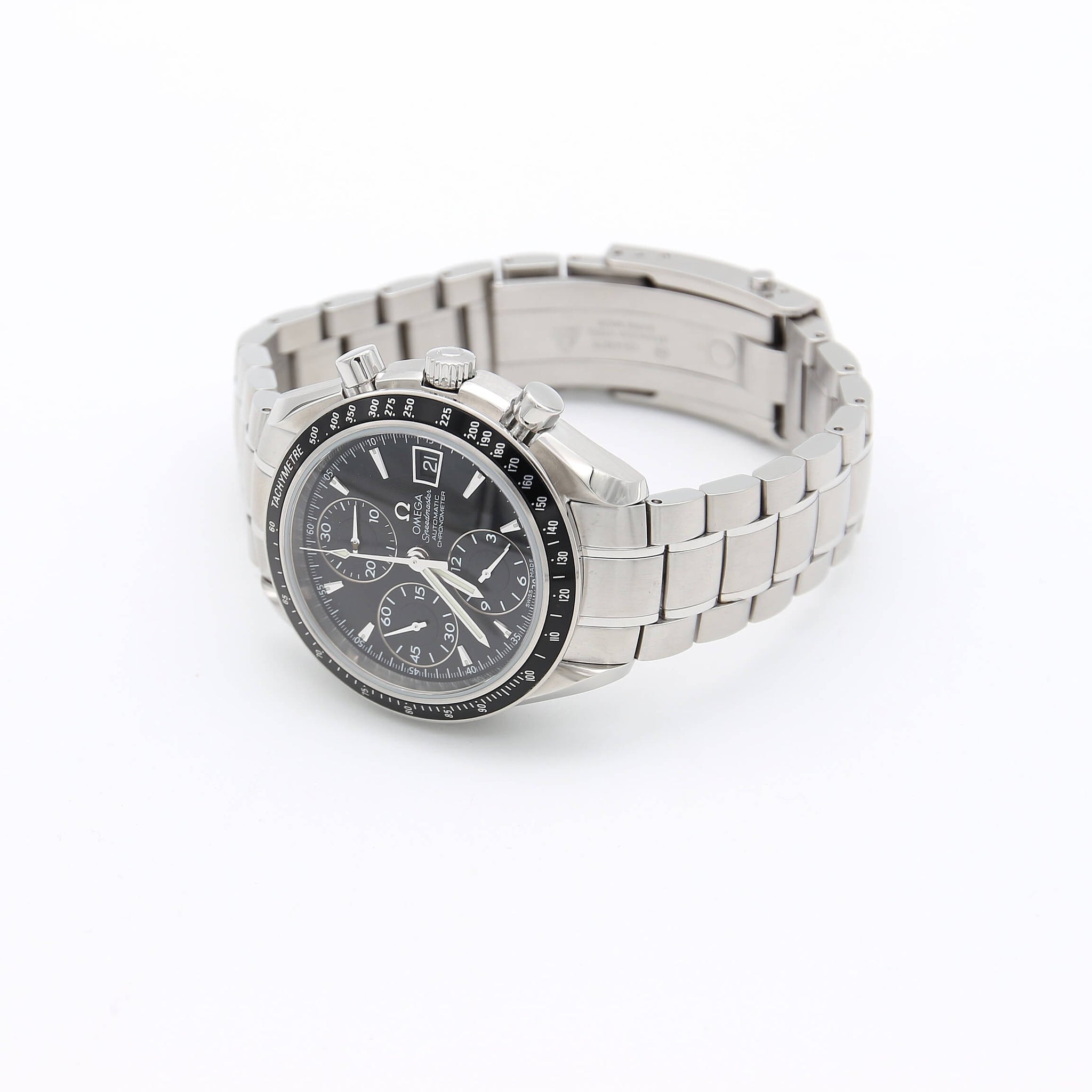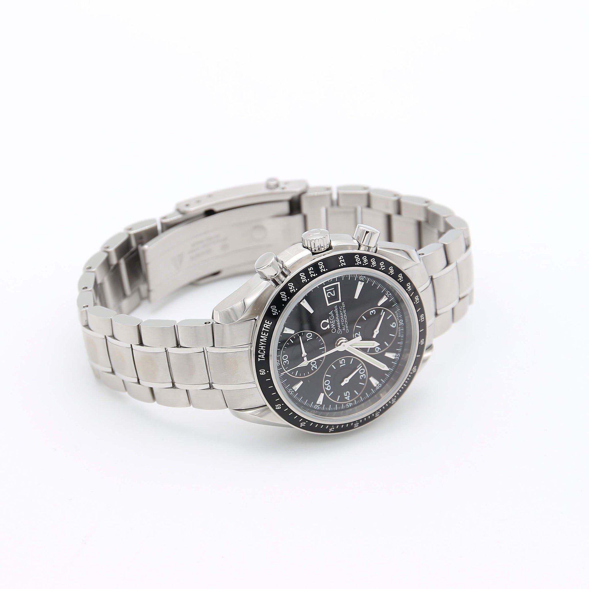 The Omega Speedmaster Date Automatic 3210.50 is encased in 40mm of stainless steel surrounding a black dial on a stainless steel bracelet.