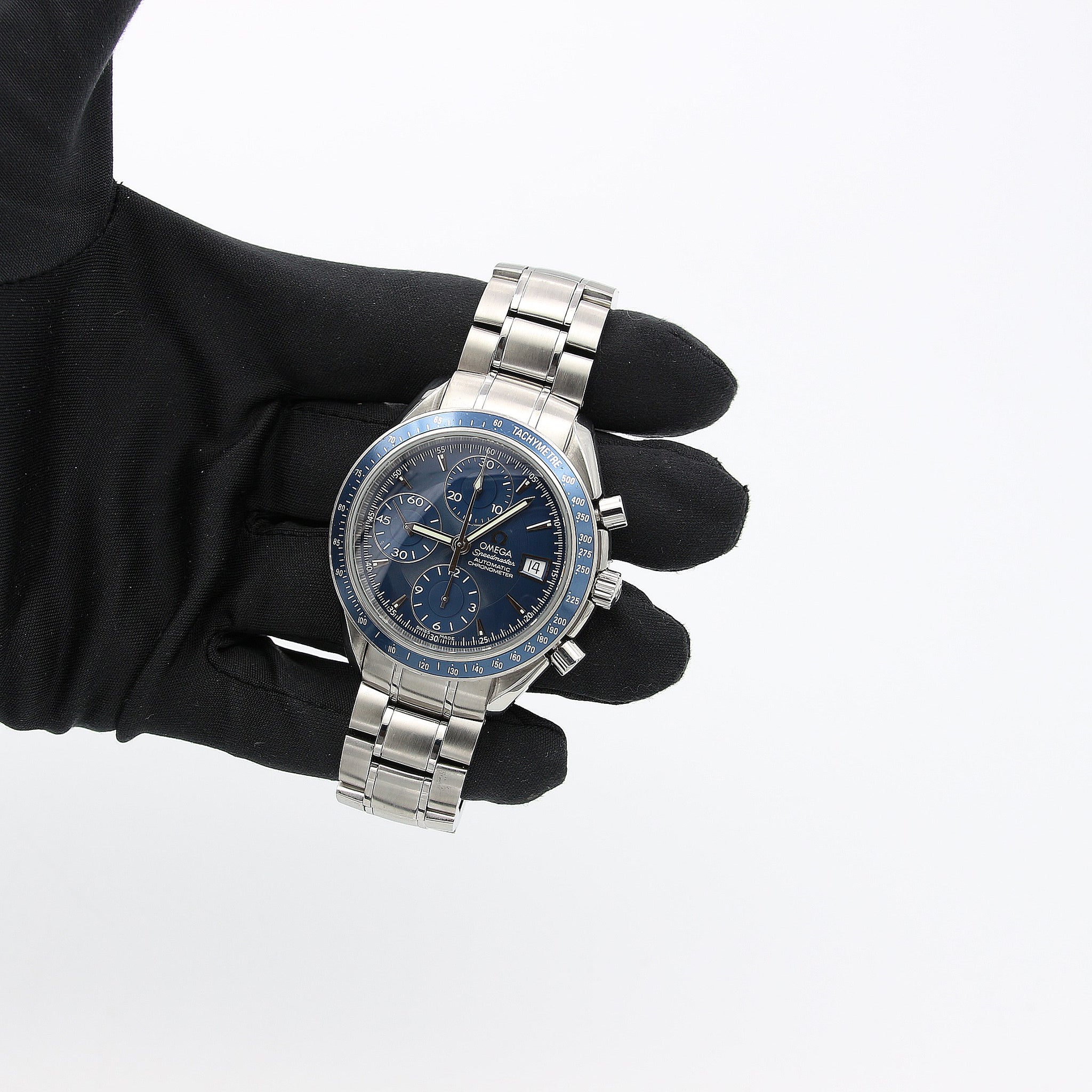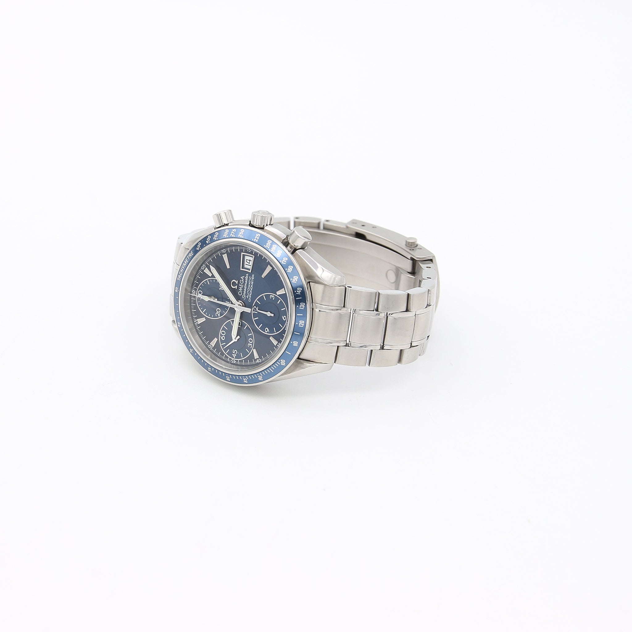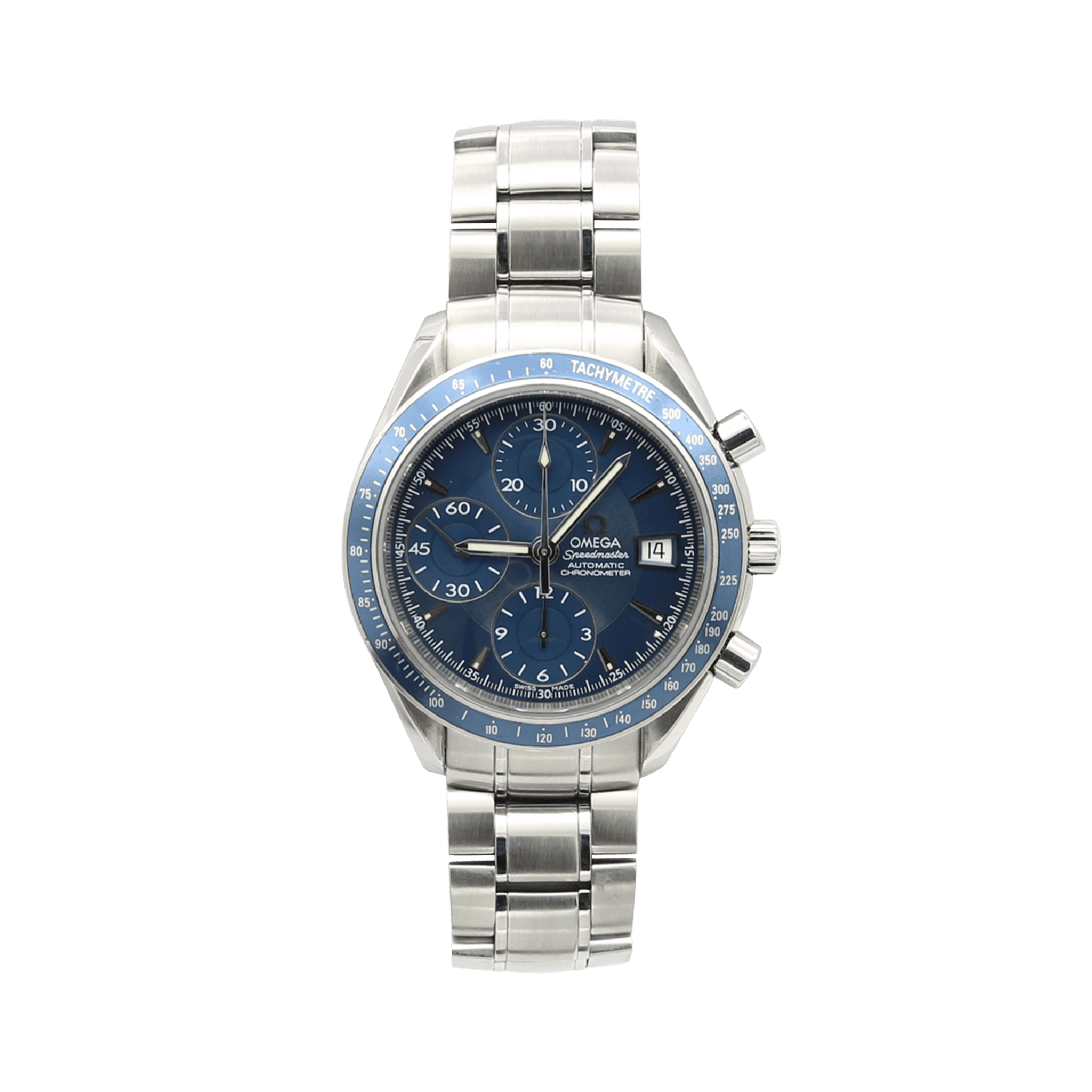 Die Omega Speedmaster Date Automatic hat ein 39-mm-Gehäuse aus Edelstahl, das ein blaues Zifferblatt auf Edelstahl umgibt Armband mit einer erstaunlichen blauen Lünette.