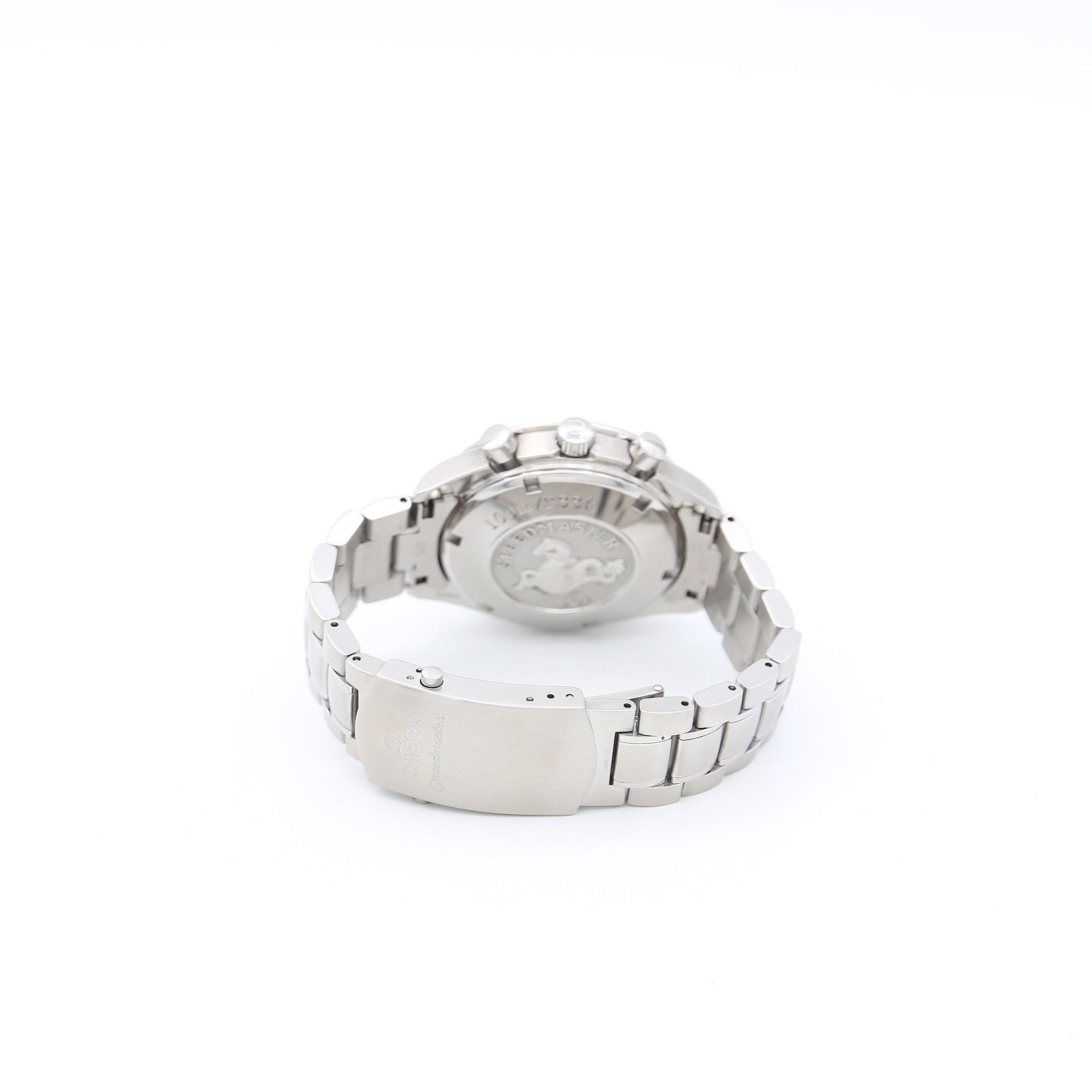 Zu den Funktionen dieser Omega Speedmaster gehören Stunden, Minuten, Sekunden, Chronograph und Datum.