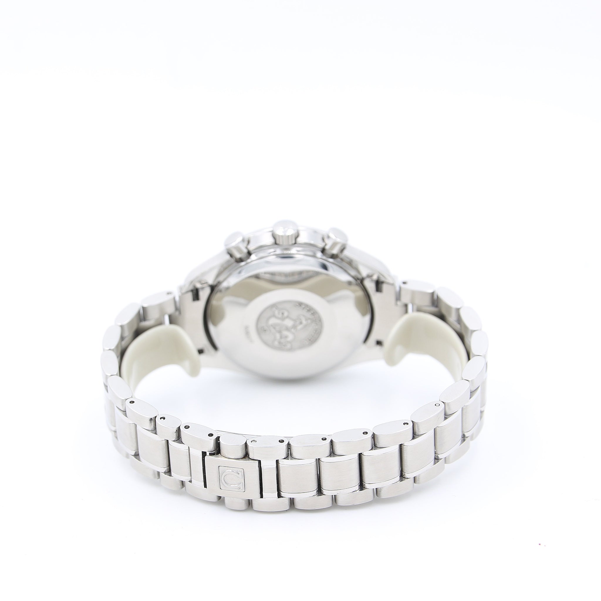 Diese Omega-Chronographenuhr hat ein 39-mm-Gehäuse aus Edelstahl mit einer wunderschönen silbernen Ästhetik und einer Dicke von 14,3 mm, was ihr einen sehr traditionellen Chronographen-Look für Herren verleiht.