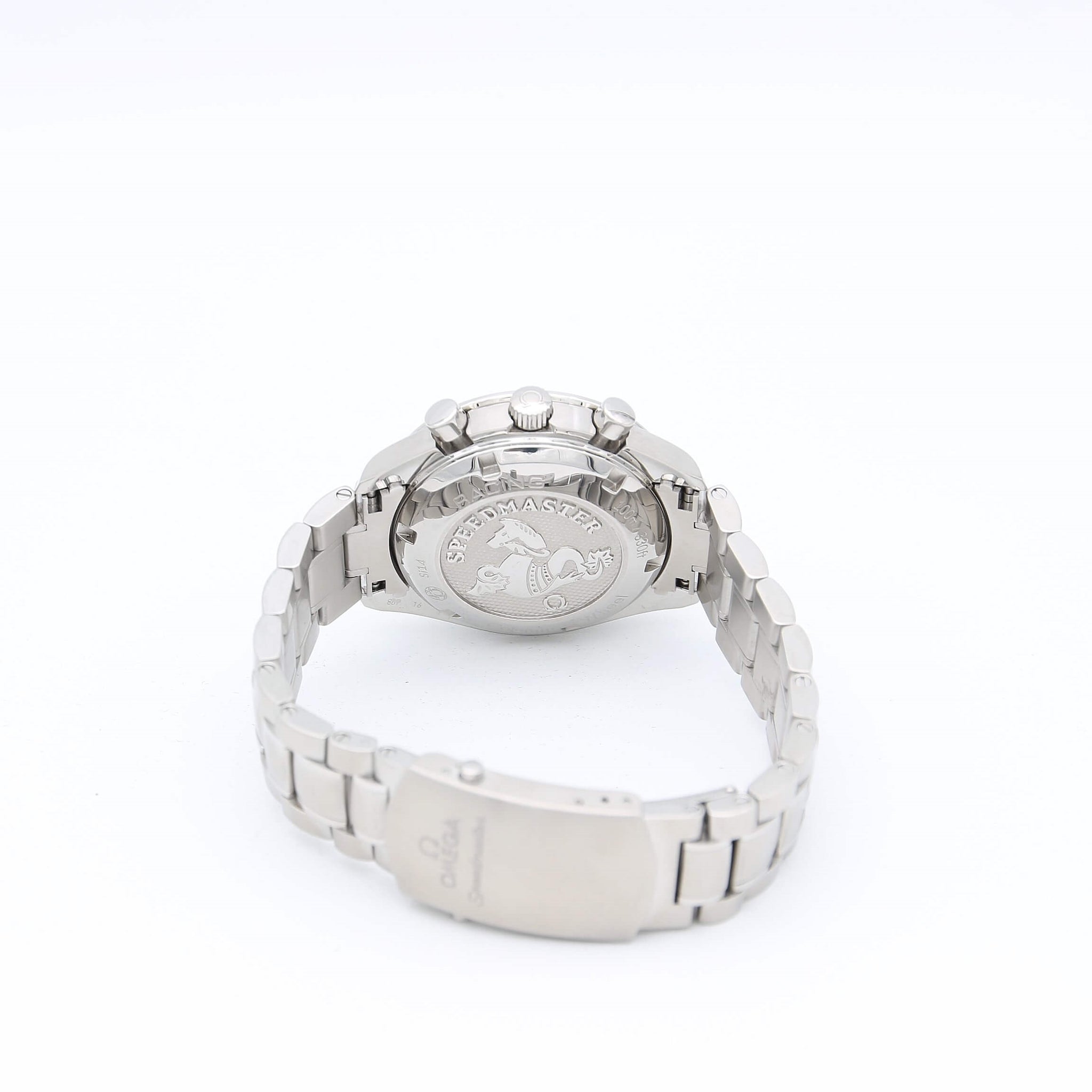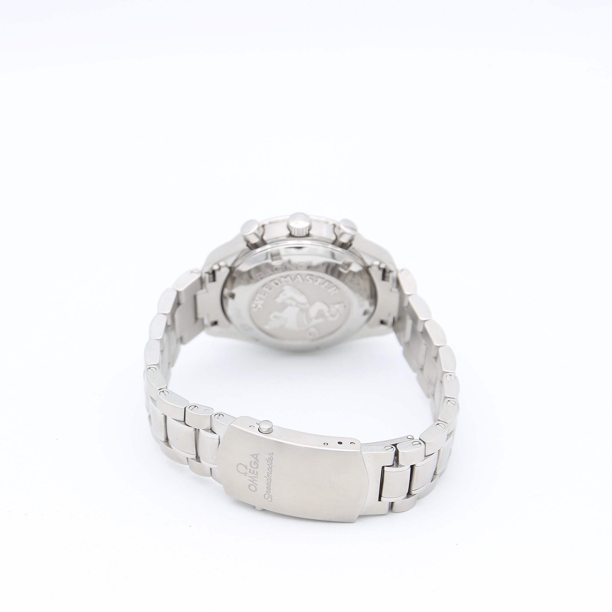 The stainless steel case measures 40 mm in diameter by 15.05 mm in height and has the signature Speedmaster shape.