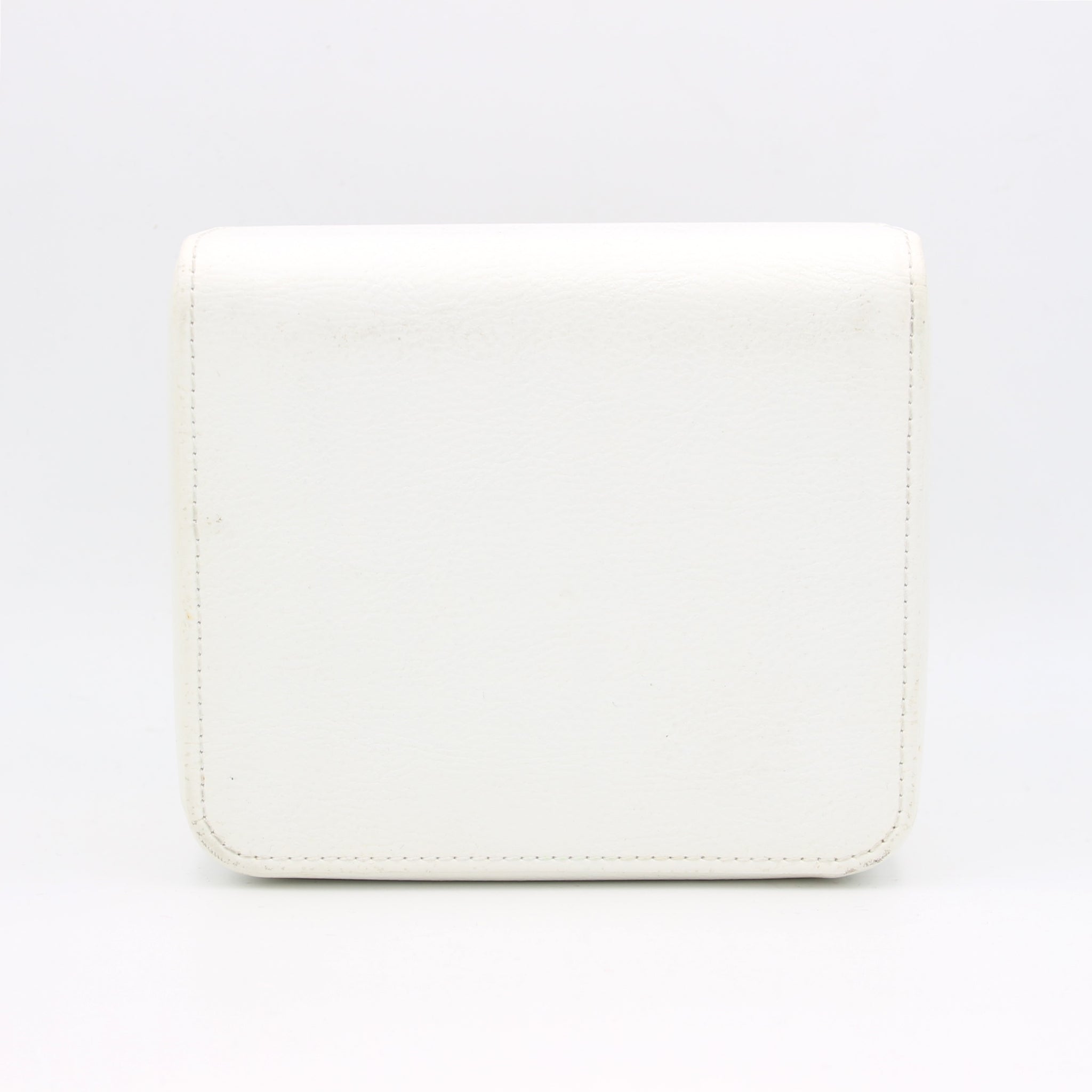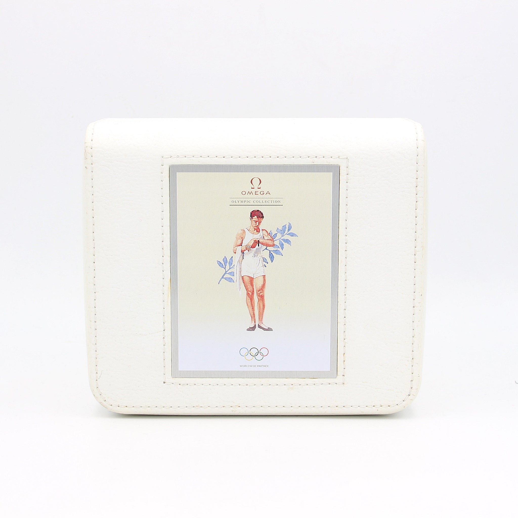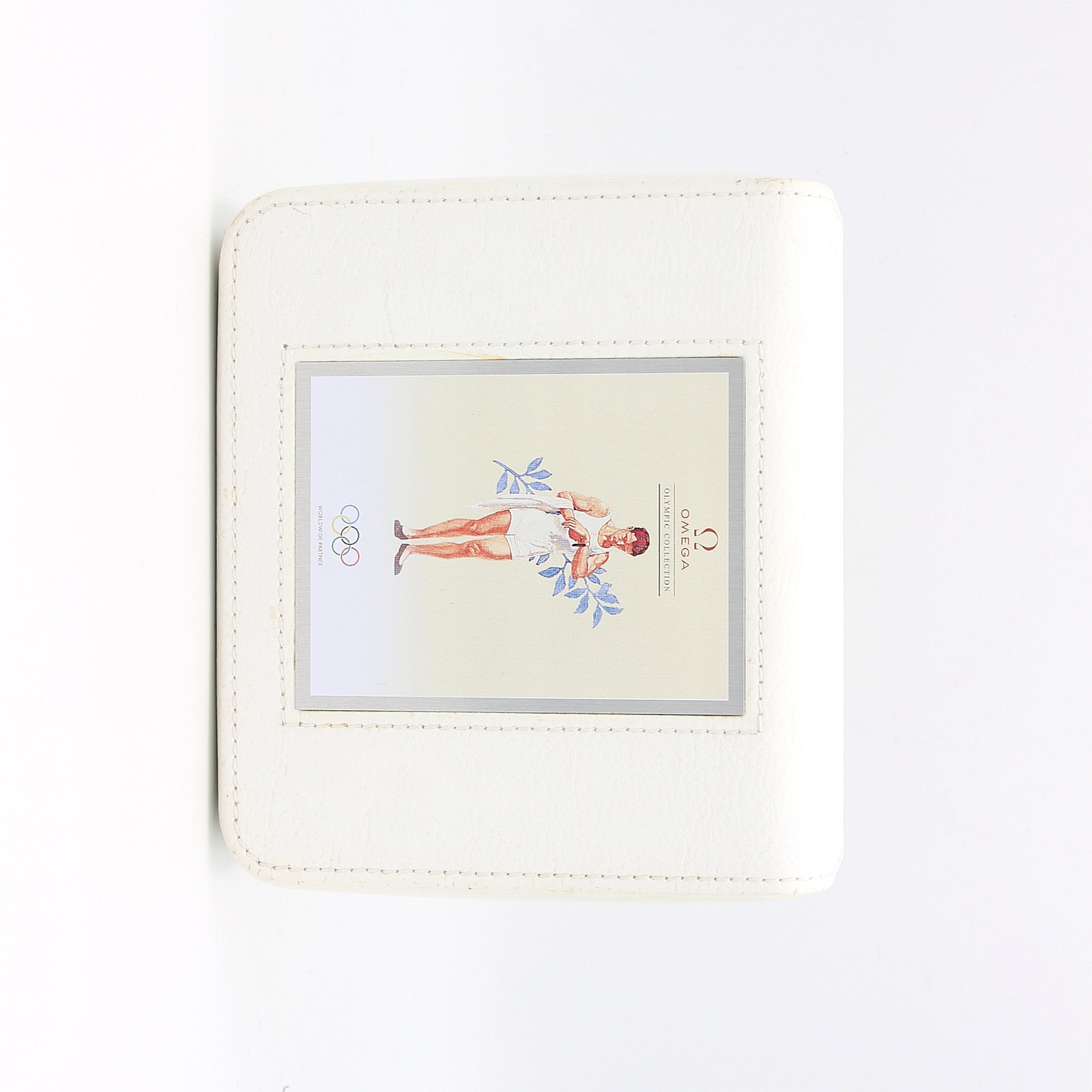 Omega box for single watch, outside in white leather with drawn details of Olympic games (Speedmaster Olympic collection).