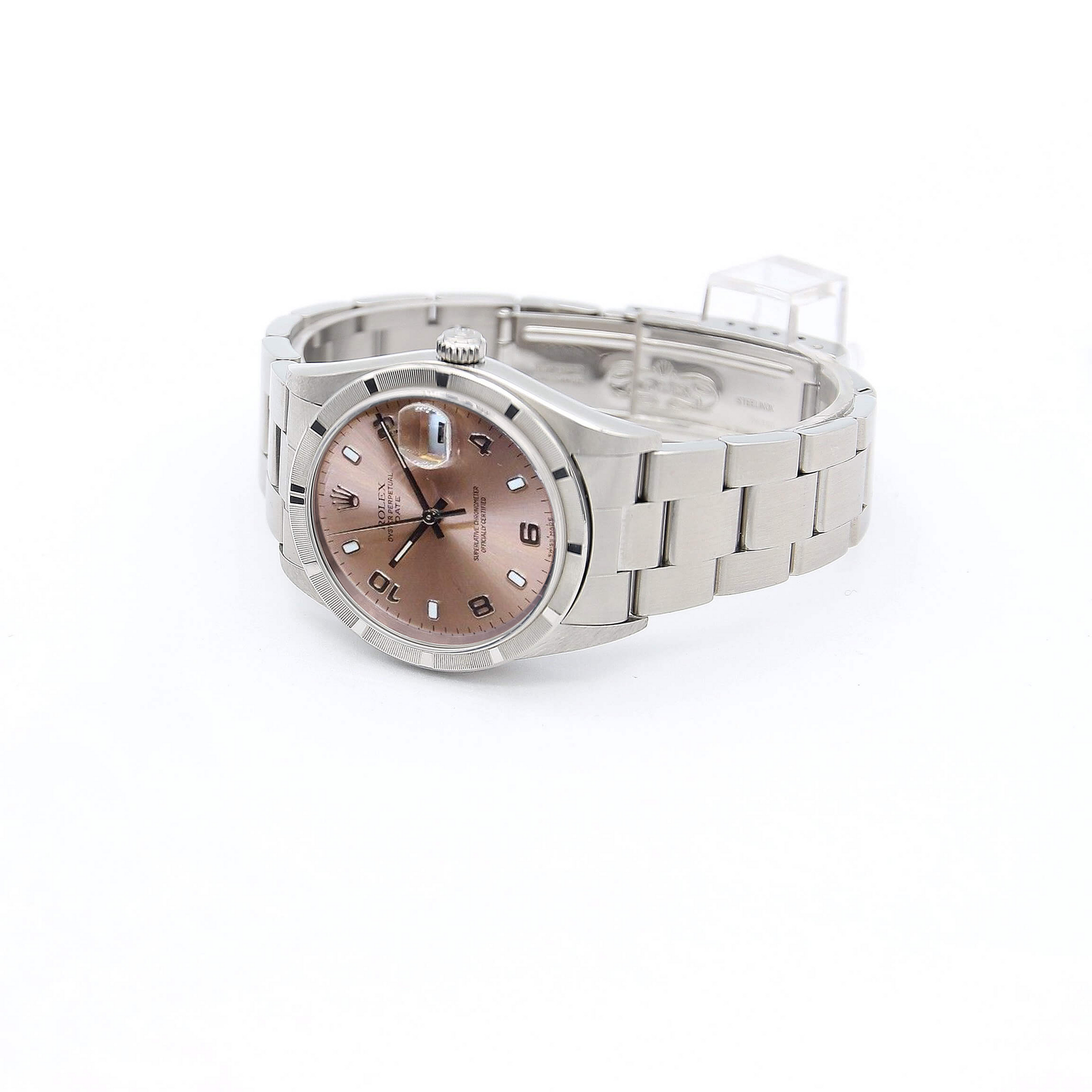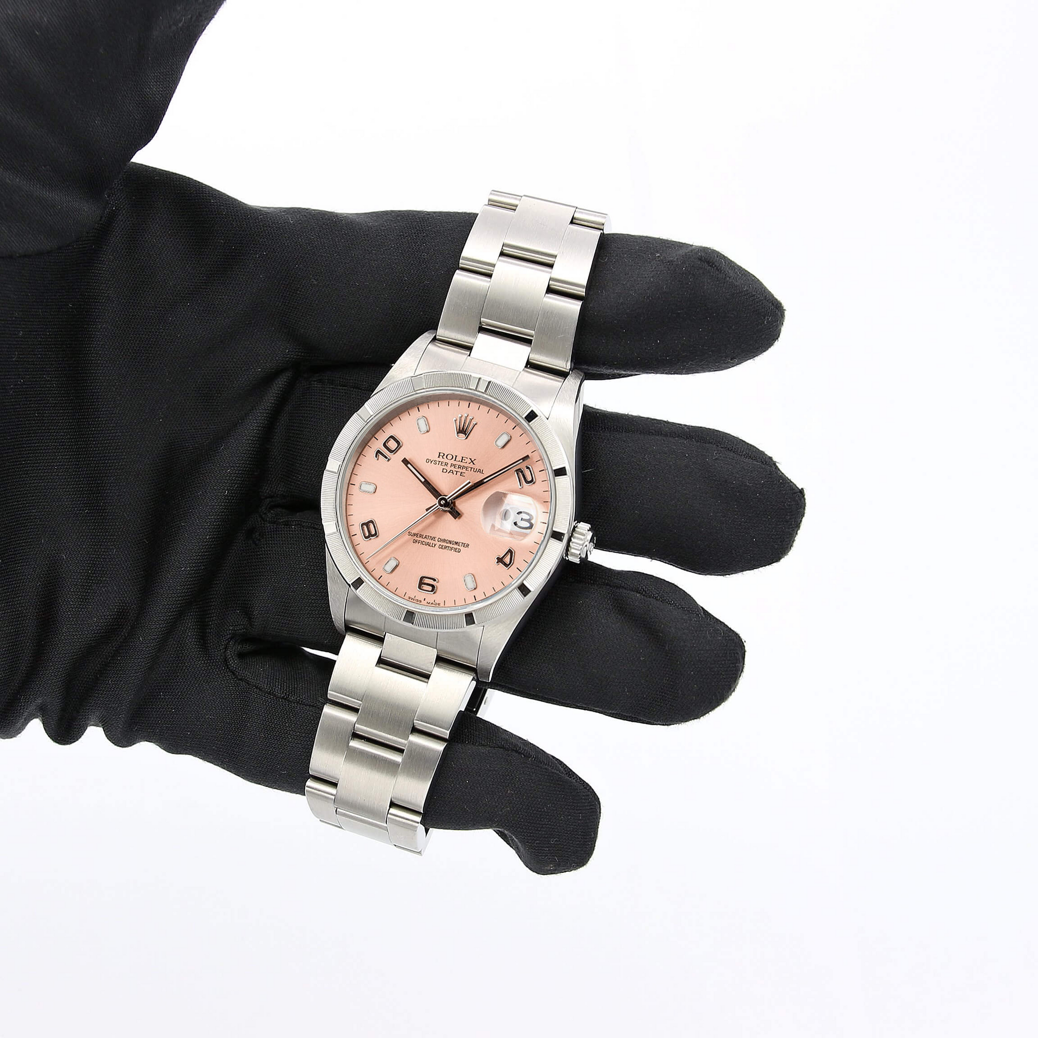 Zu verkaufen: gebrauchte Rolex Date Ref. 15210 mit lachsfarbenem Zifferblatt mit arabischen Ziffern, an einem Oyster-Armband, komplettes Set.