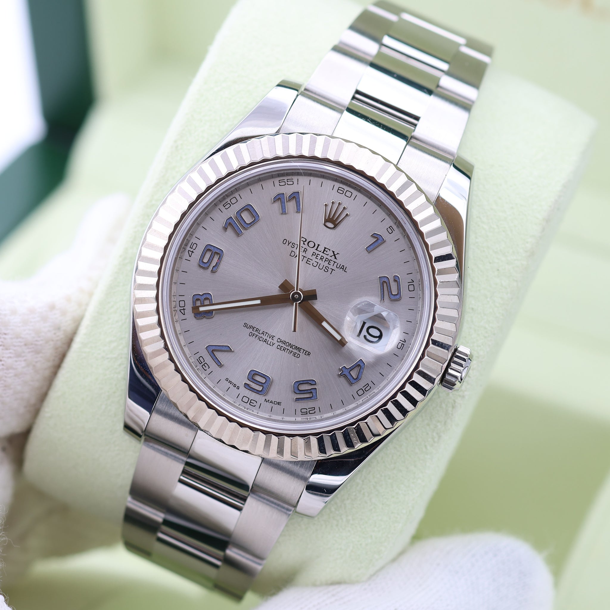 Zu verkaufen bei Debonar Watches: gebraucht Rolex Datejust II Ref. 116334 Komplettset, mit A modernes silbernes und blaues Zifferblatt mit arabischen Zahlen.