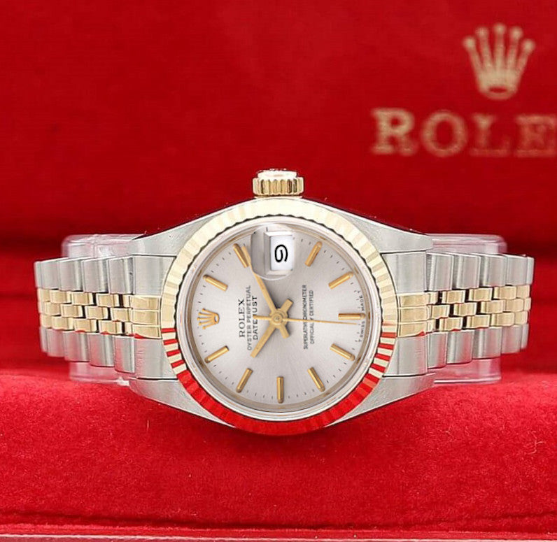 Dieses 26-mm-Modell hat ein Edelstahlgehäuse mit einer geriffelten Lünette aus 18 Karat Gelbgold und einem zweifarbigen Jubilee-Armband. Das Zifferblatt Geschenke ein Datumsfenster bei 3 Uhr unter einer Zykloplupe.
