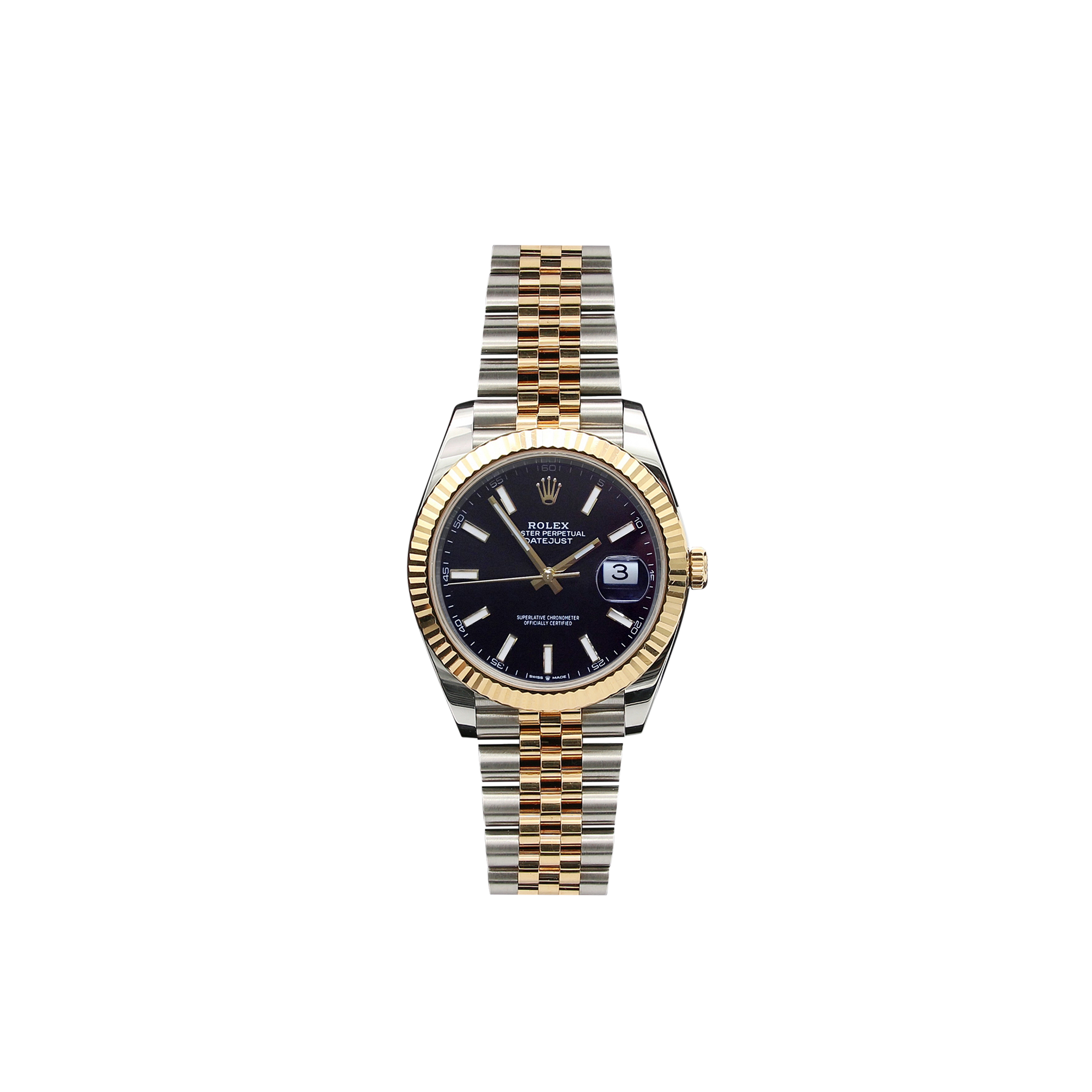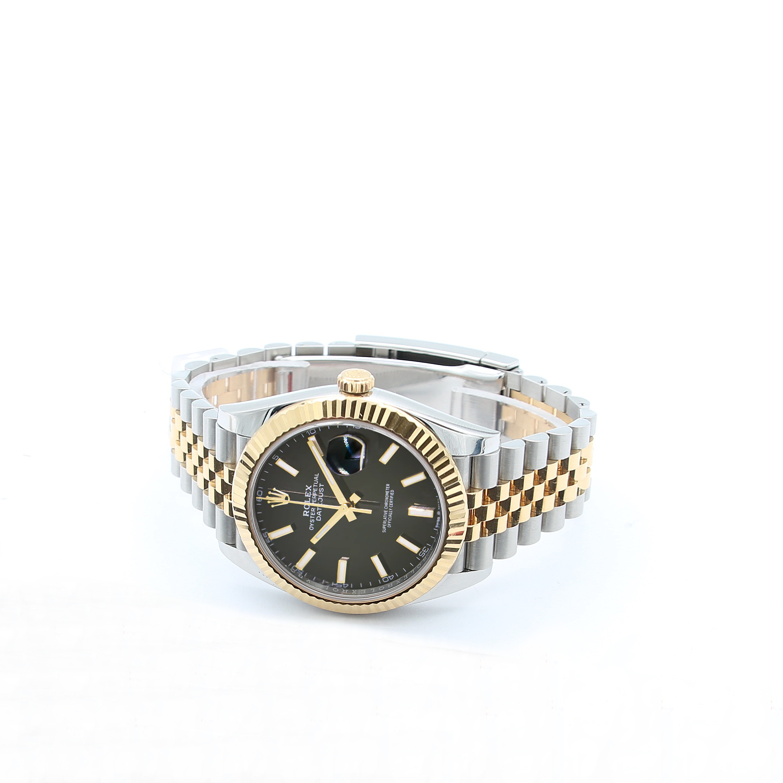 Diese Datejust kommt mit einer geriffelten Lünette aus Edelstahl und Gelbgold (tDas bekannteste Merkmal der Rolex Datejust ist ihr 41-mm-Gehäuse aus Gelbgold.