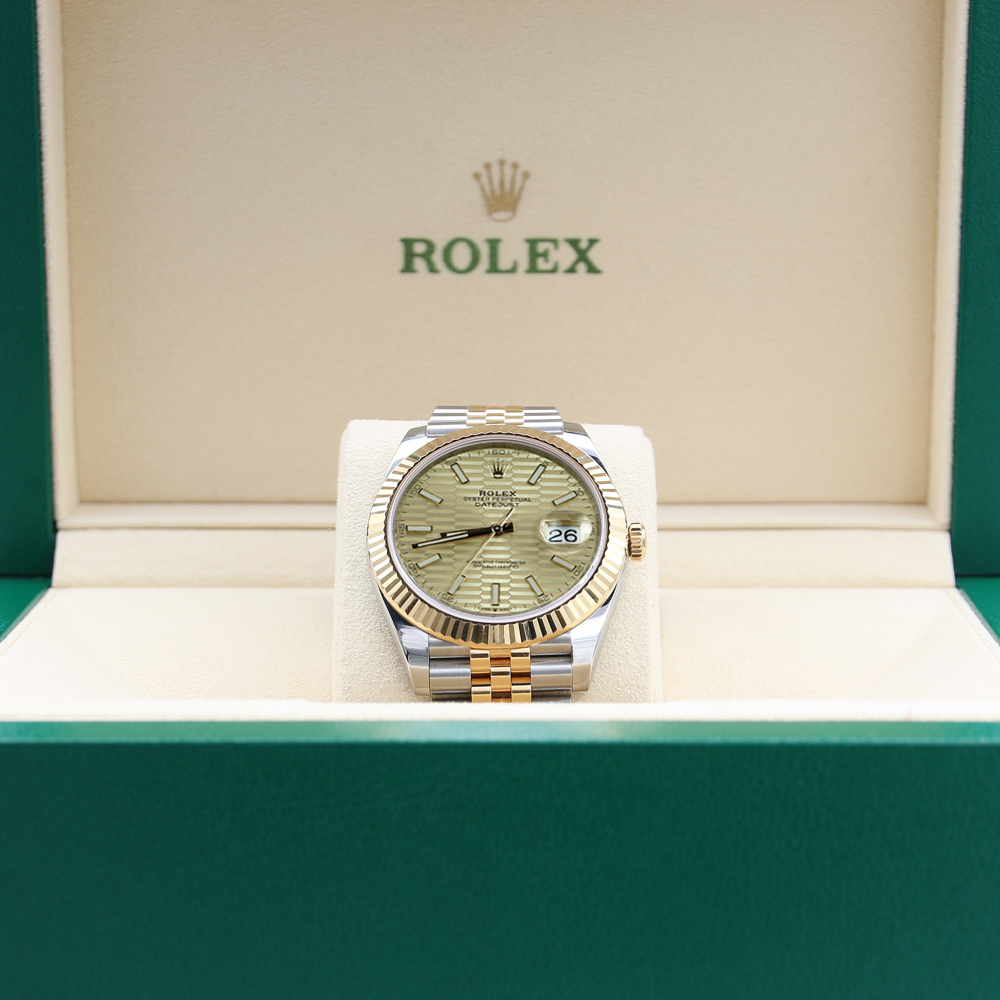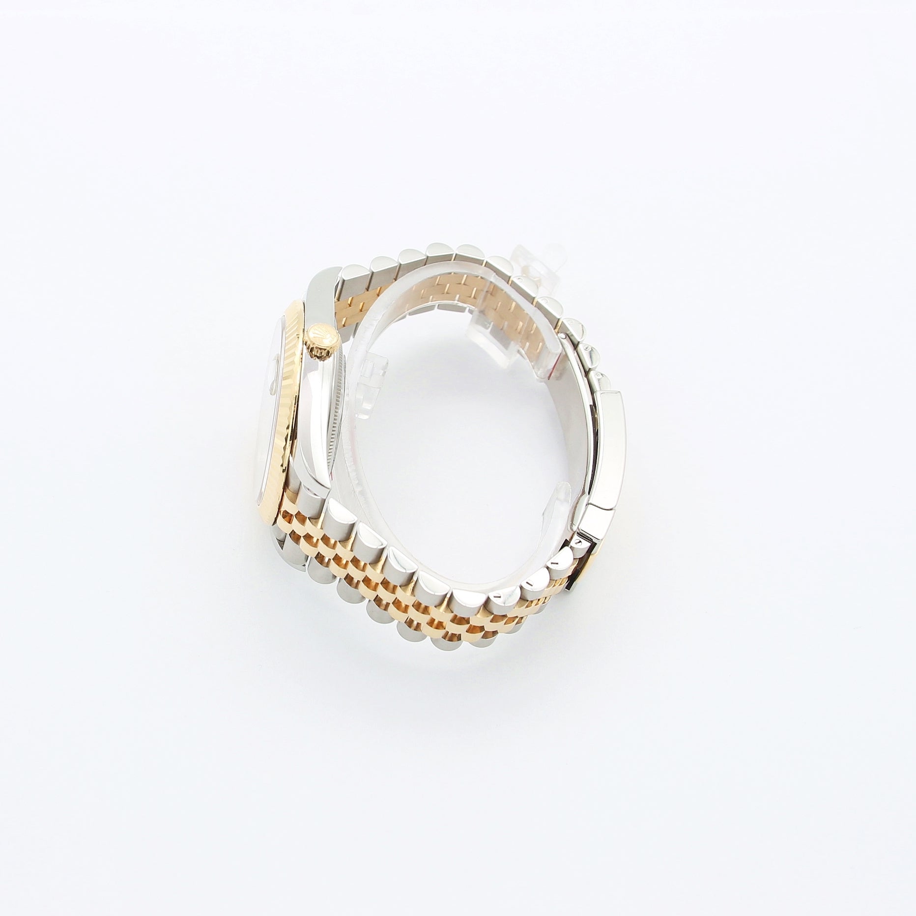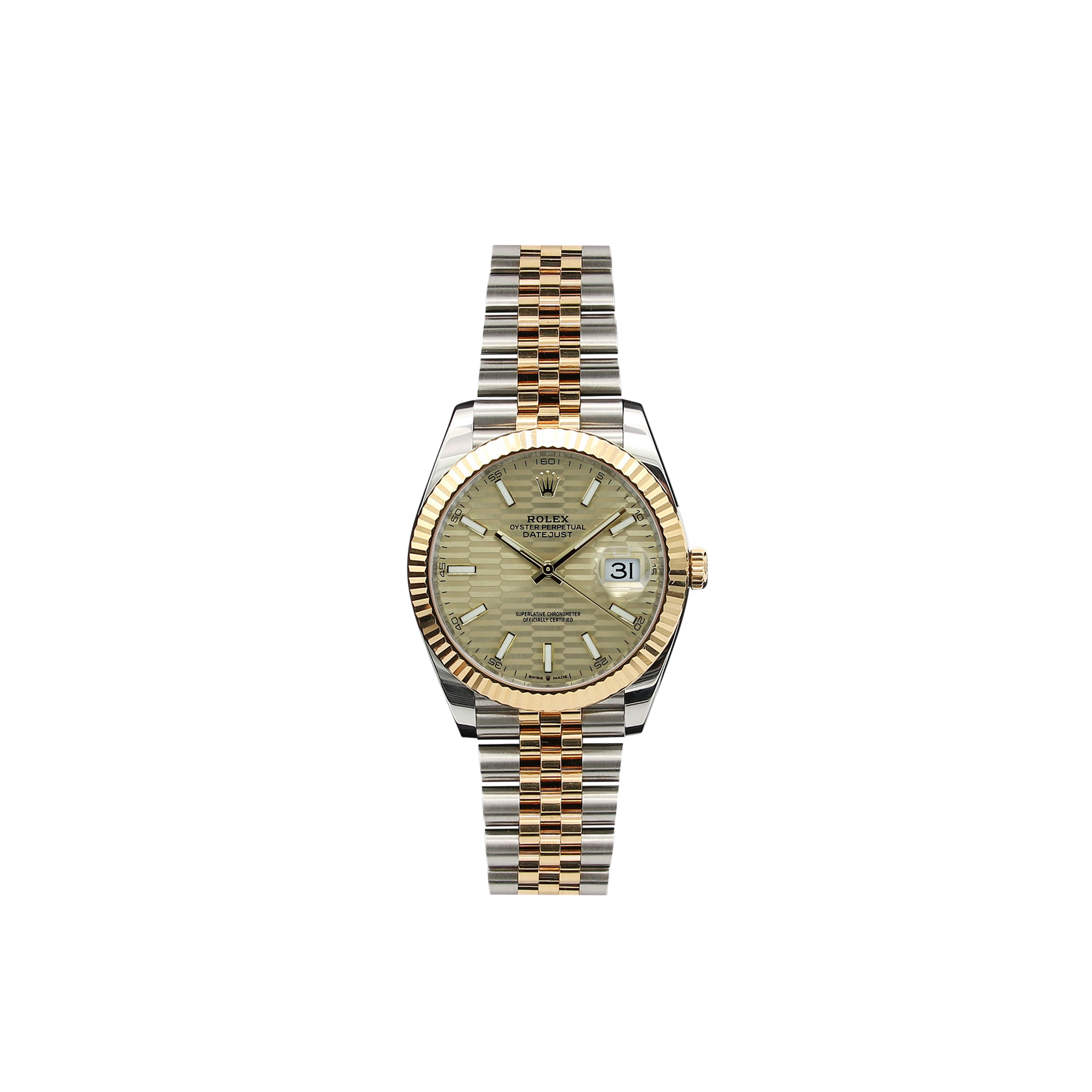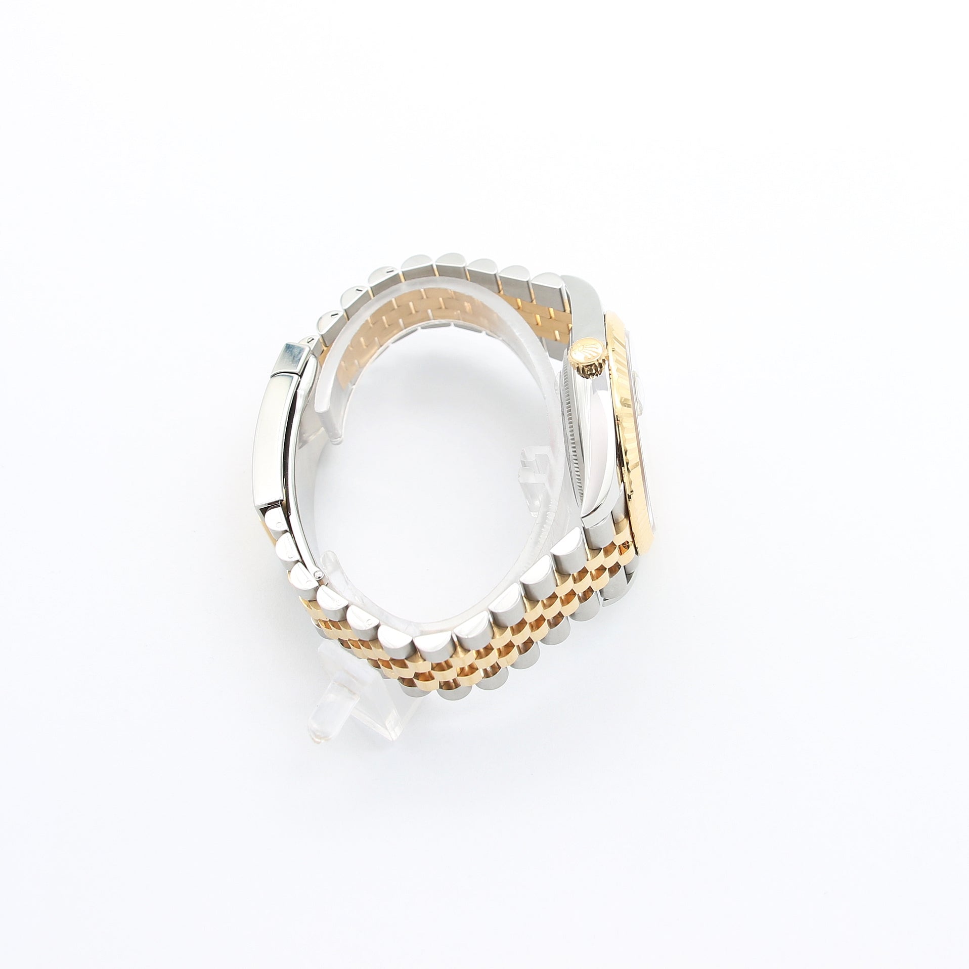Diese Datejust kommt mit einer geriffelten Lünette aus Edelstahl und Gelbgold (tDas bekannteste Merkmal der Rolex Datejust ist ihr 41-mm-Gehäuse aus Gelbgold.