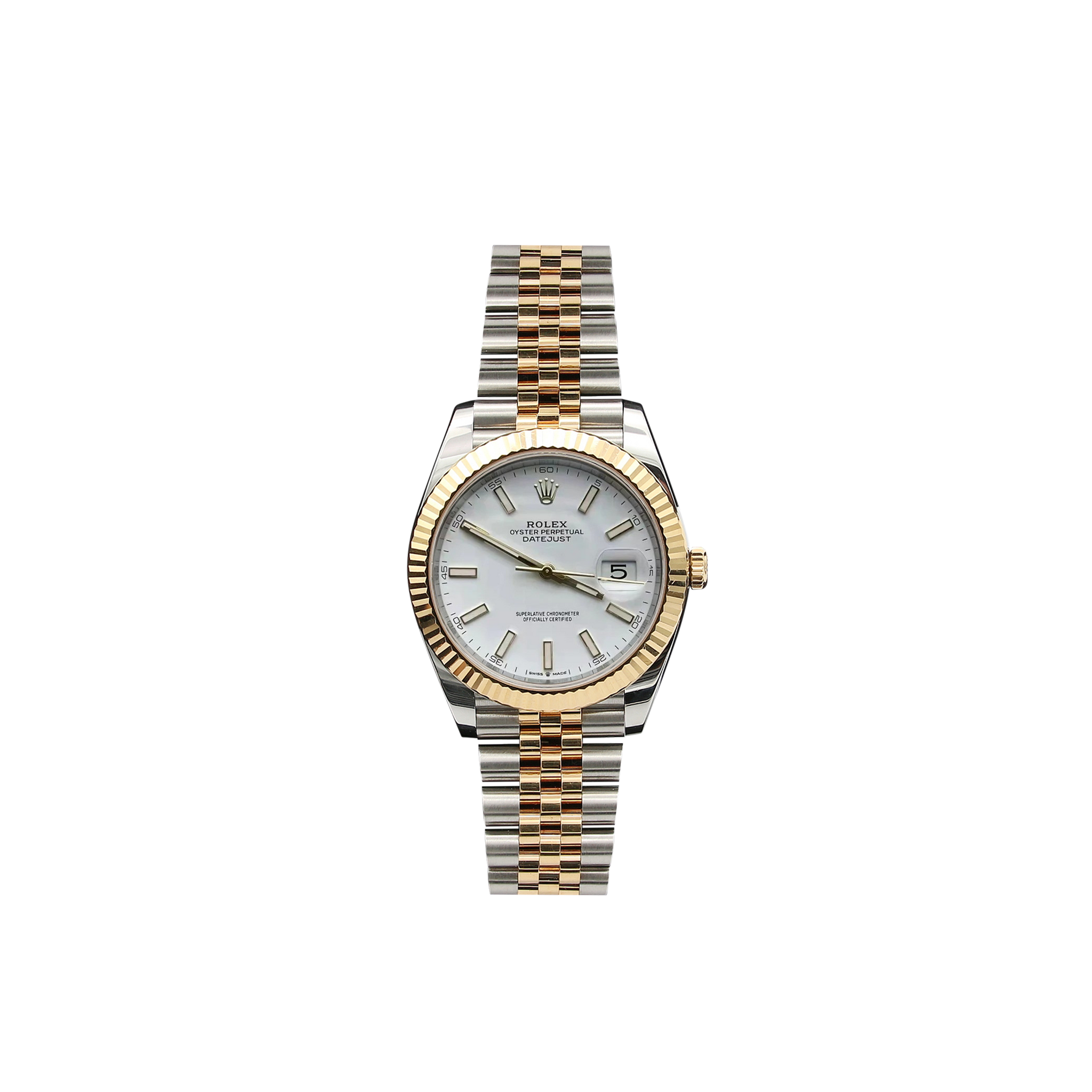 Zu verkaufen bei Debonar Watches: gebrauchte Rolex Datejust Ref. 126333, komplettes Set, mit klassischem weißem Zifferblatt und Jubilee-Armband aus Edelstahl und Gelbgold.