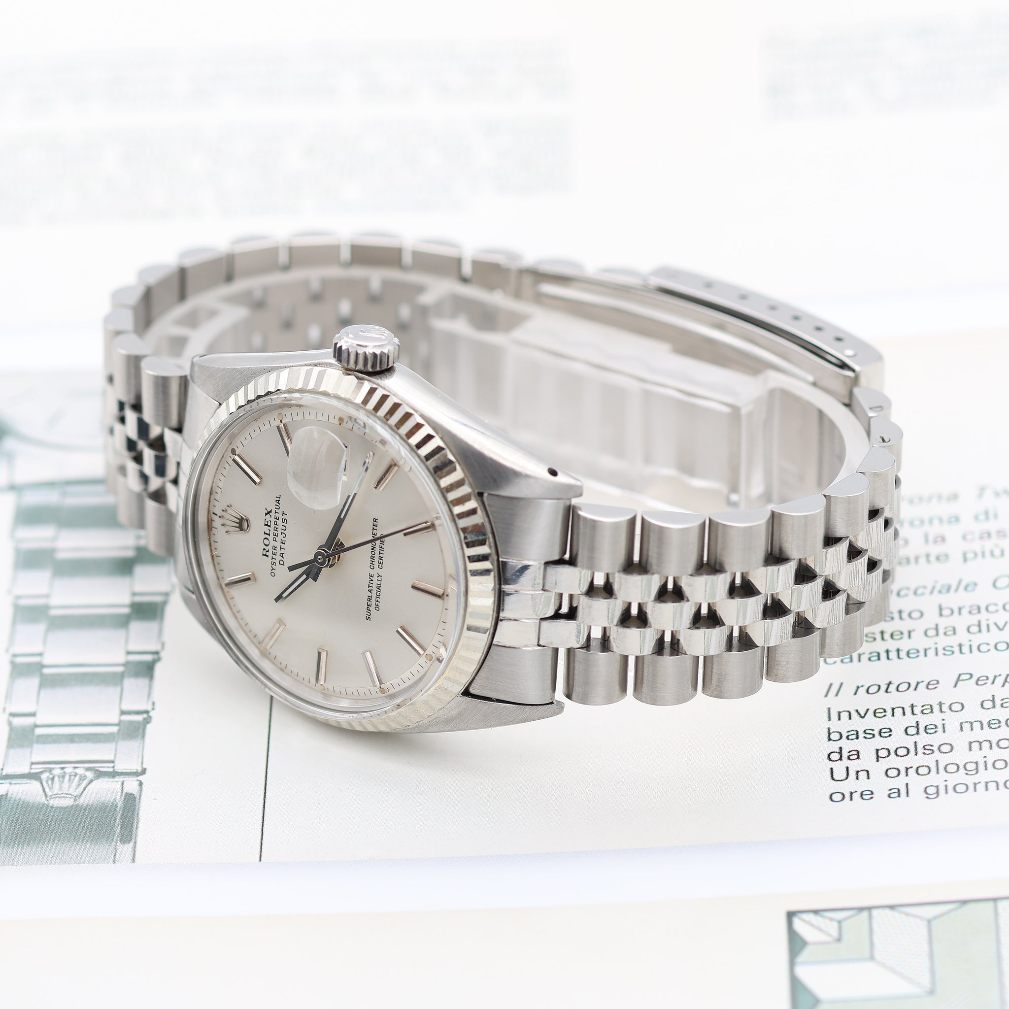 Zu verkaufen bei Debonar Watches: gebrauchte Rolex Datejust Ref. 1601 aus Stahl Und Weißgold, mit einem prächtiges silbernes Zifferblatt.