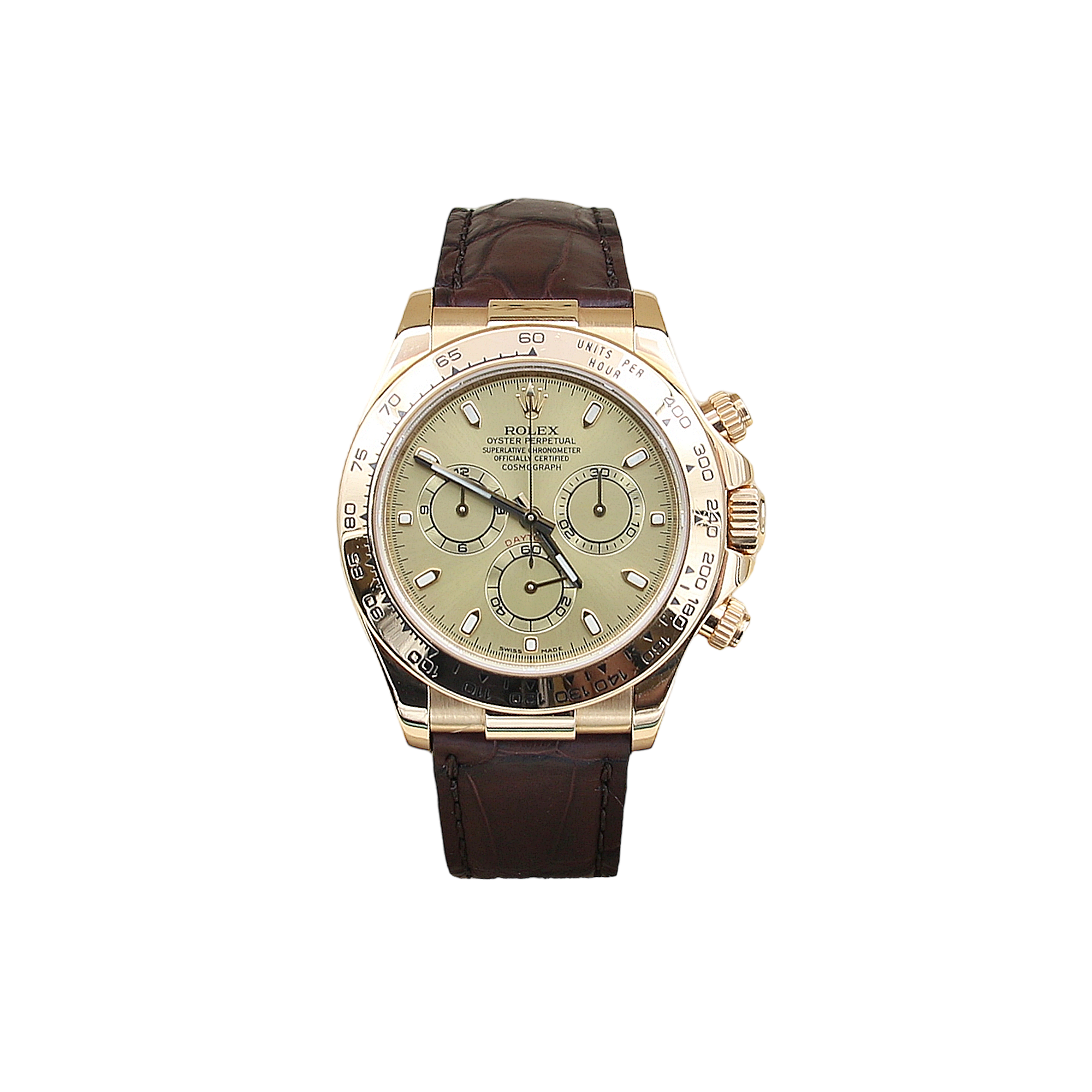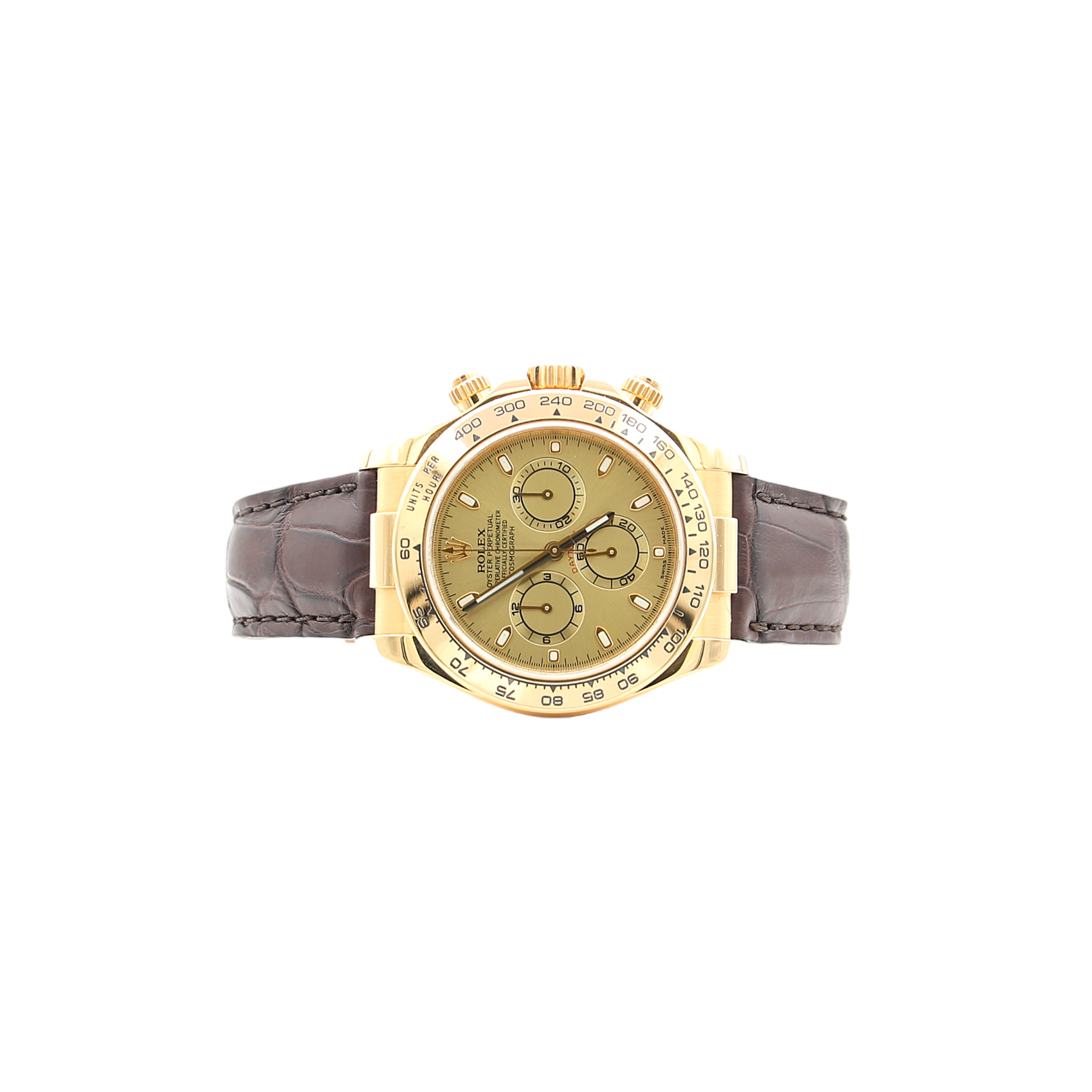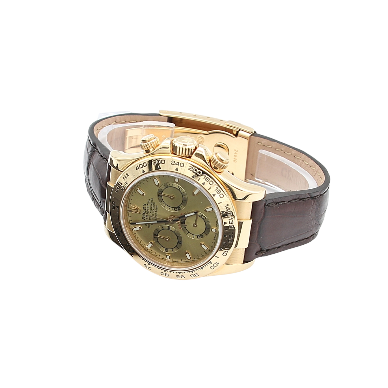 Die 116518 ist mit einem 40mm Gelbgoldgehäuse ausgestattet, Lederband, Gelbgold Lünette und Saphirglas.