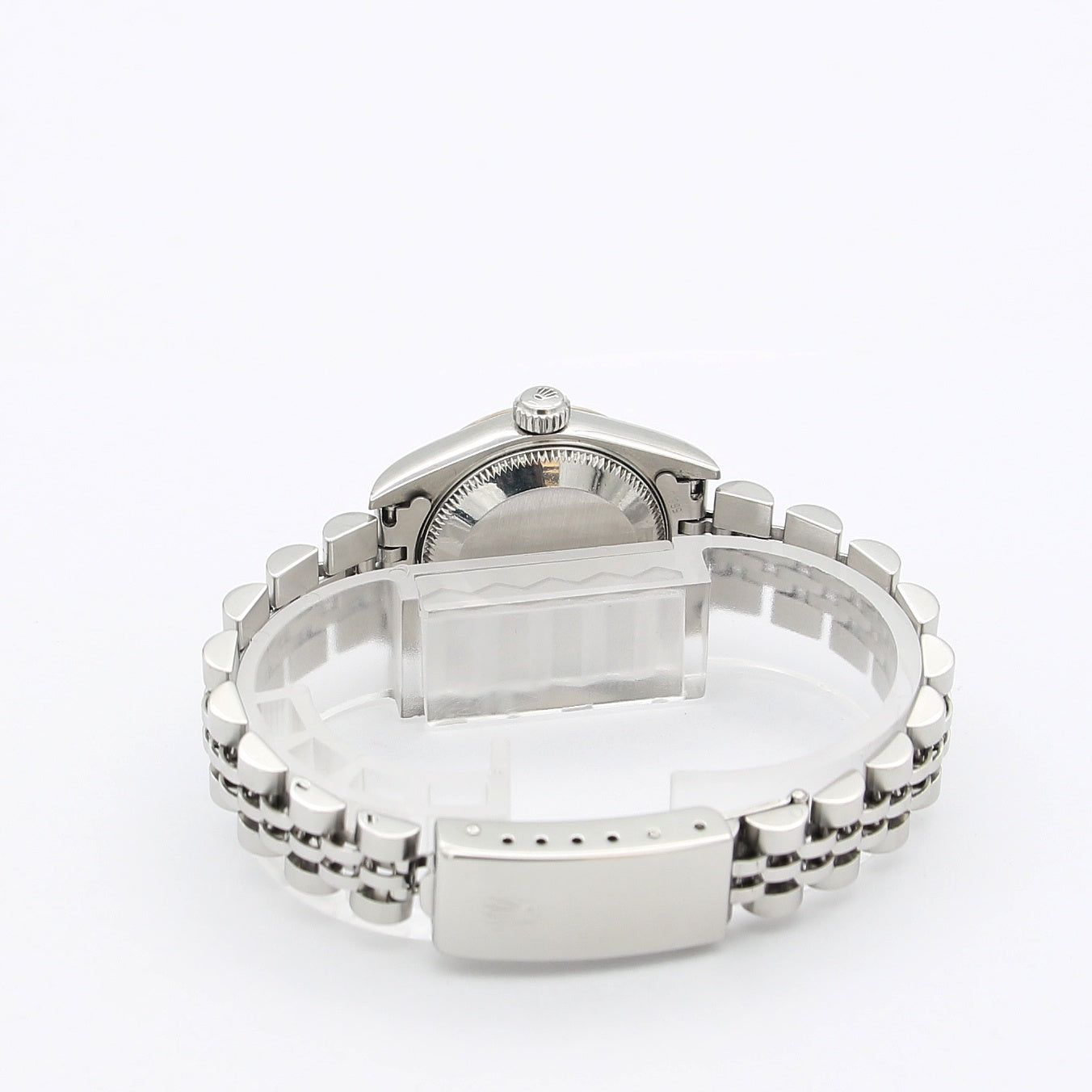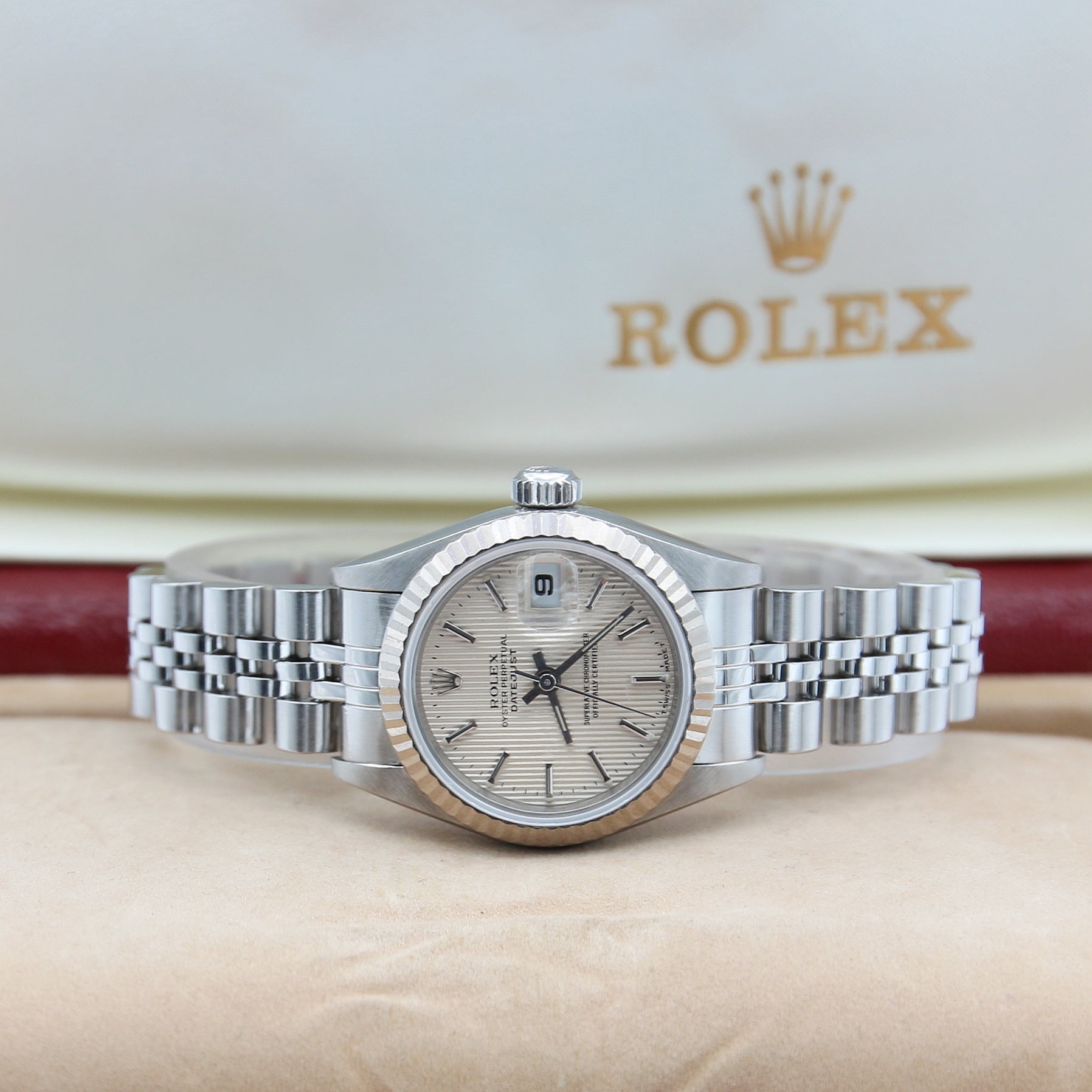 Feine, wasserdichte Damenarmbanduhr aus Edelstahl und 18 Karat Weißgold mit Zentralsekunde, Automatikaufzug und Datum sowie einem Rolex Oyster-Edelstahlarmband mit Faltschließe.