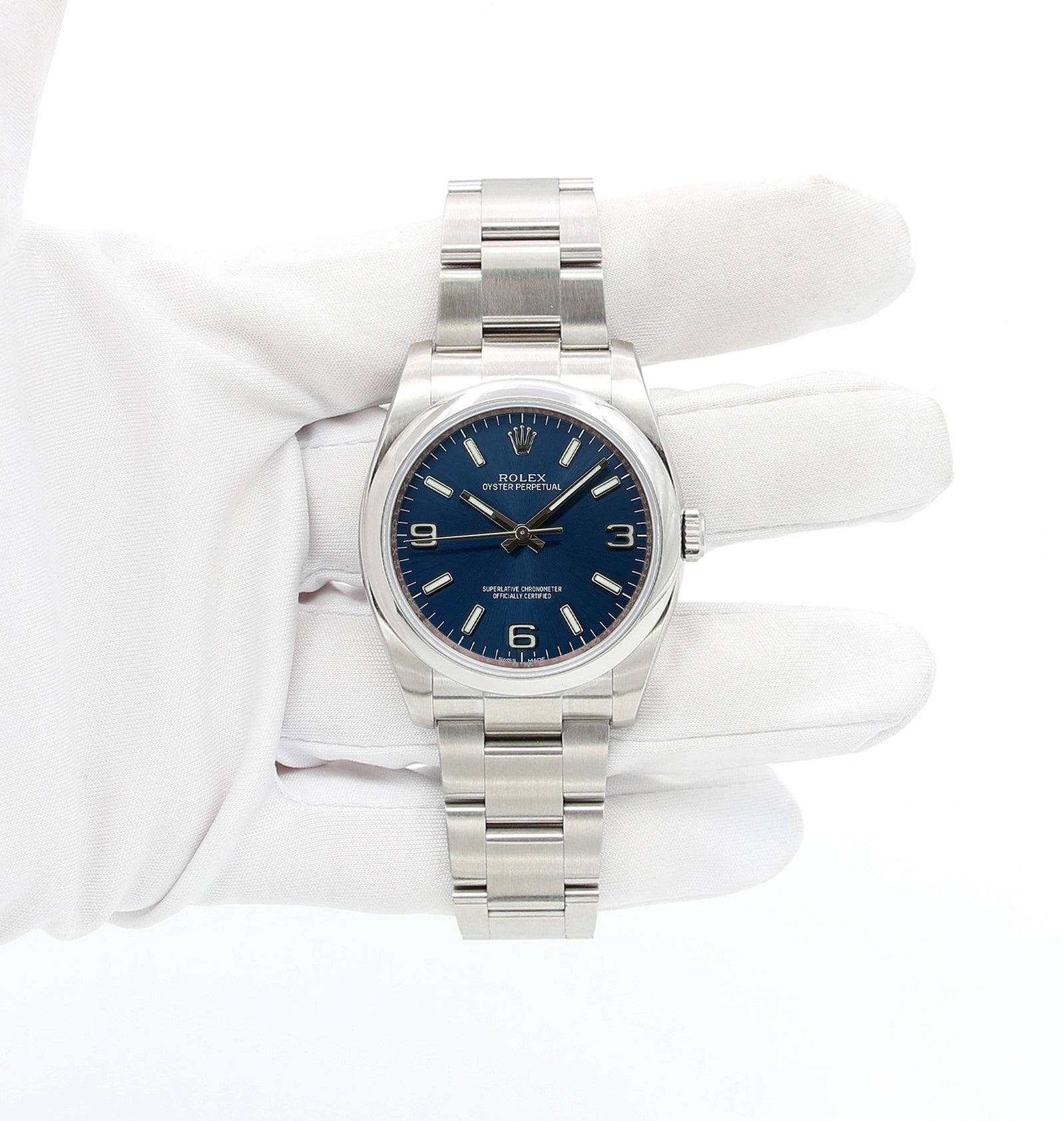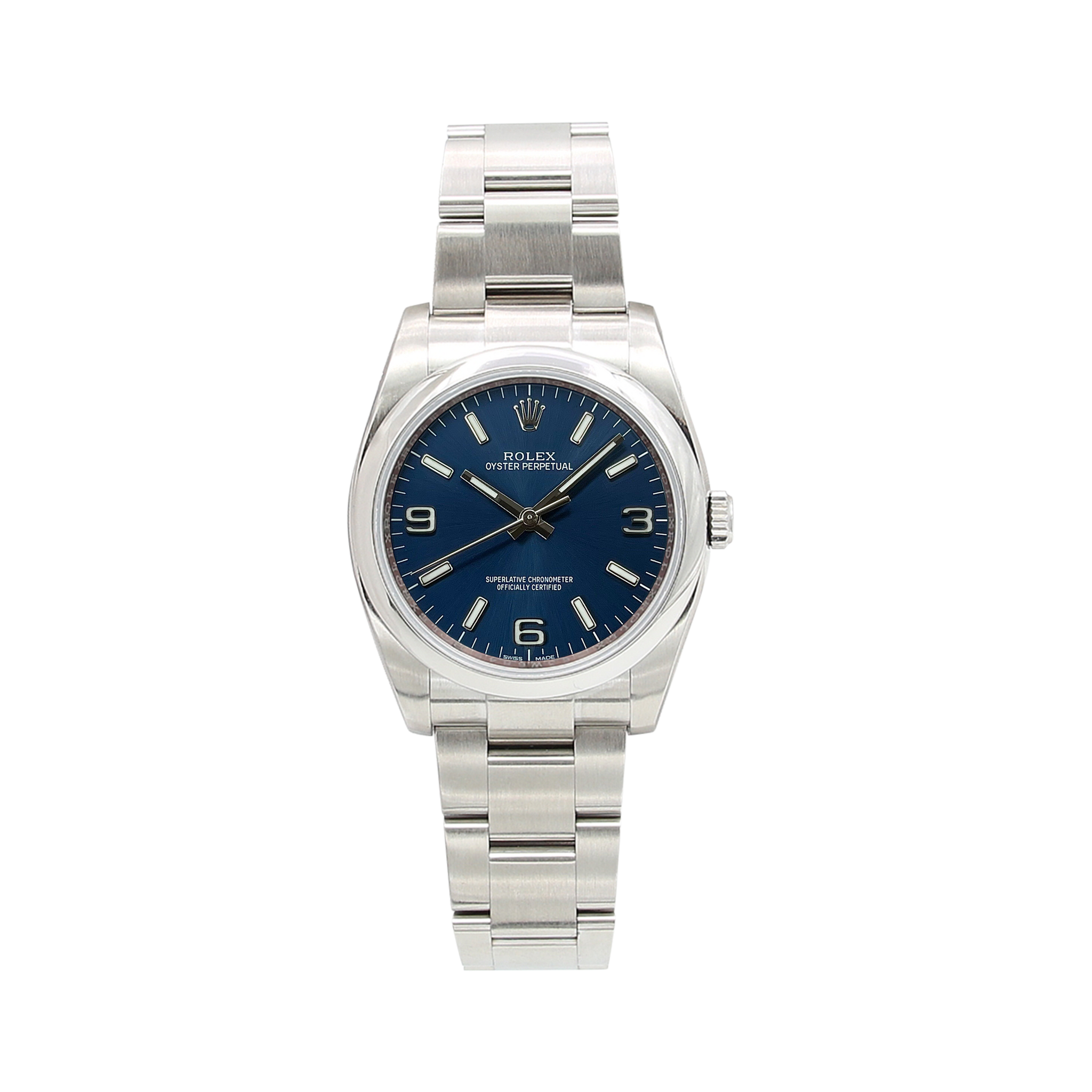 Die Rolex Oyster Perpetual 36 116000 ist in 36 mm Edelstahl eingefasst A faszinierendes blaues Arabisch Zifferblatt auf einem Oyster-Armband aus Edelstahl.