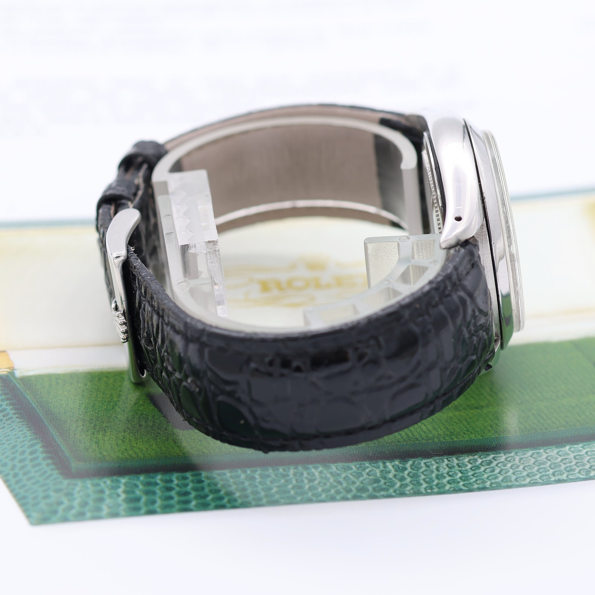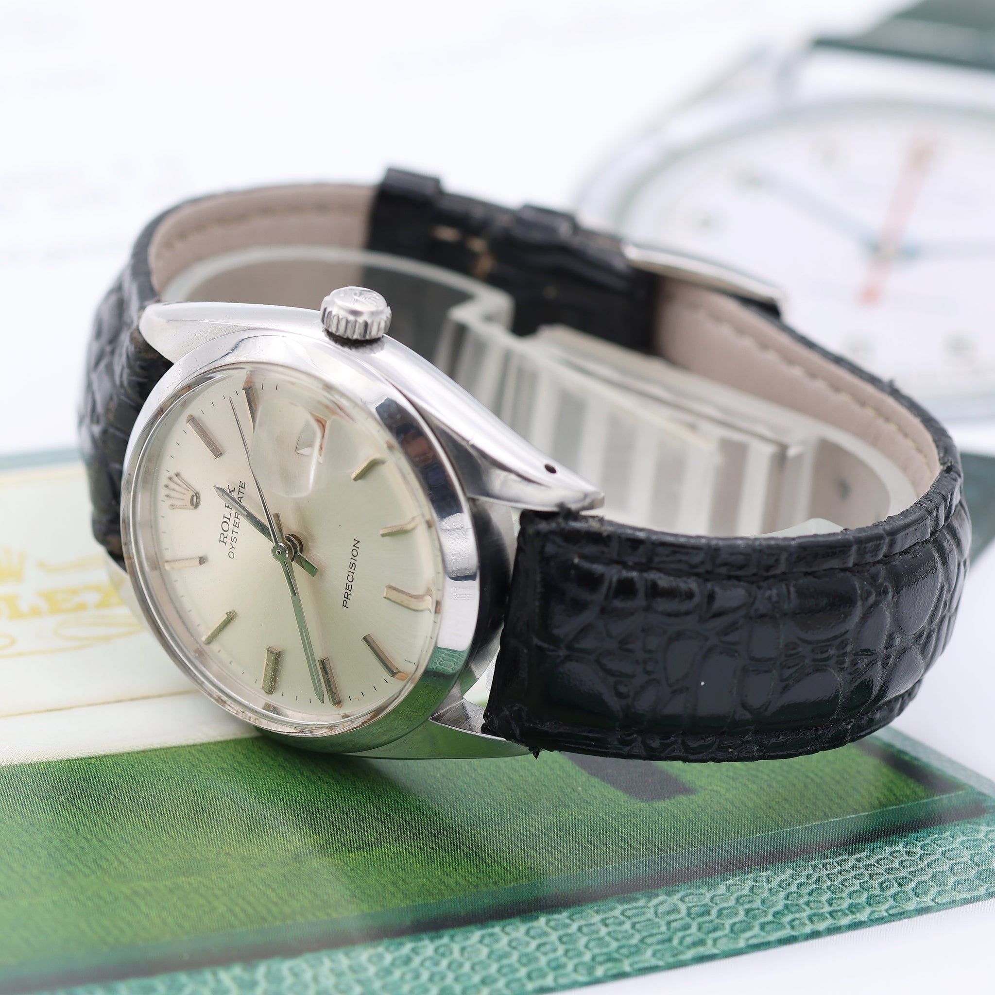 Der Präzision Modell war immer ein Vertreter der ROLEX Einstiegsklasse, mit kleinem Gehäuse, dem üblichen Auster Gehäuse mit dickem Plexiglas, das aus der Lünette herausragt, das sofort erkennbare Zyklopglas bei drei Uhr und ein Kaliber mit Handaufzug.