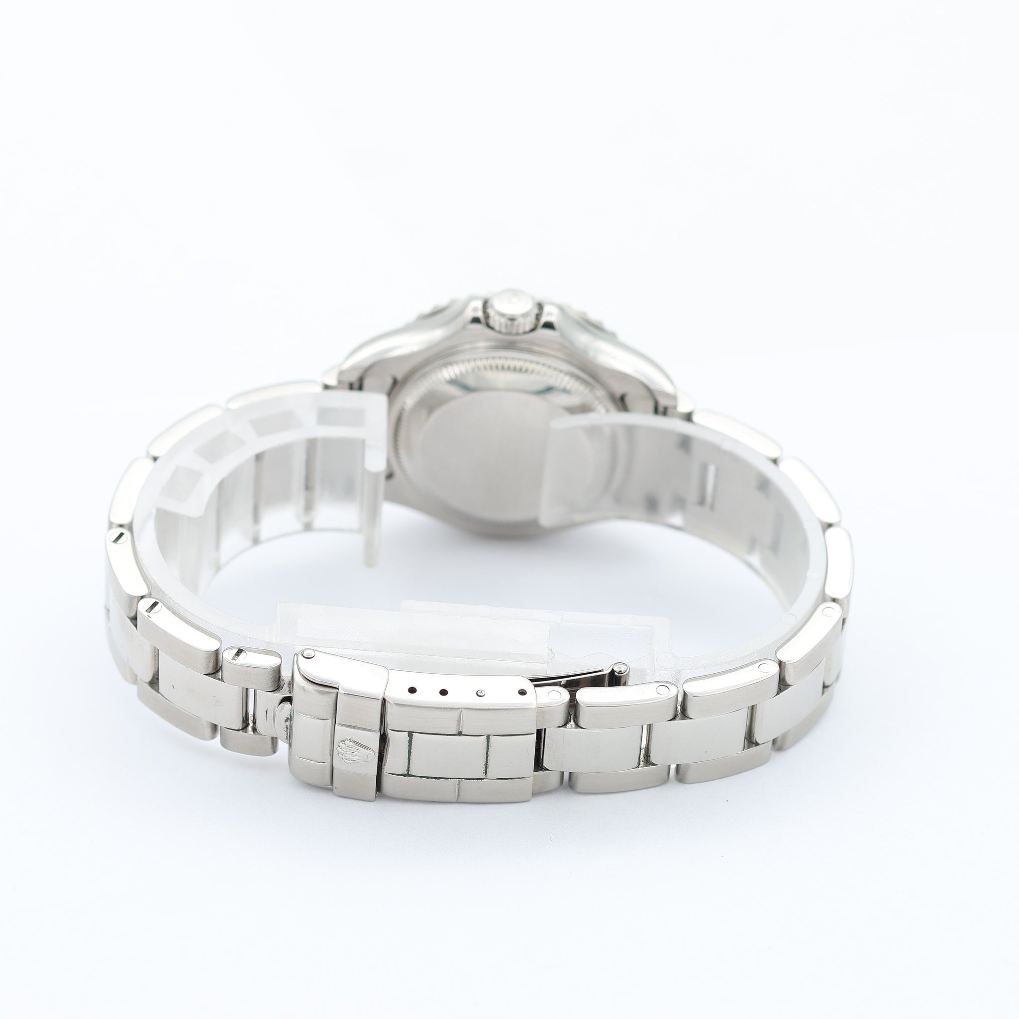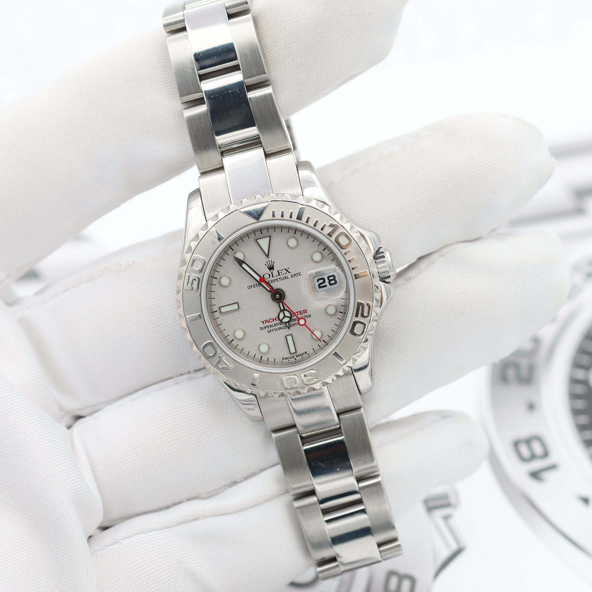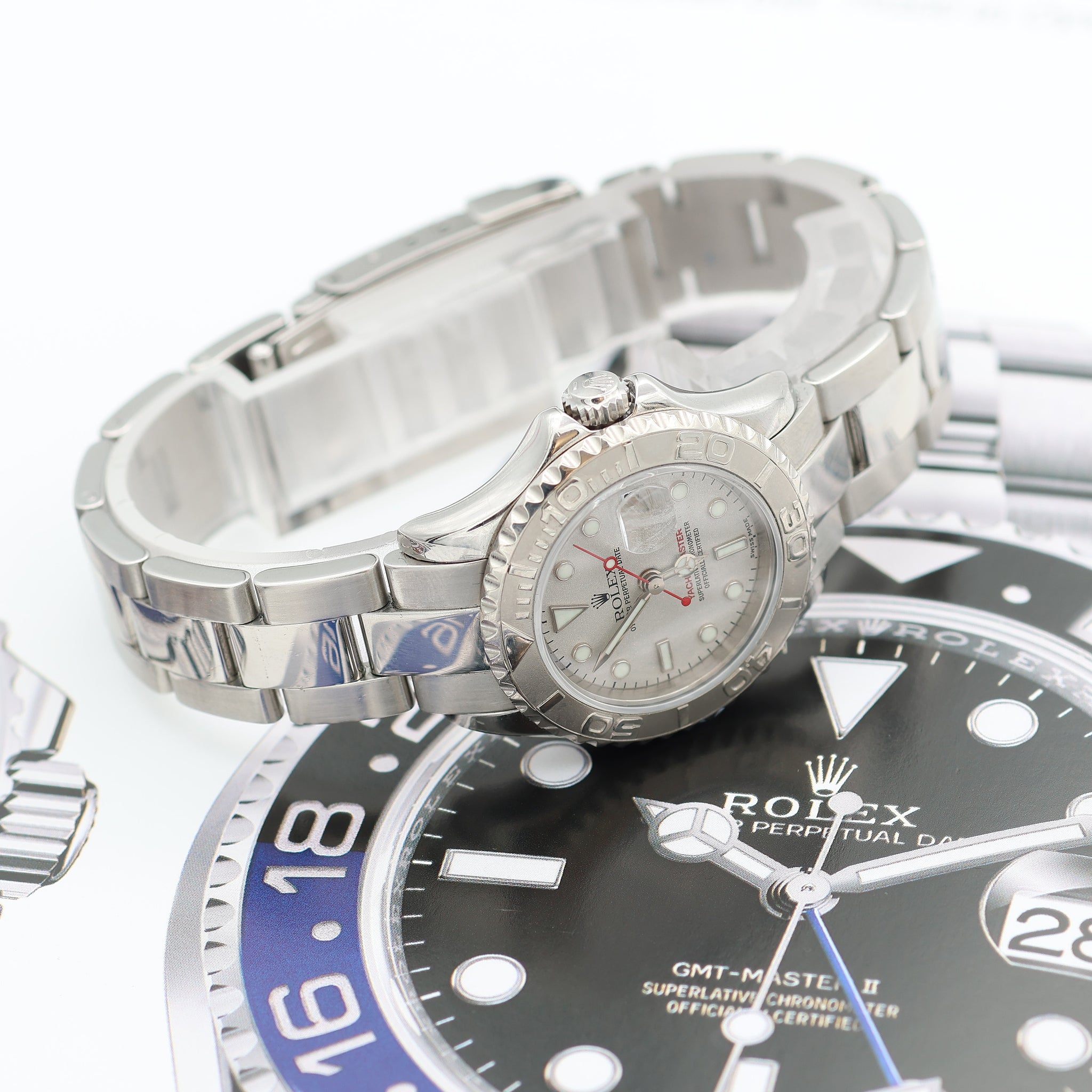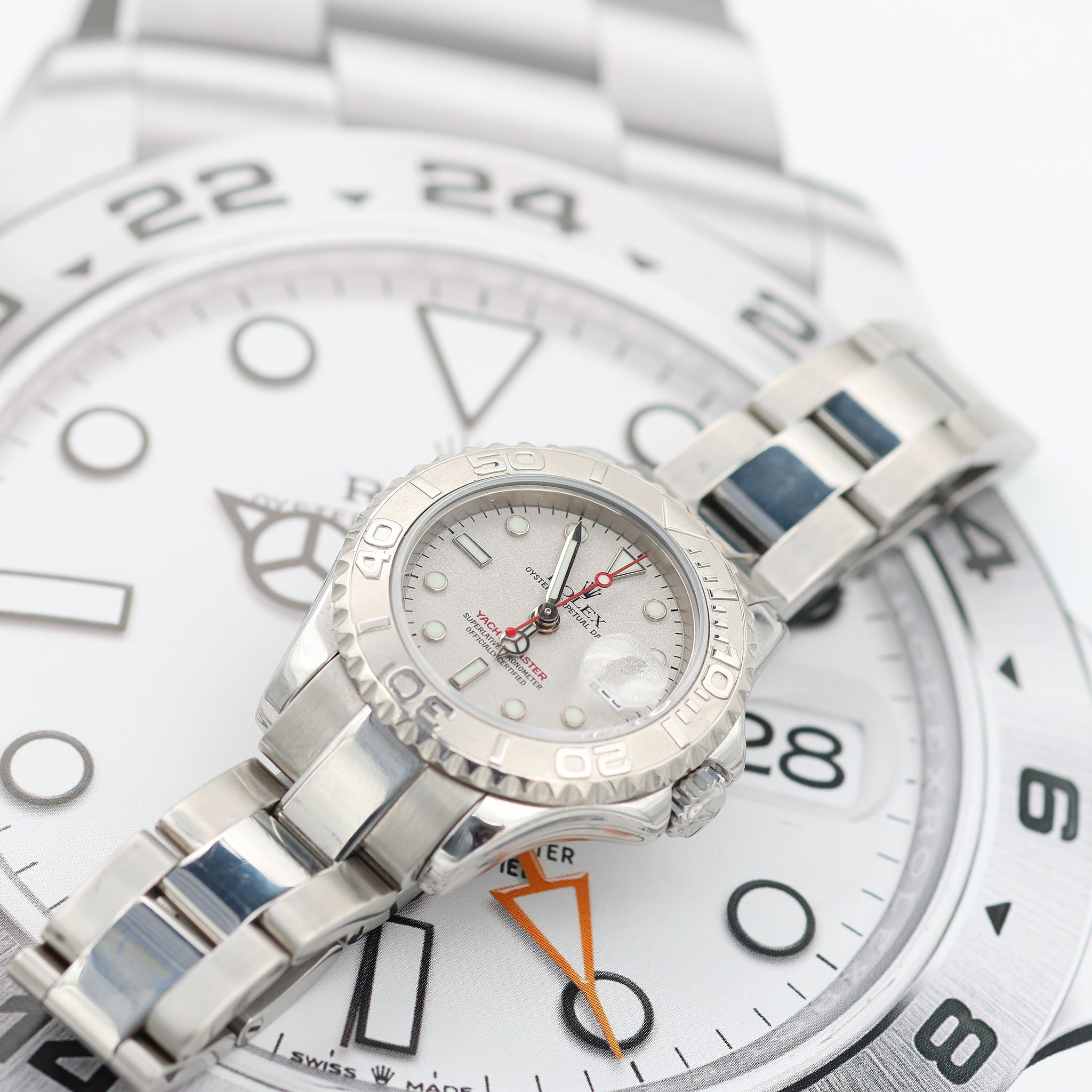 Bei der Yacht-Master kommt Rolesium zum Einsatz, und hier treffen bei einer Rolex-Uhr robuster Edelstahl und hochedles Platin aufeinander. Gehäuse und Armband bestehen aus 904L Edelstahl, die Lünette der Uhr ist allerdings tatsächlich komplett aus Platin gefertigt. Während es sich bei beiden um Weißmetalle handelt, erhält Platin im Vergleich zu Stahl einen ganz eigenen Glanz und erzeugt so einen dezenten Kontrast. Die Verwendung von Platin ist zudem ein Beleg dafür, dass dieses Modell eher als Luxus-Sportuhr positioniert ist.