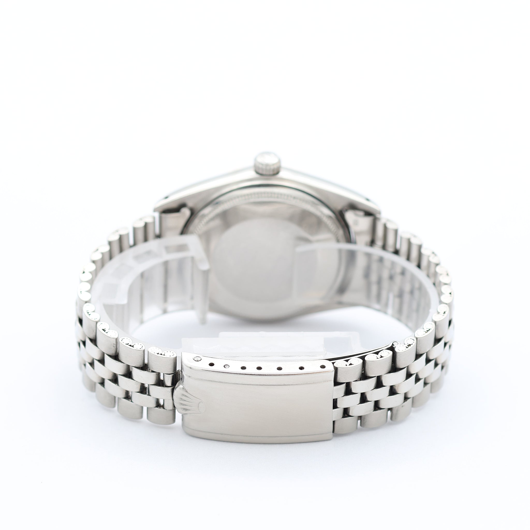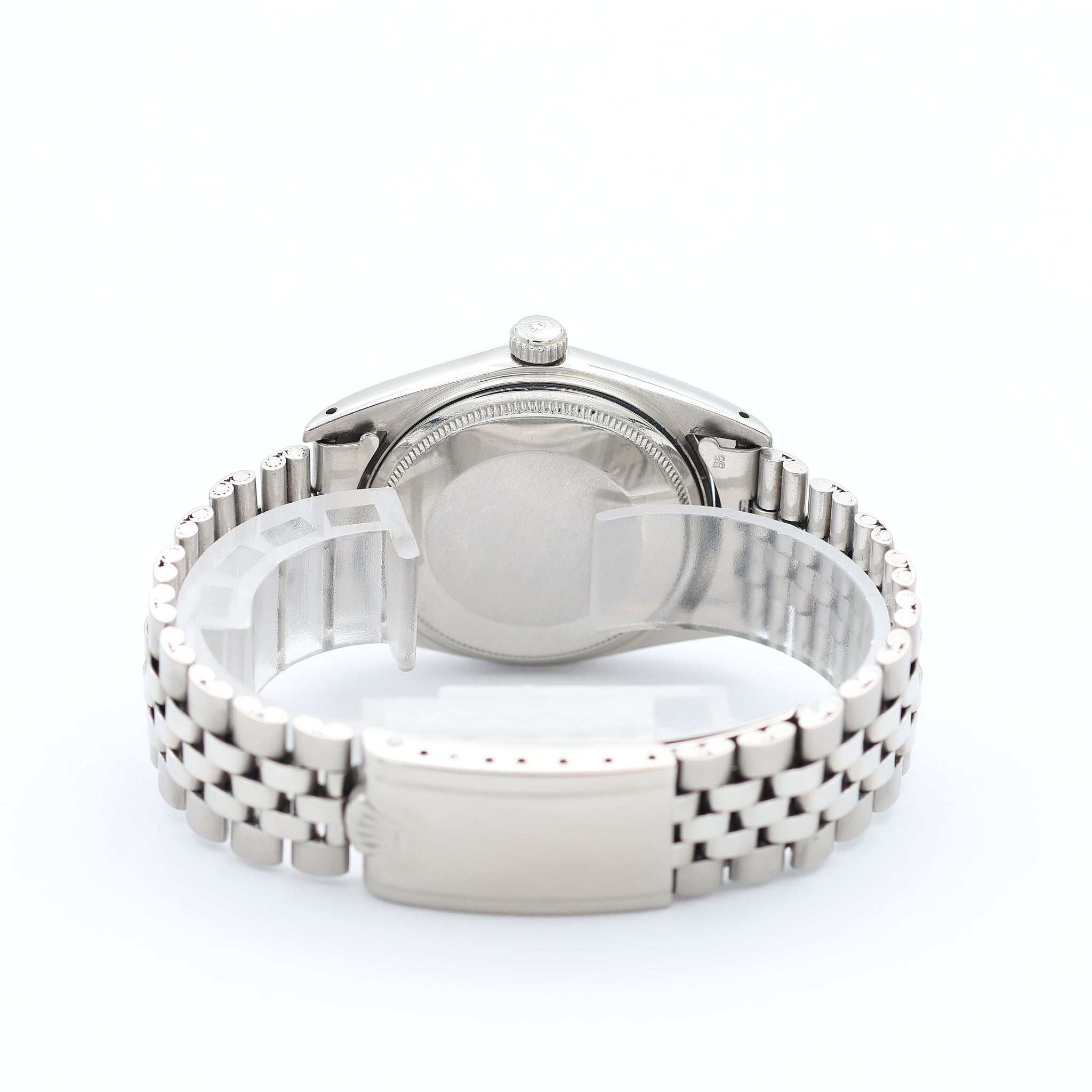 This Rolex has all the signature aesthetics of a Datejust, which include a fluted bezel, baton hour markers, and the Cyclops magnifying bubble over the date window.