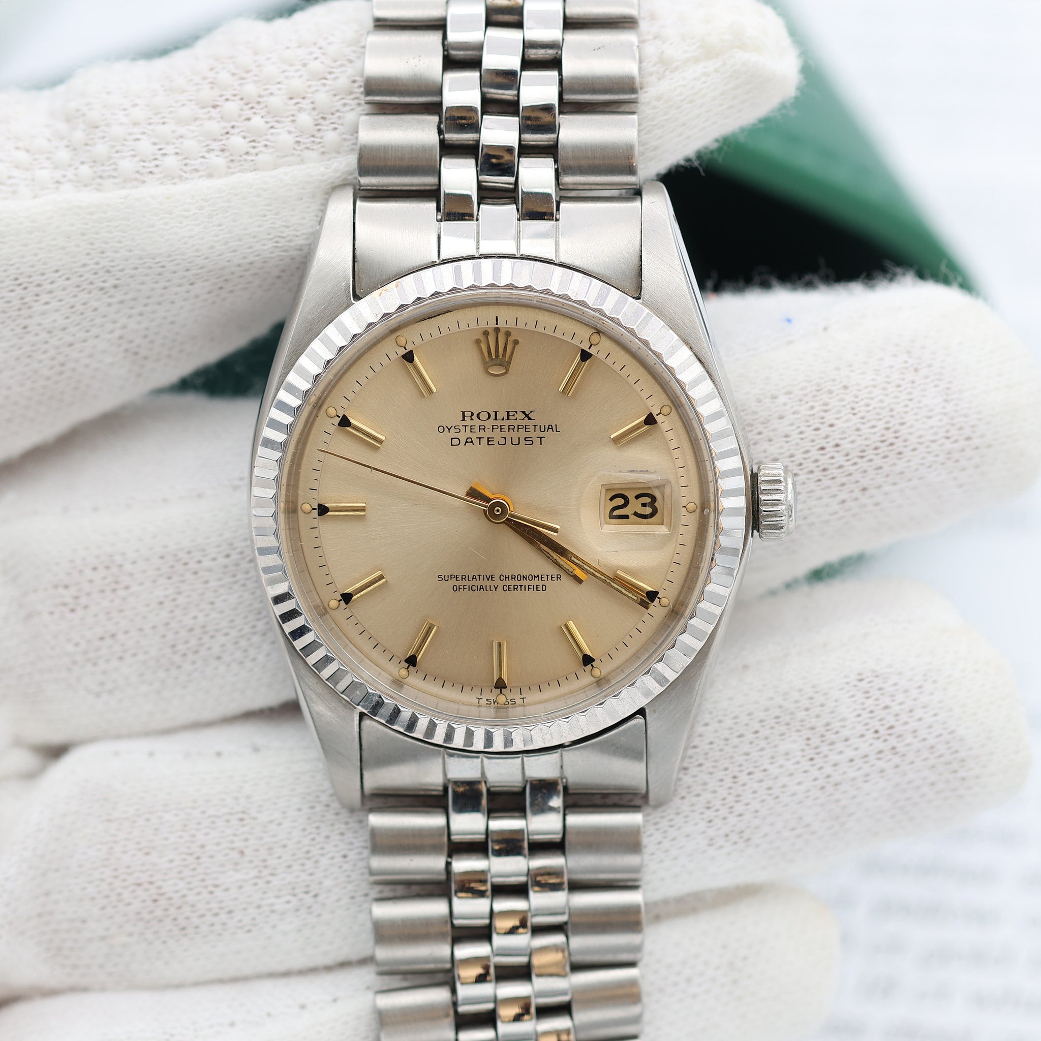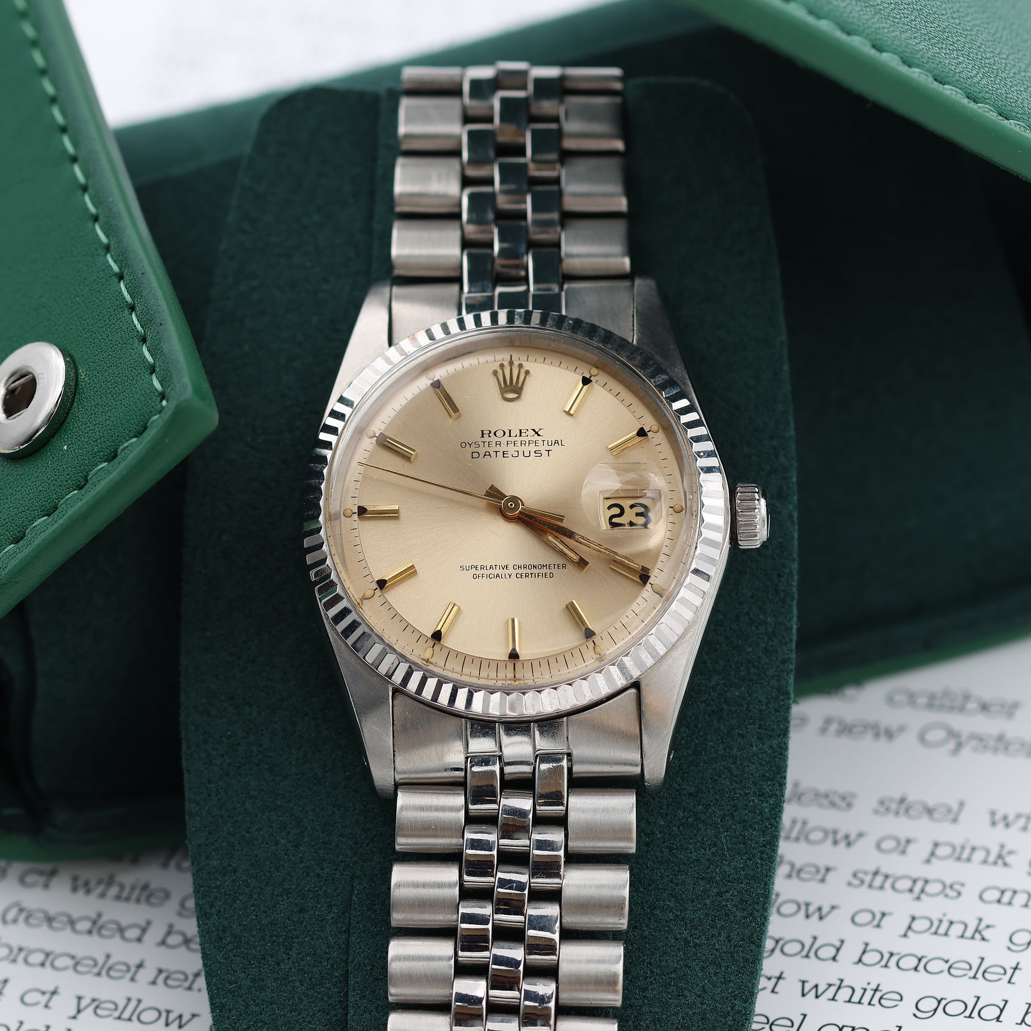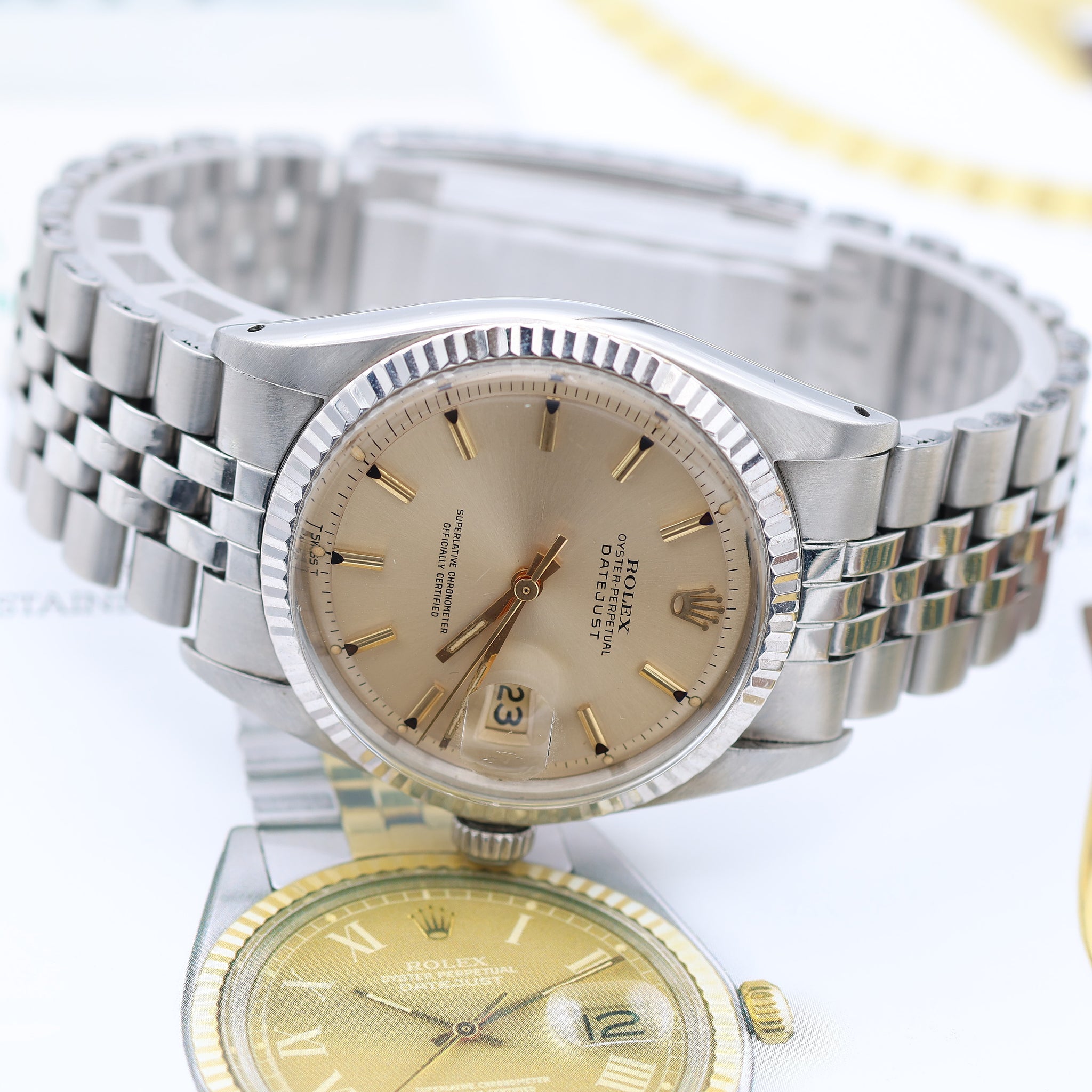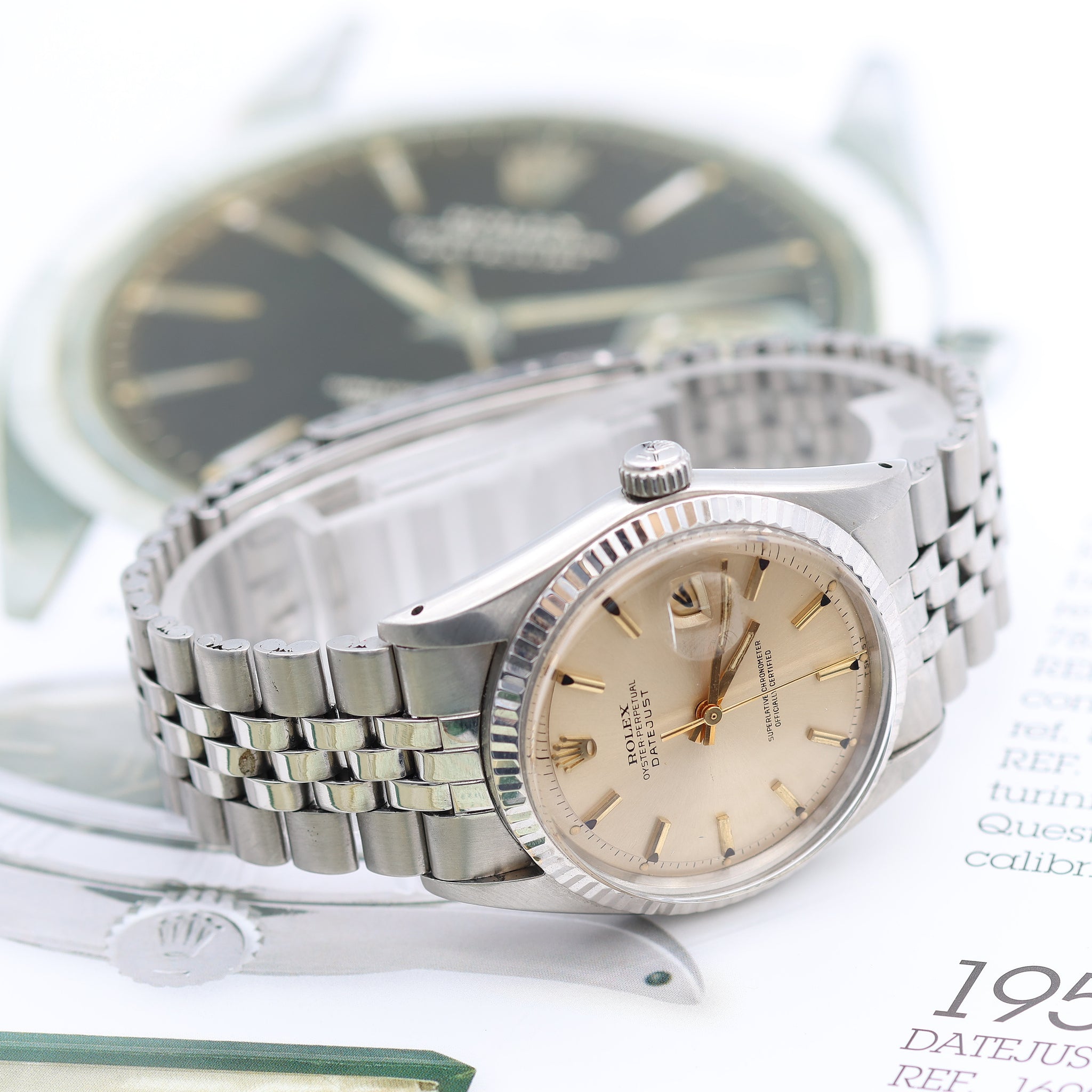 For sale at Debonar Watches: pre-owned Rolex Datejust ref. 1601 in steel and white gold, with a special champagne dial and hands that was produced specifically for the Saudi market.