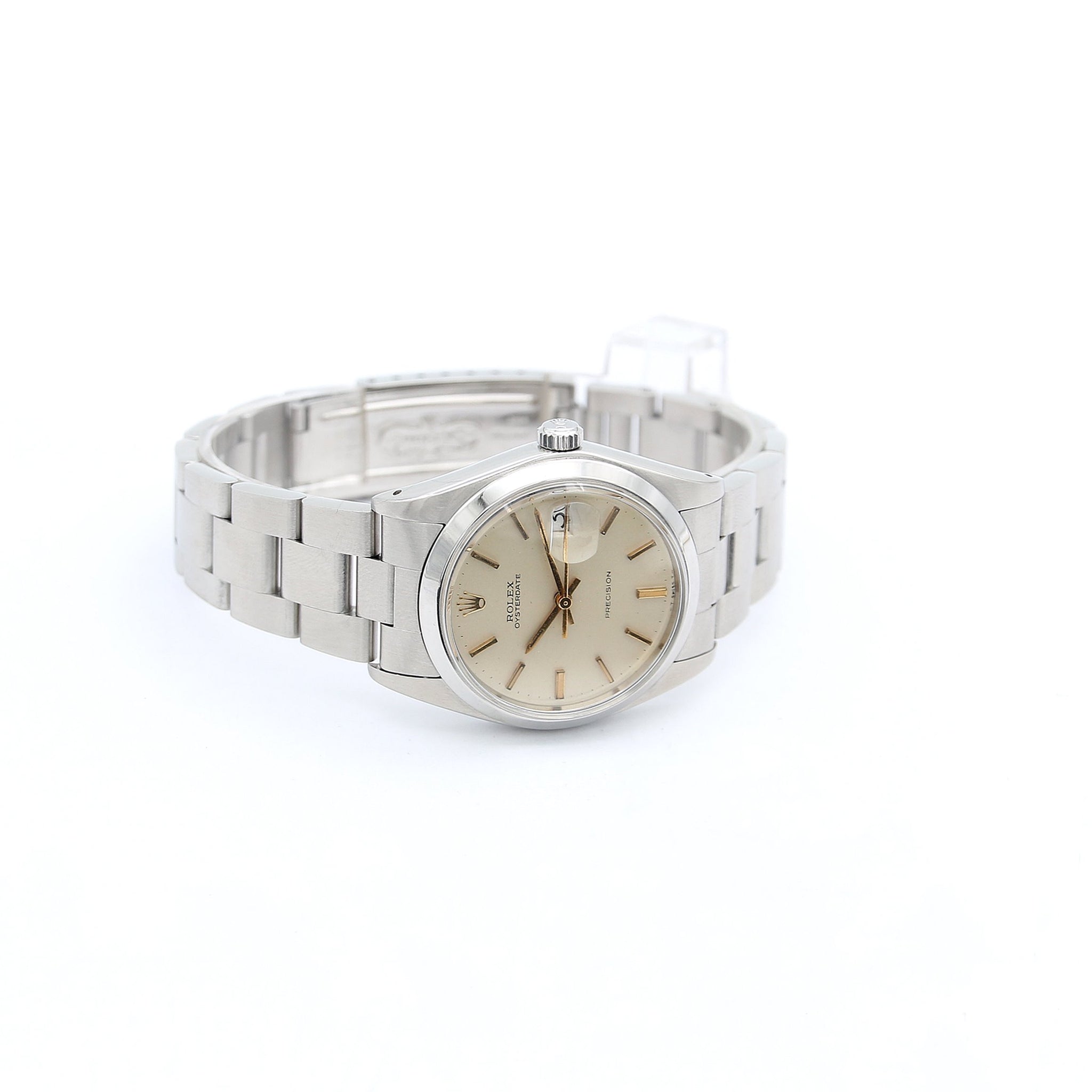 For sale at Debonar Watches: pre-owned Rolex Precision Date ref. 6694 from the '70s, with a bright cream dial and golden indexes.