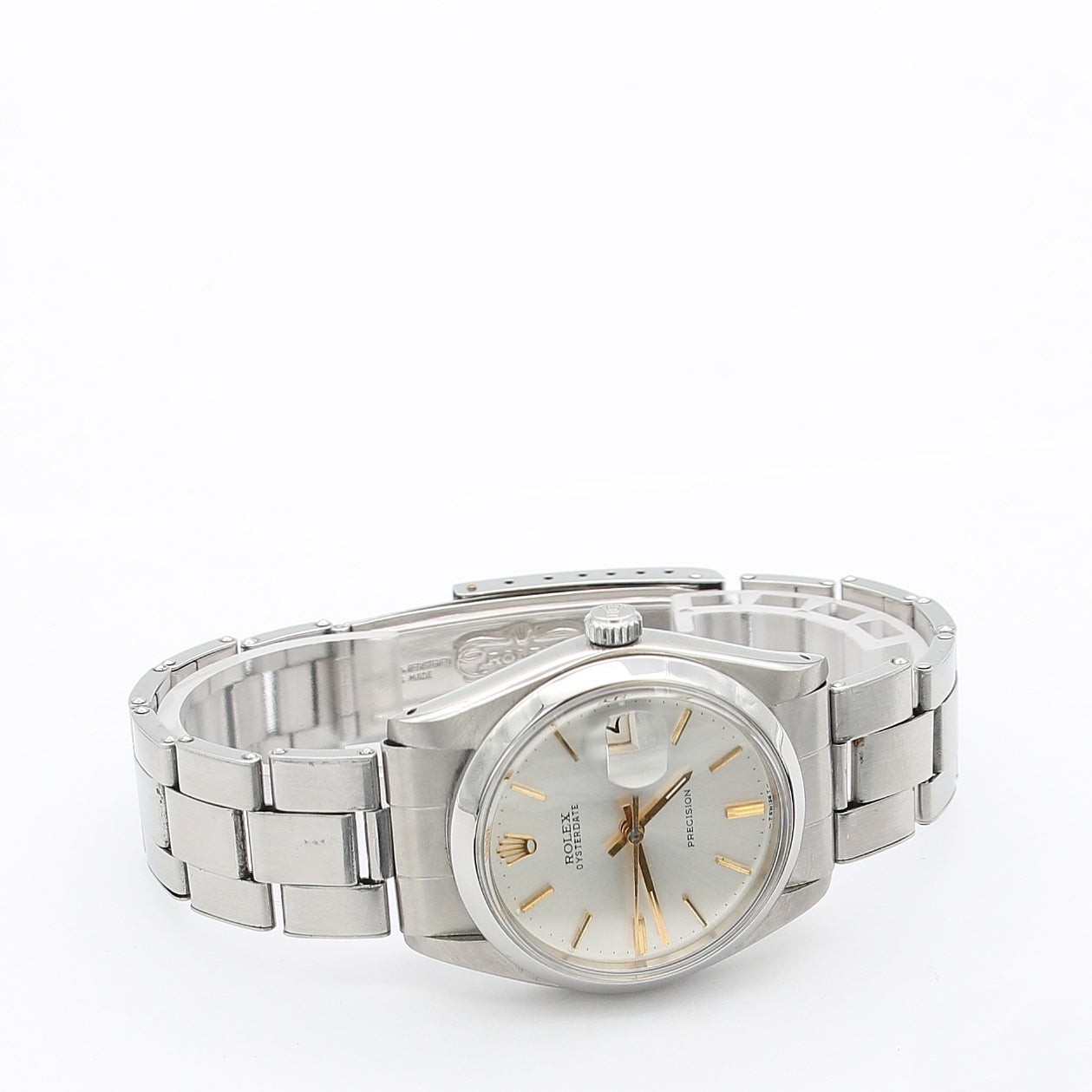 For sale at Debonar Watches: pre-owned Rolex Precision Date ref. 6694 from the '70s, with a classic silver dial with golden indexes. The watch is in steel on a beautiful Oyster rivet bracelet.