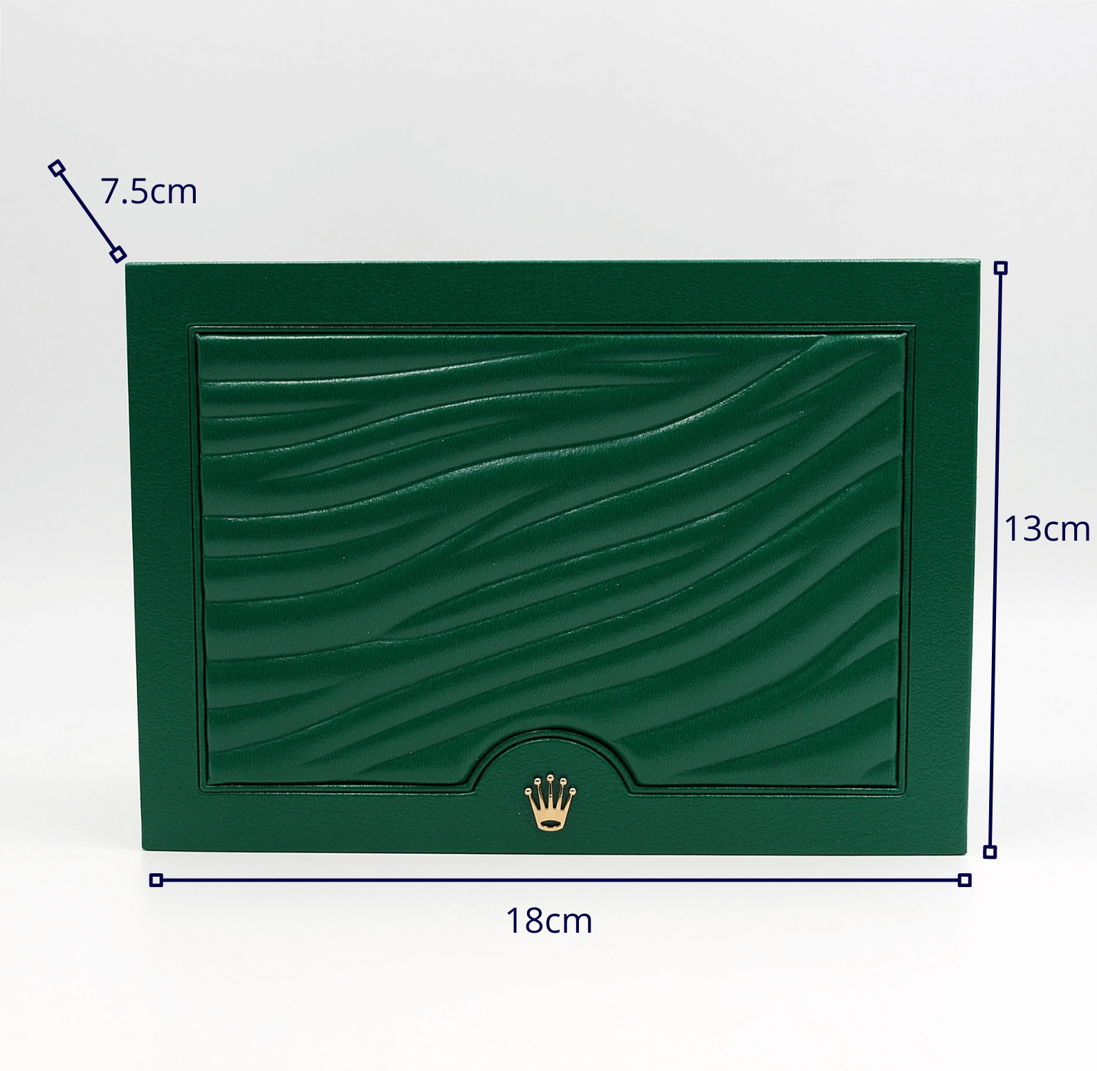 Dimensions (leather box): 18 cm wide x 13 cm deep x 7.5 cm high (in inches: 7" wide x 4" deep x 3" high).