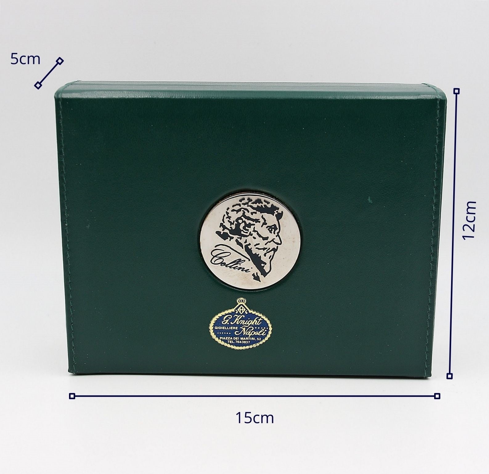 Dimensions (leather box): 15 cm wide x 12 cm deep x 5 cm high (in inches: 5.9" wide x 4.7" deep x 1.9" high).
