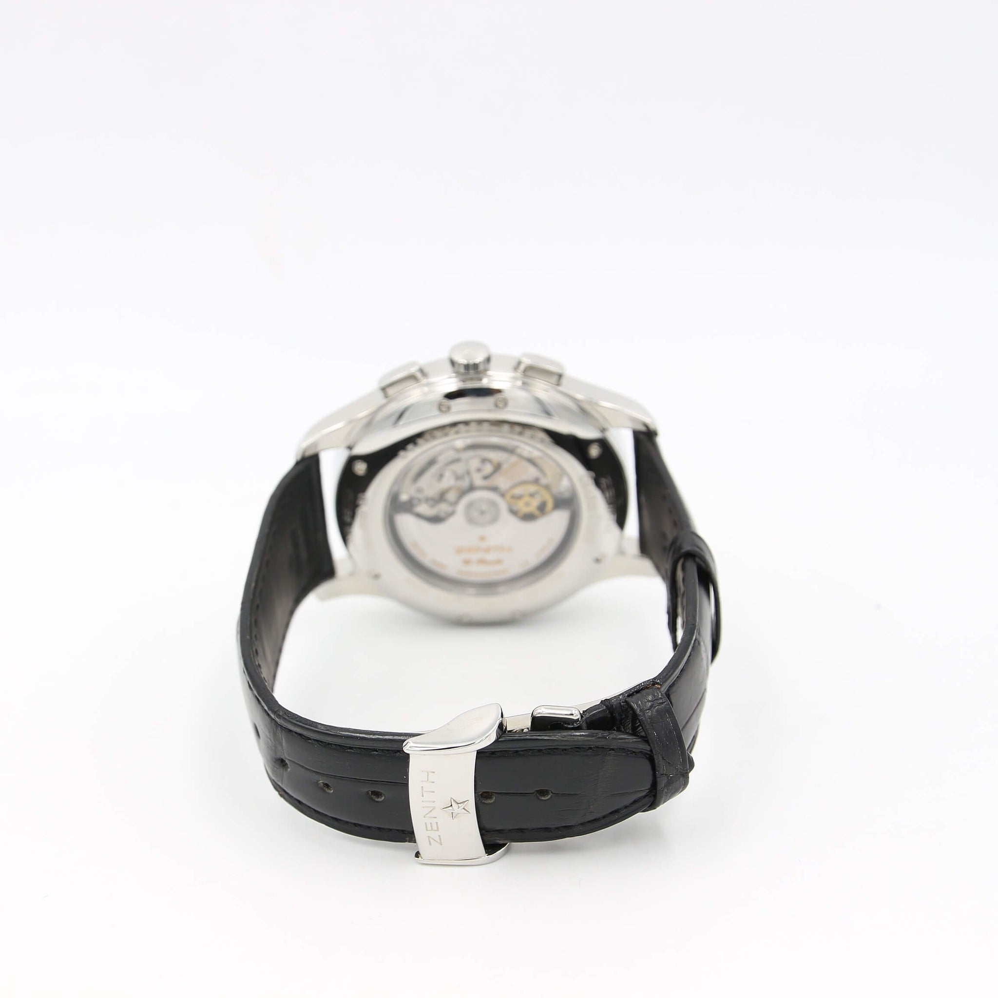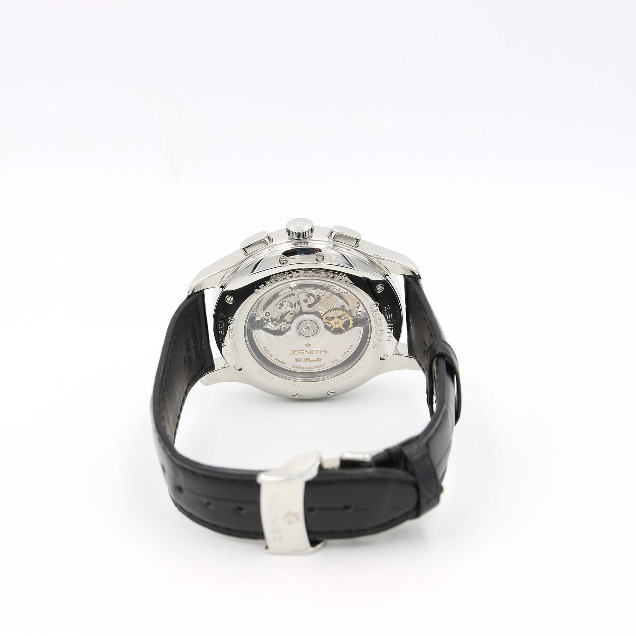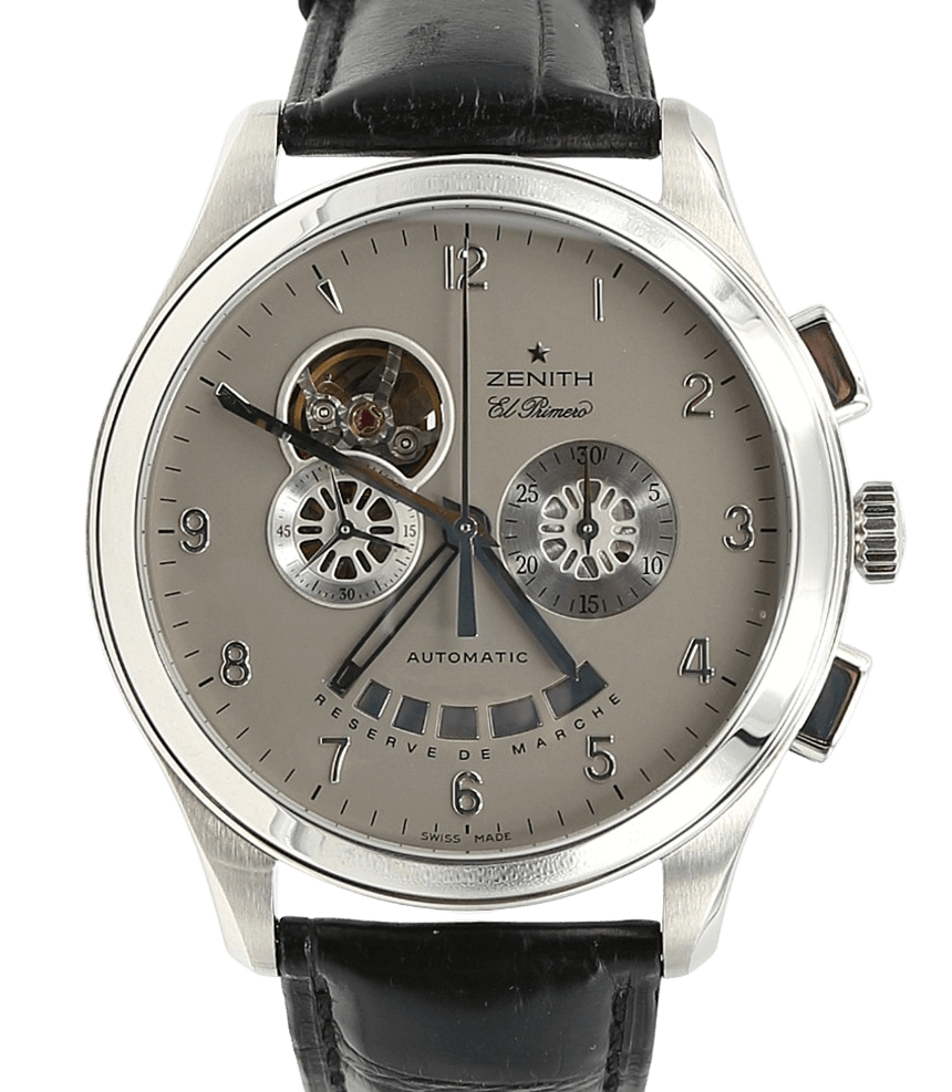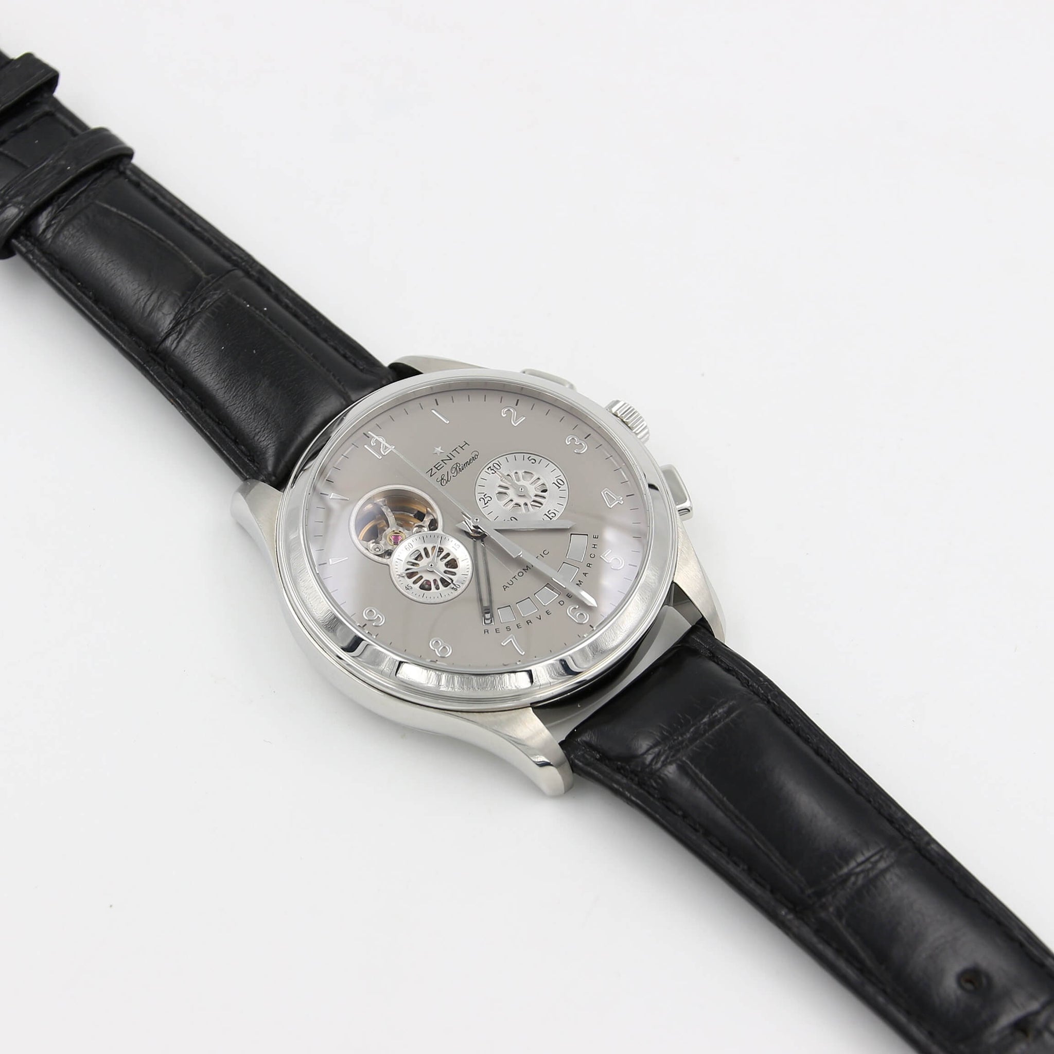 The functions of this automatic Zenith watch include: hours, minutes, central Seconds, chronograph and power reserve. A power reserve indicator (on the dial called Réserve de Marche) is a complication of the watch, which is designed to show the amount of remaining stored energy.