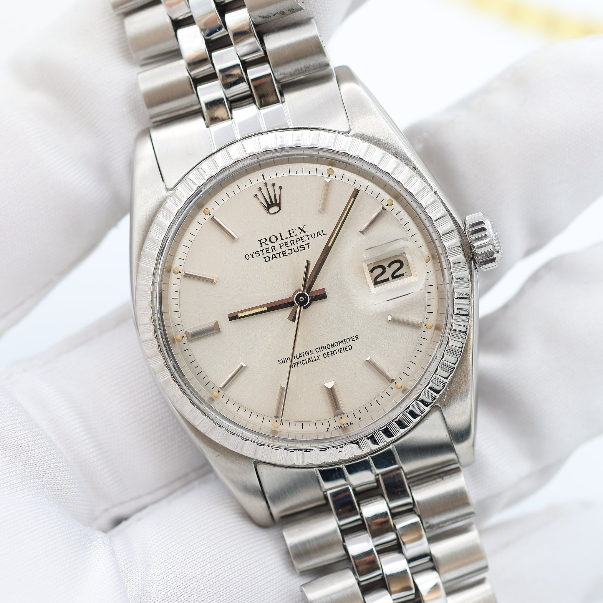 This Rolex has an engine-turned bezel, baton hour markers, and the Cyclops magnifying bubble over the date window.
