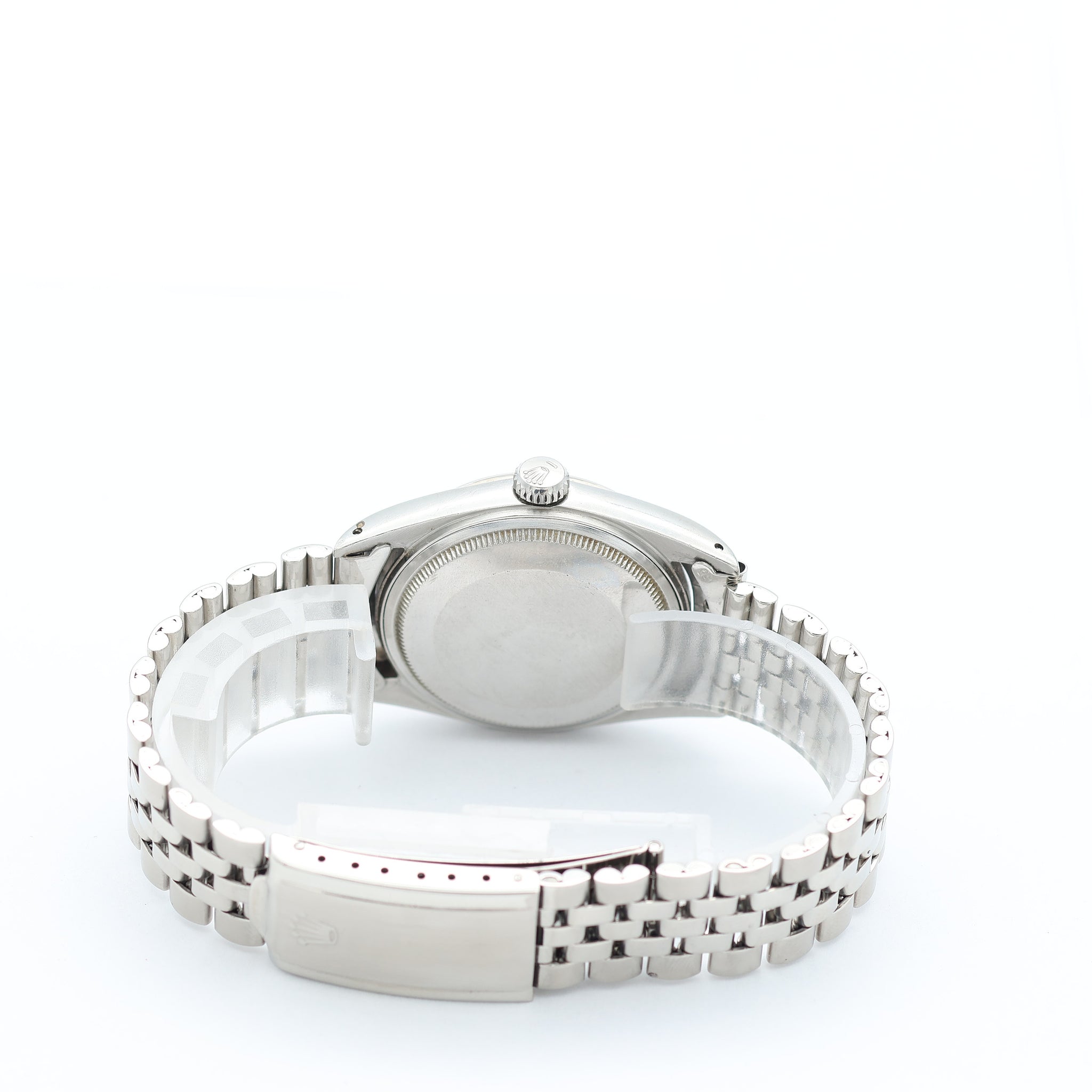 This Rolex has all the signature aesthetics of a Datejust, which include a fluted bezel, baton hour markers, and the Cyclops magnifying bubble over the date window.