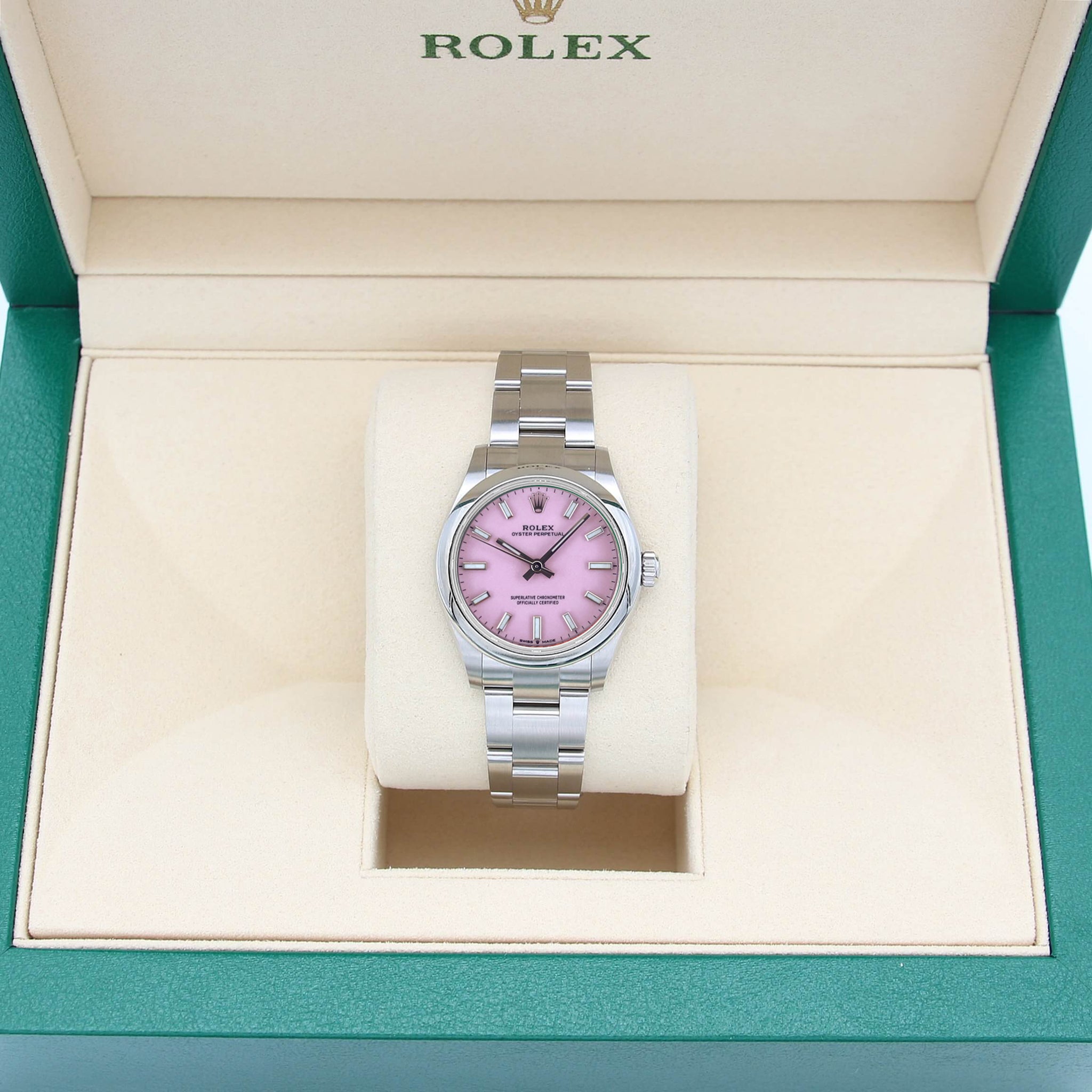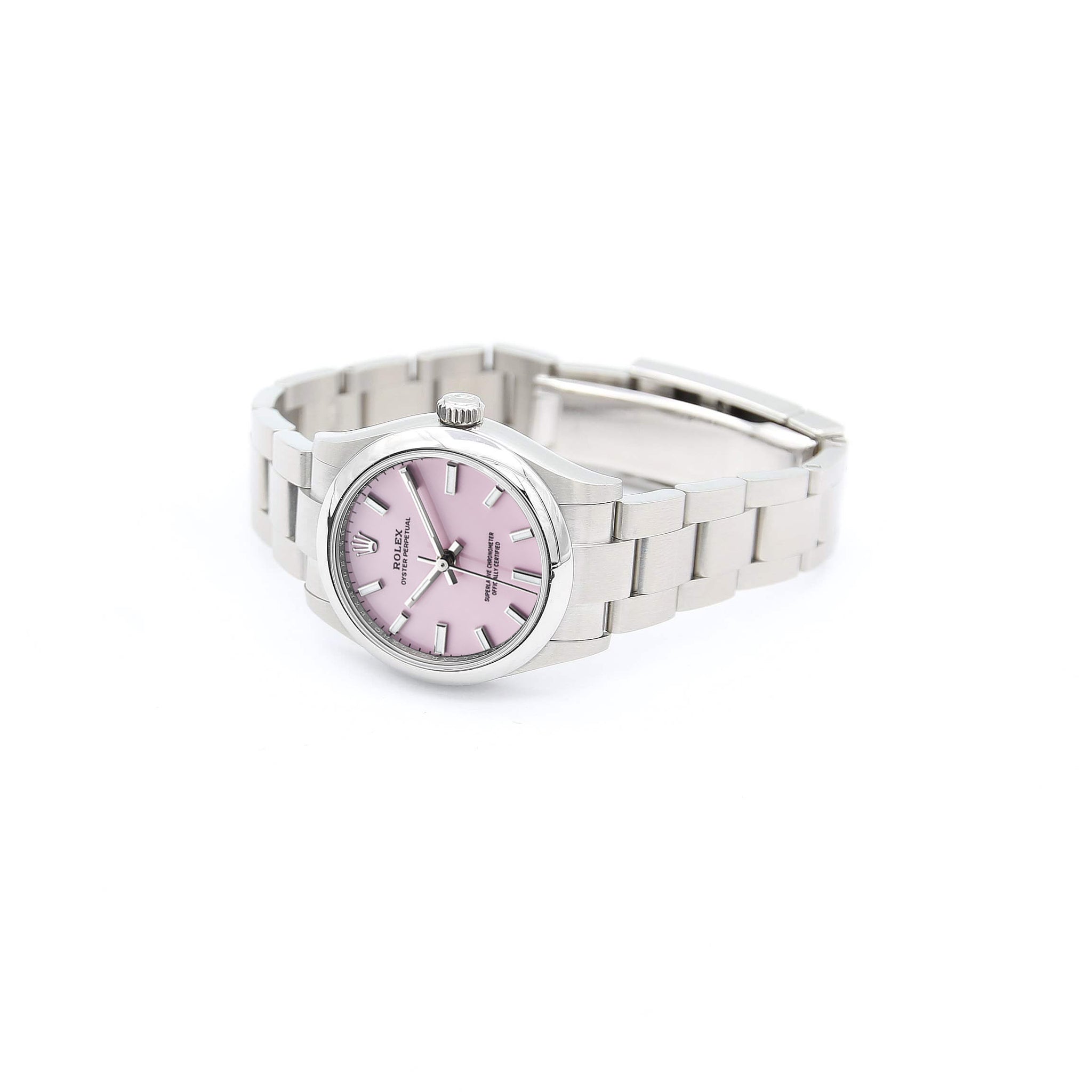 Despite its traditional origins, this Rolex presents a sweet candy (cotton pink) dial.