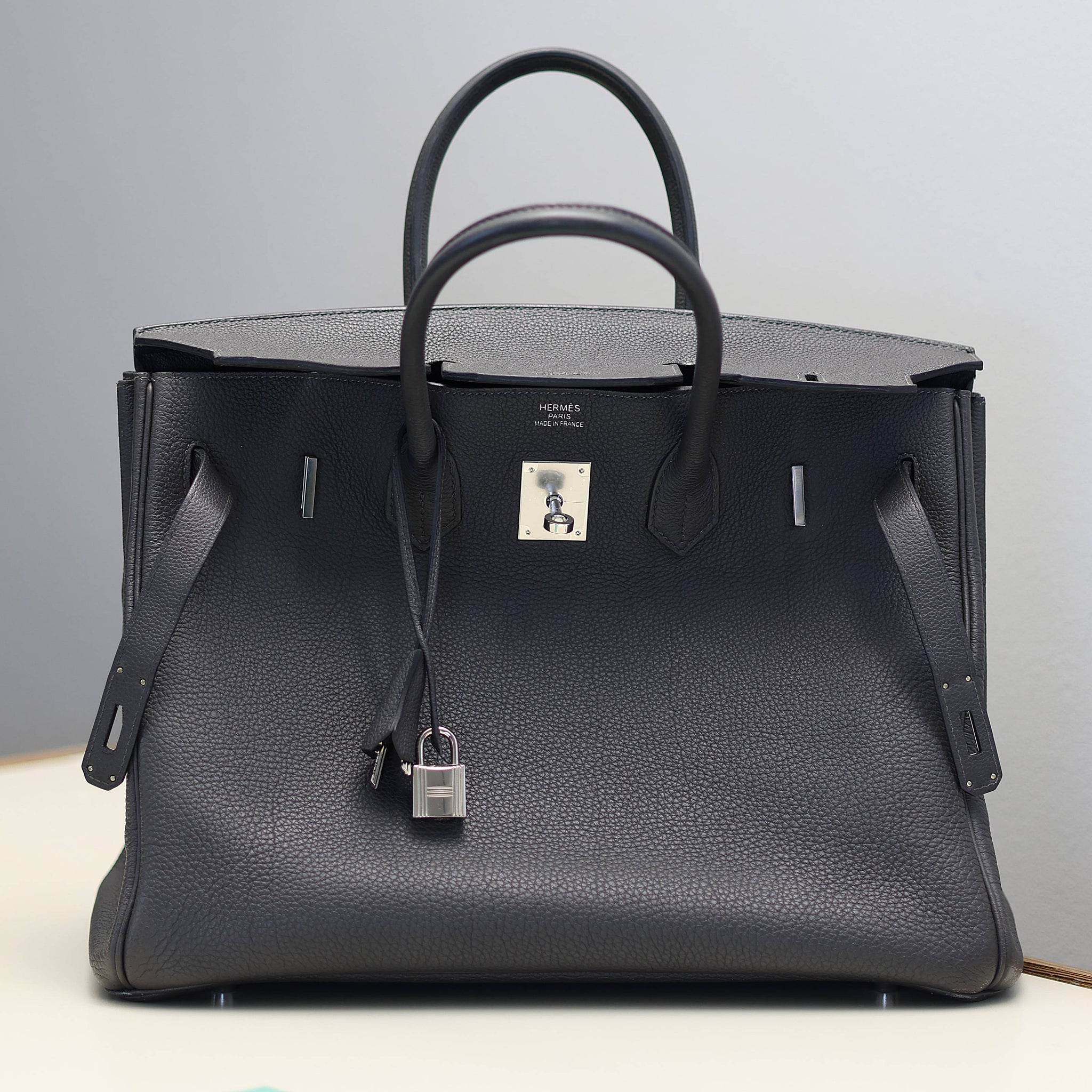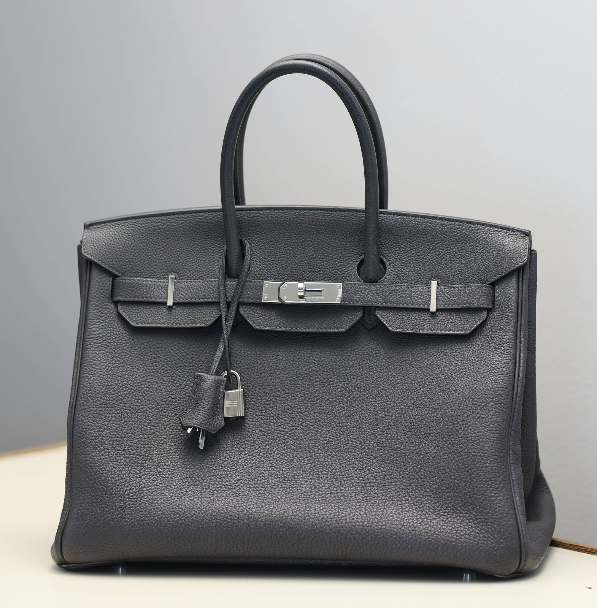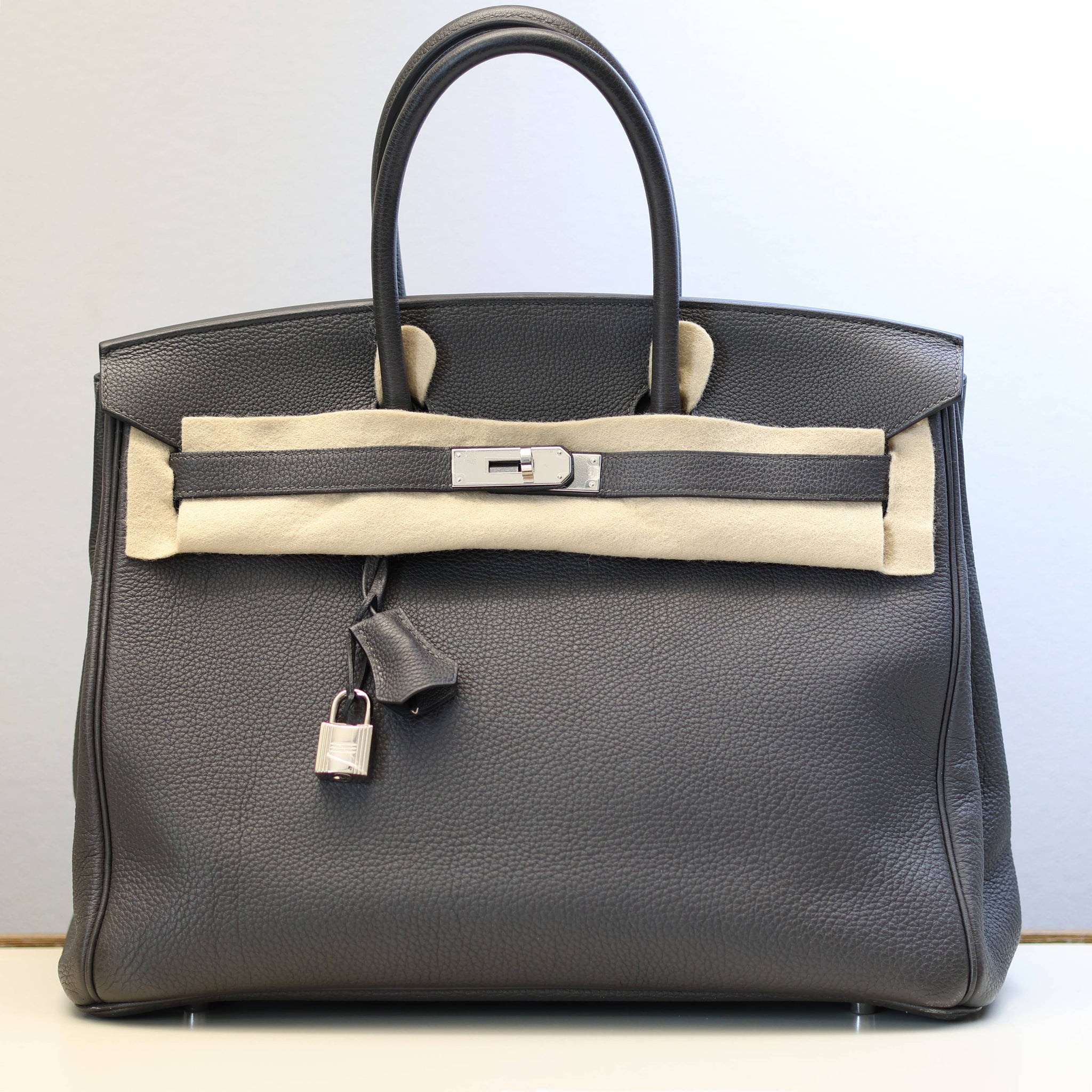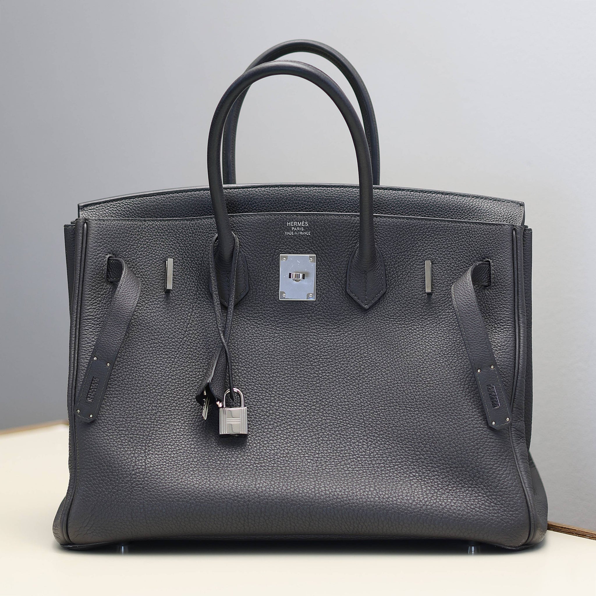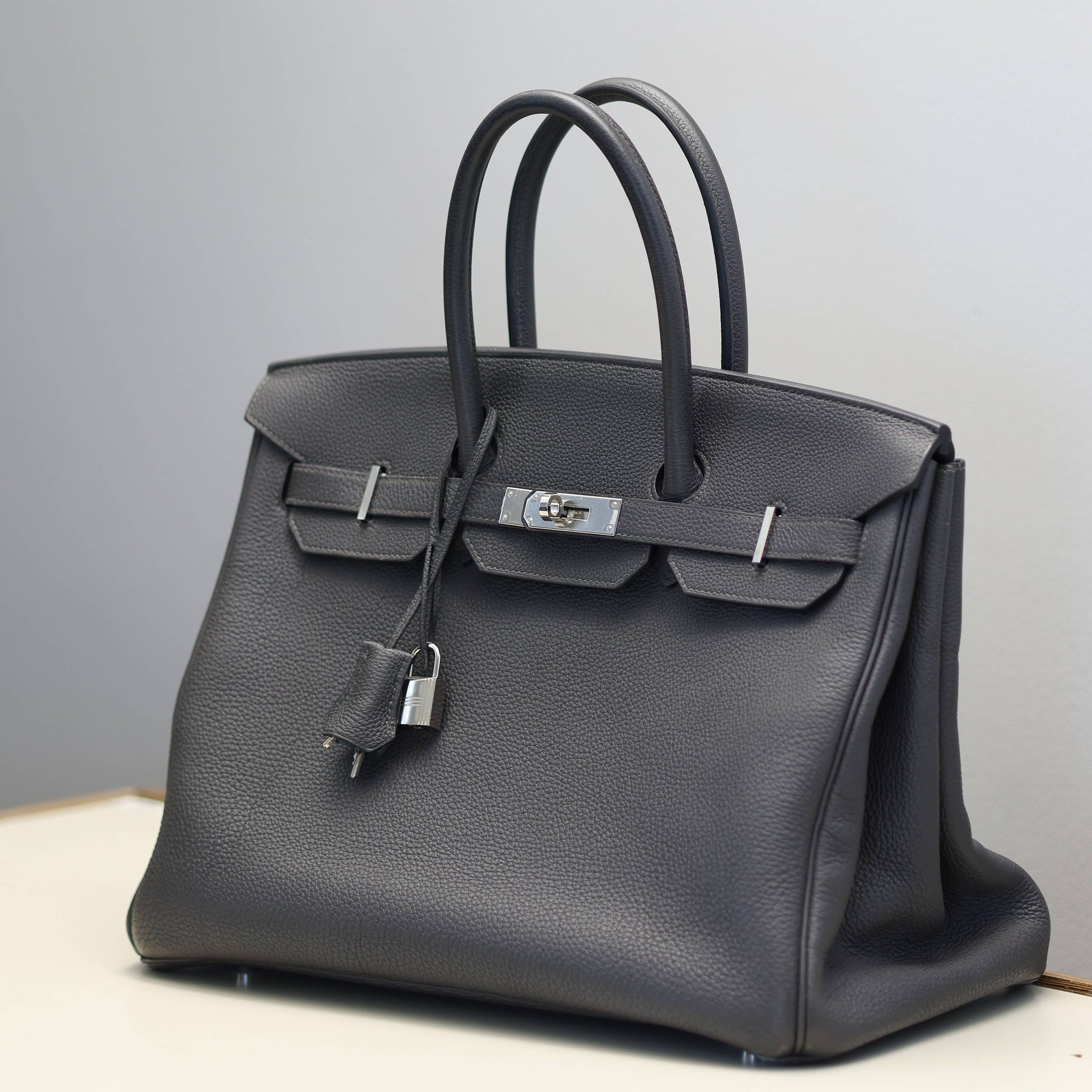 For sale at Debonar Watches: pre-owned Hermès Bag Birkin 35 in dark grey, with dust bag and original lock.