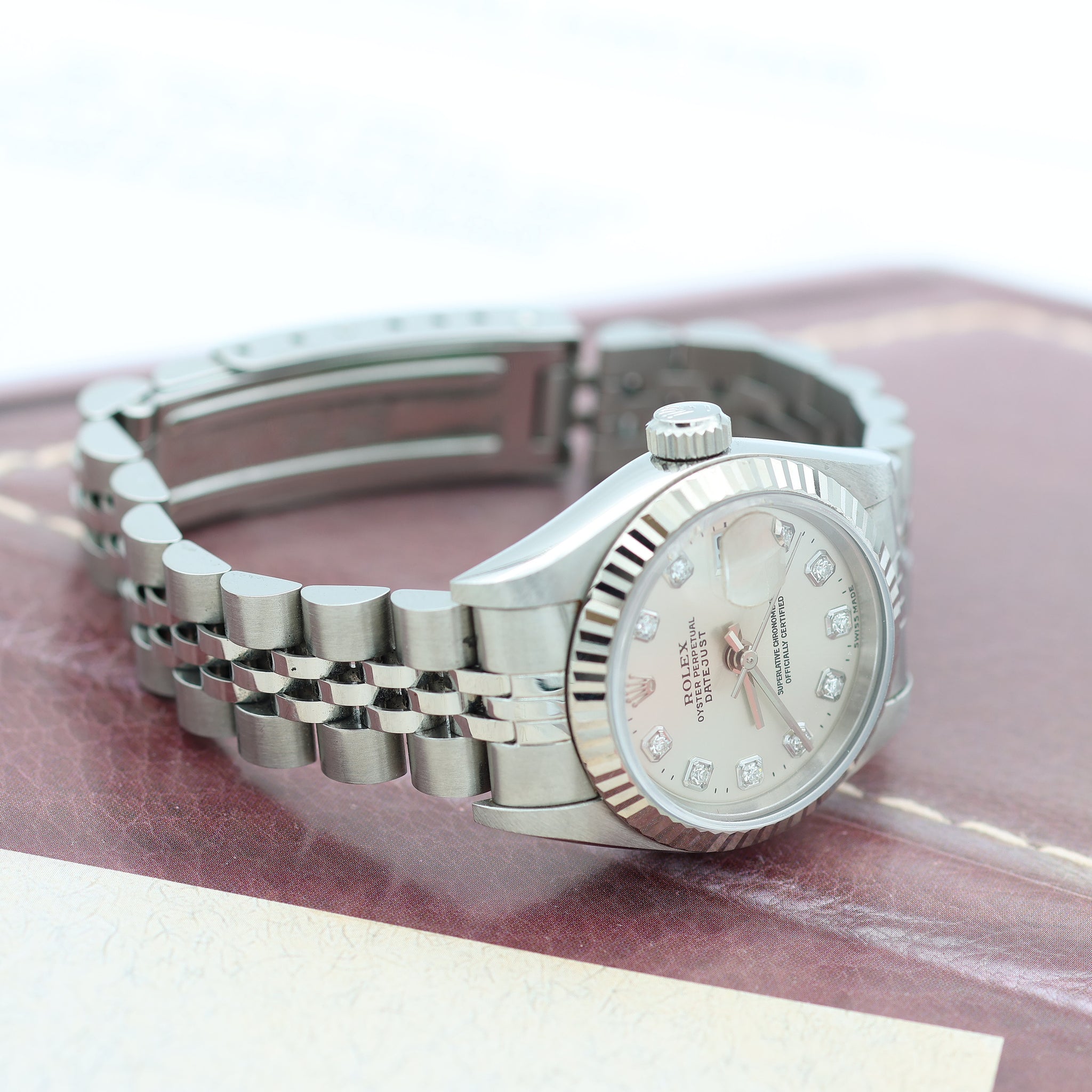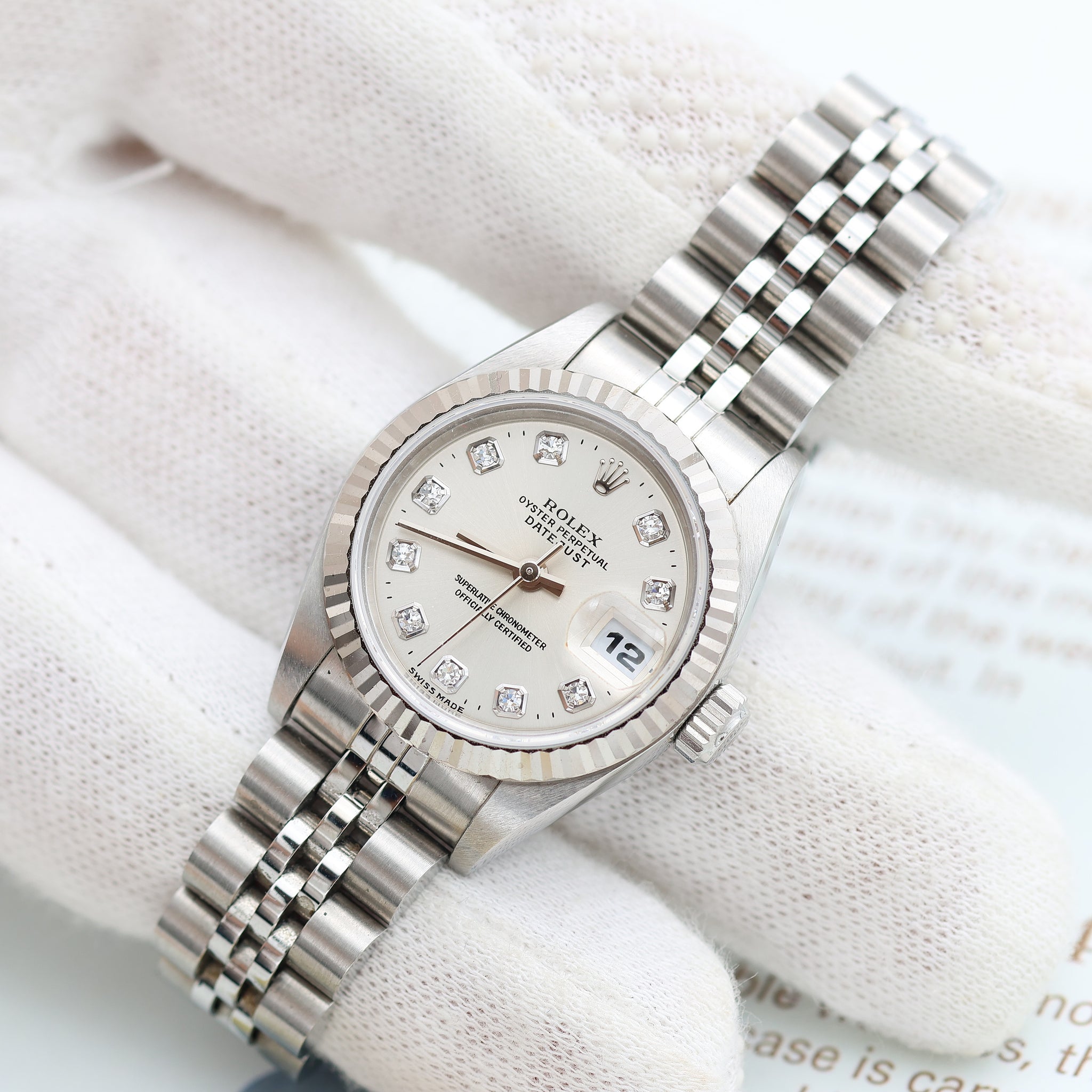 For sale at Debonar Watches: pre-owned Rolex Oyster Perpetual Datejust Ref. 69174G with a silver dial with diamonds.