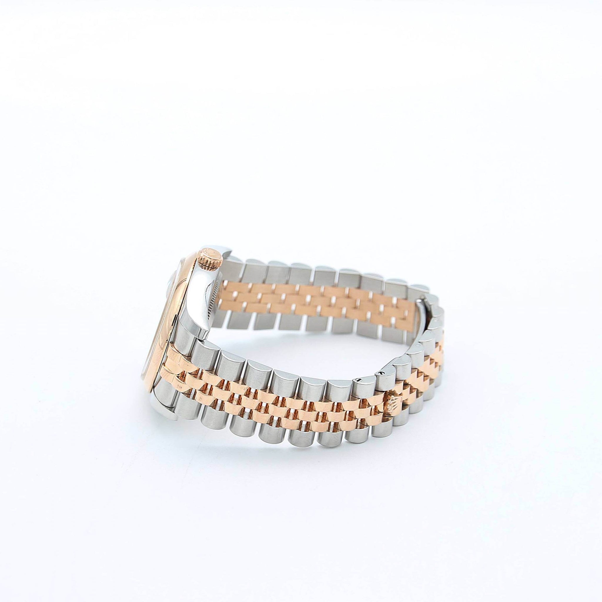 This 116201 is made of gold and steel, including bracelet and bezel.