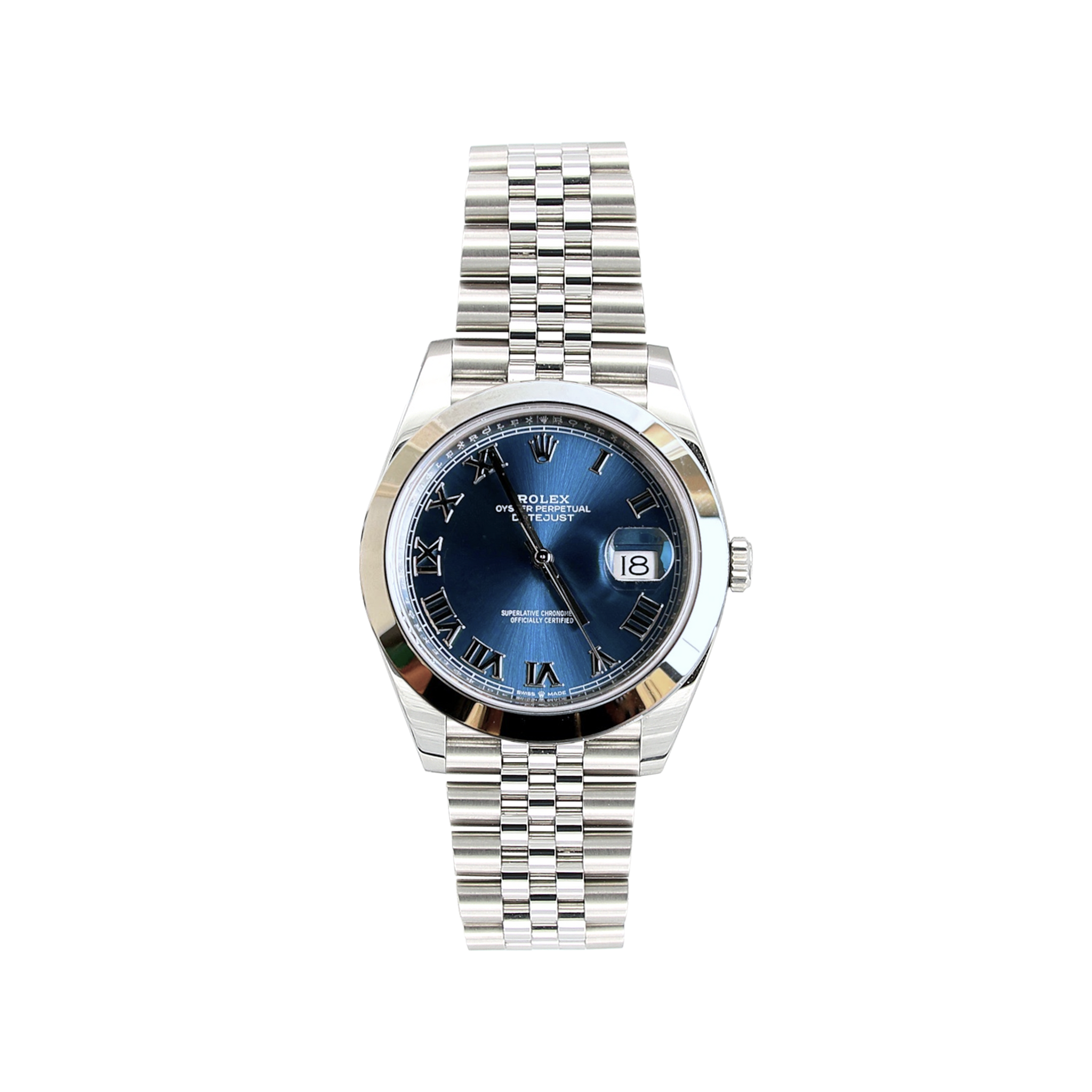This Oyster Perpetual Datejust 41 features a bright Blue Roman dial and Jubilee bracelet.