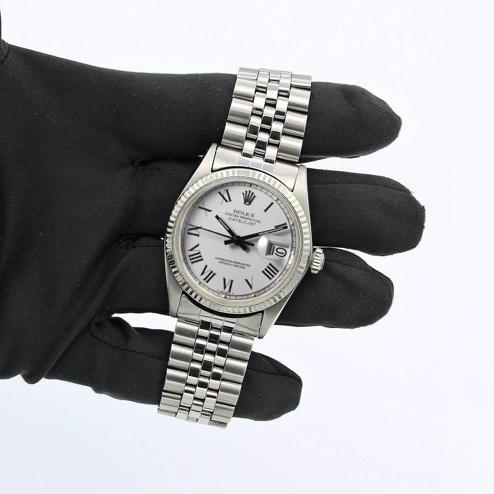 This Rolex has all the signature aesthetics of a Datejust, which include a fluted bezel, baton hour markers, and the Cyclops magnifying bubble over the date window.