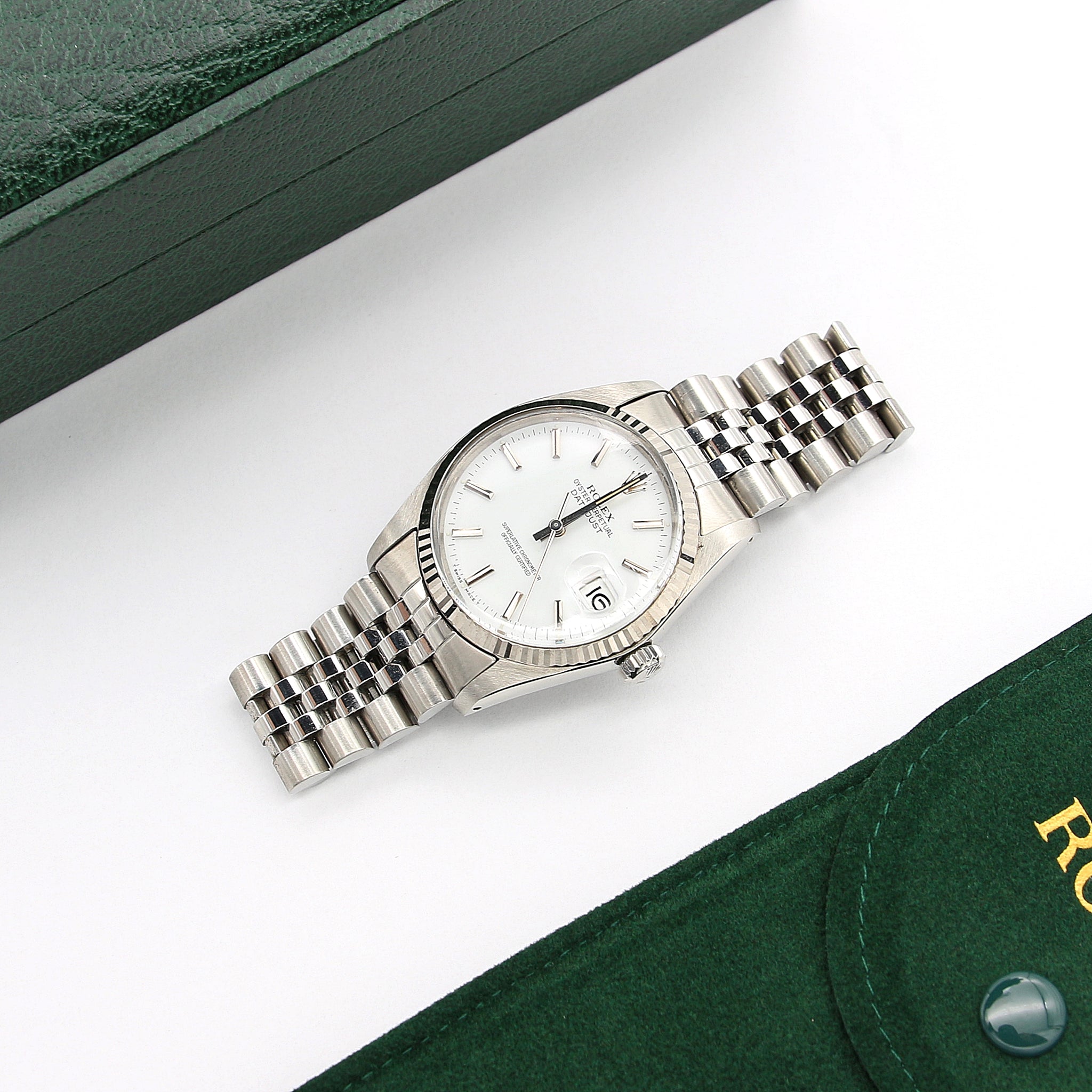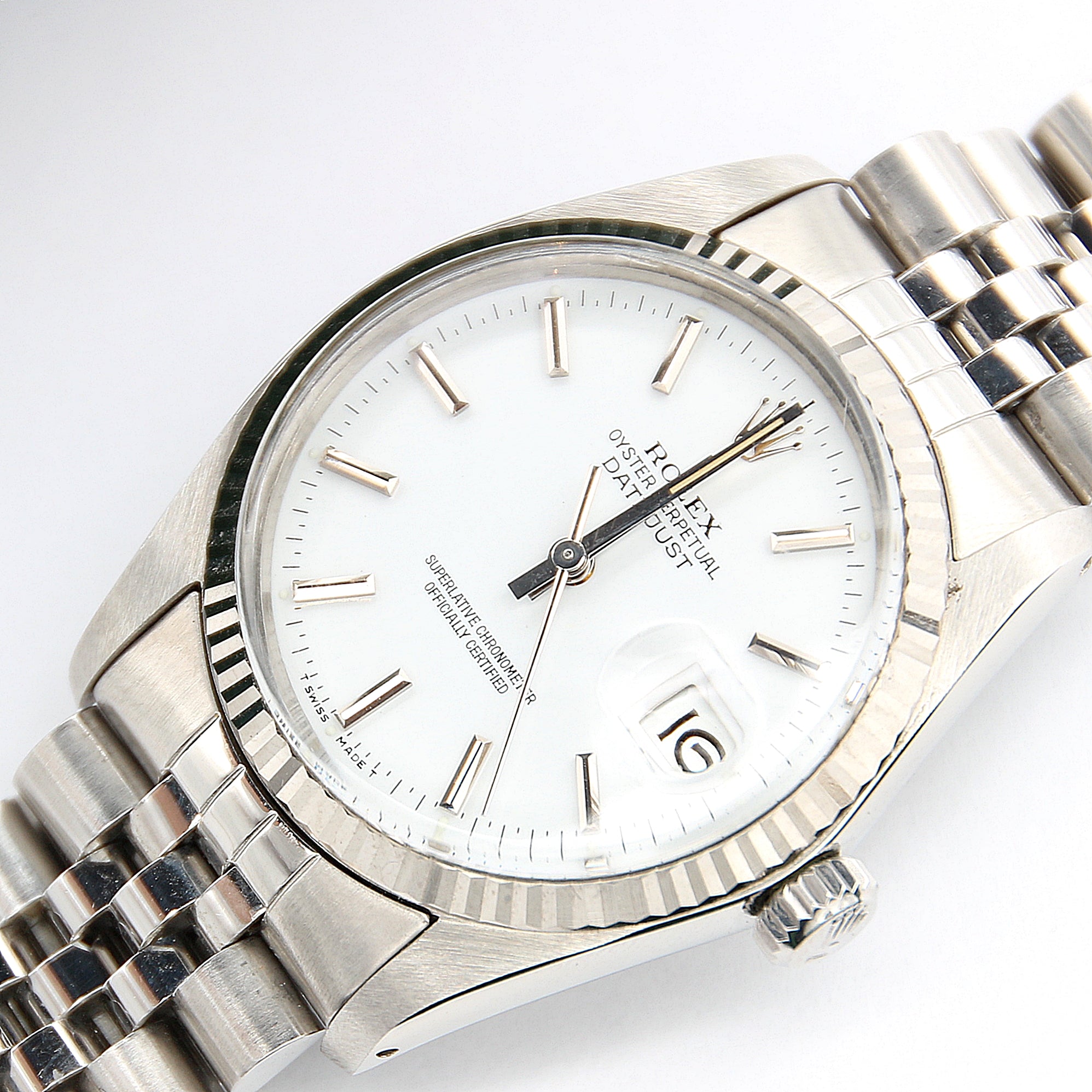 Today, Rolex refers to the pairing of stainless steel with gold as “Rolesor.” The reference 16014 falls under the “White Rolesor” category, with its fluted bezel in white gold and stainless steel throughout the rest of the watch and bracelet. The all-white metal finish is very desirable to many because of its understated versatility.