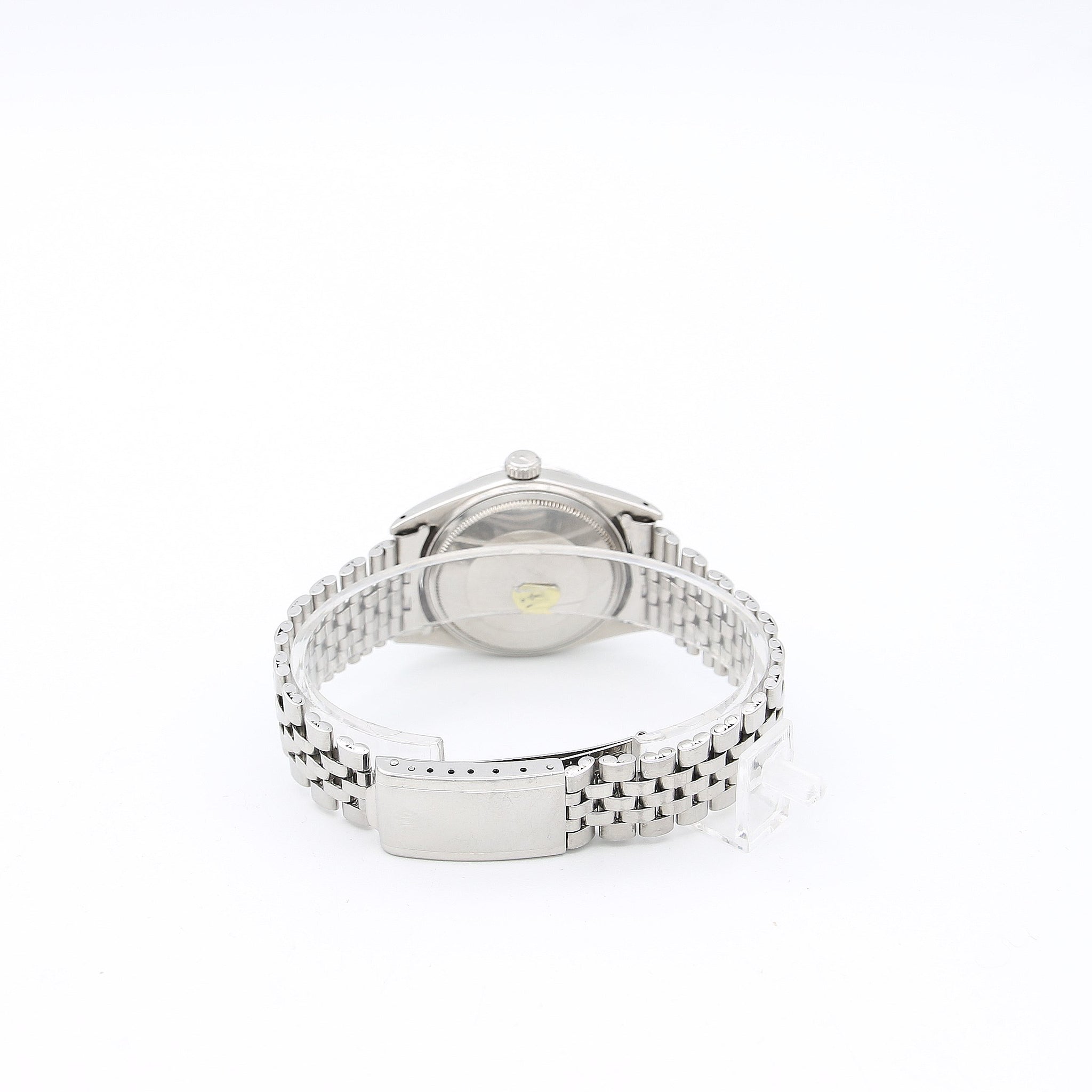 This Rolex has an engine-turned bezel, baton hour markers, and the Cyclops magnifying bubble over the date window.