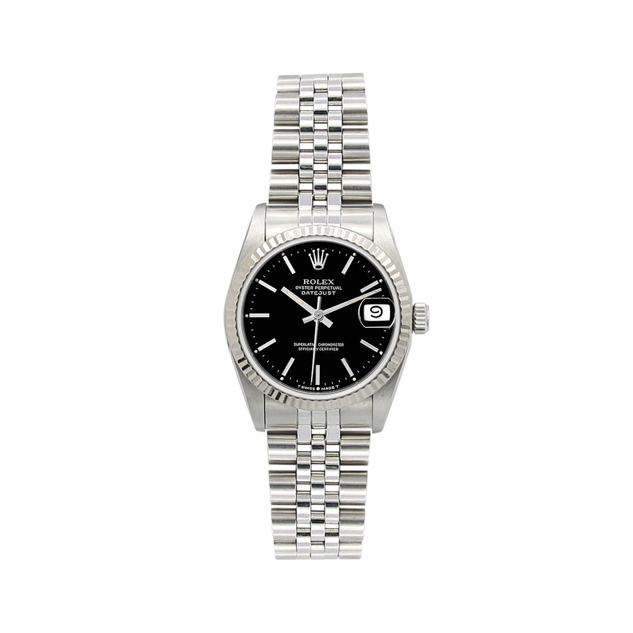 This elegant Rolex features an steel Oyster bracelet, a matching case in stainless steel, and a white gold fluted bezel.