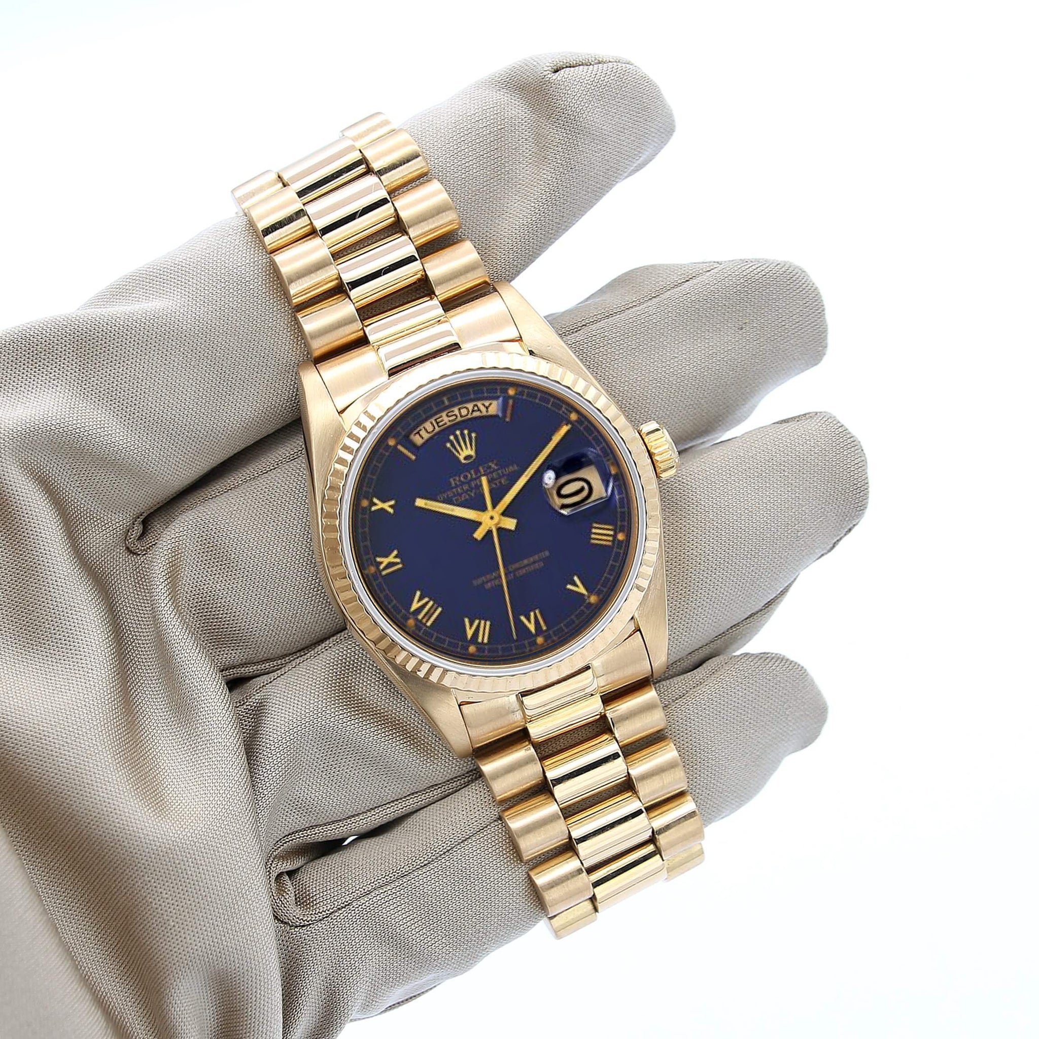 For sale at Debonar Watches: pre-owned Rolex Day-Date 36 ref. 18038 with a well known blue dial with roman numbers, full set.