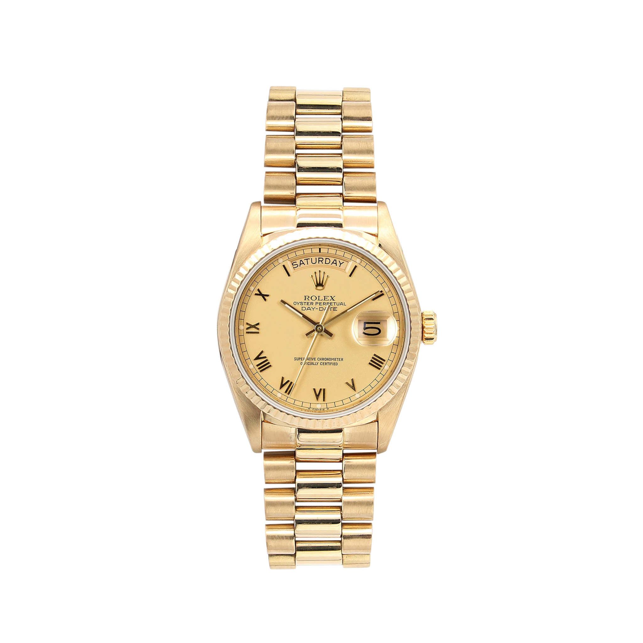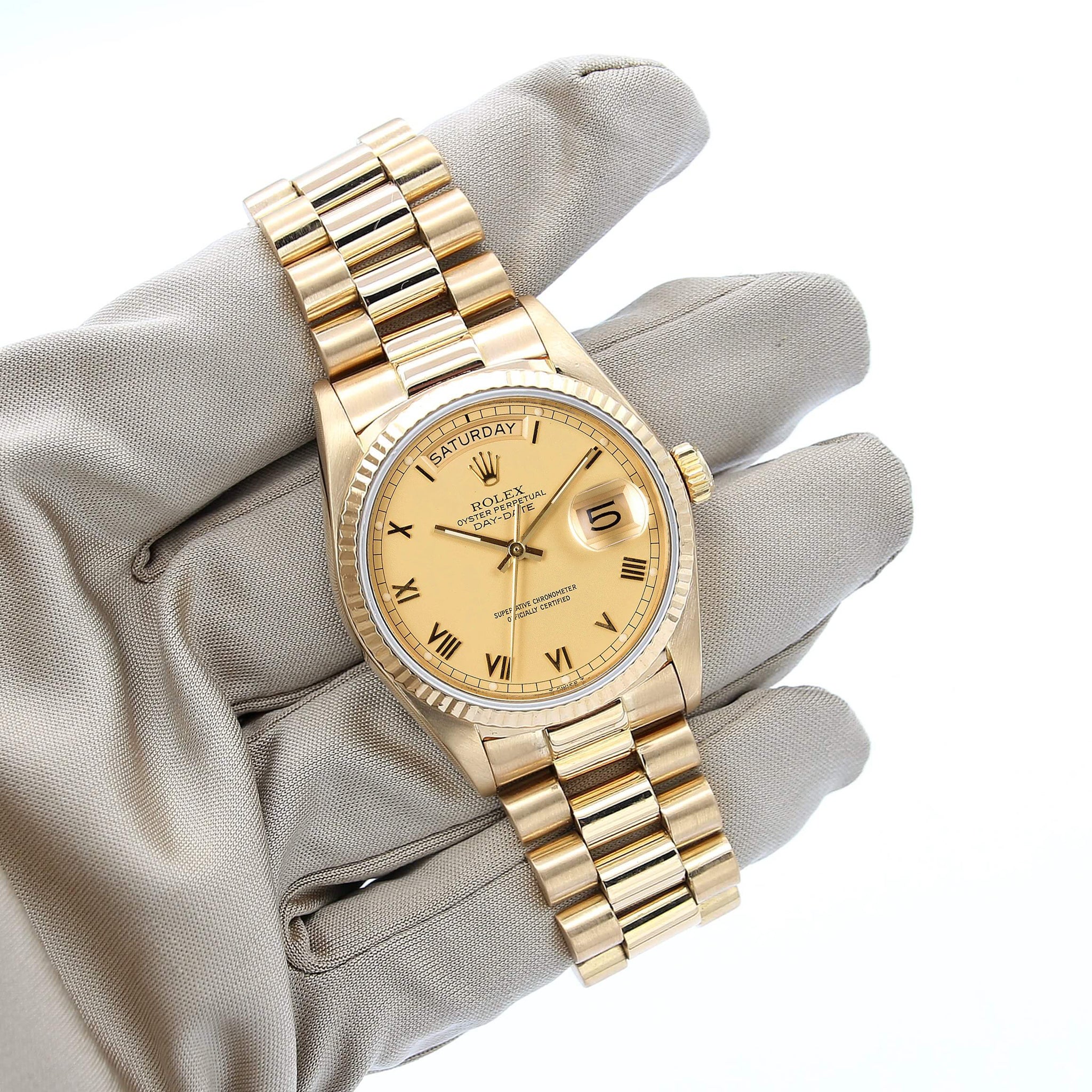 For sale at Debonar Watches: pre-owned Rolex Day-Date 36 ref. 18038 with a classic champagne dial with roman numbers, full set.