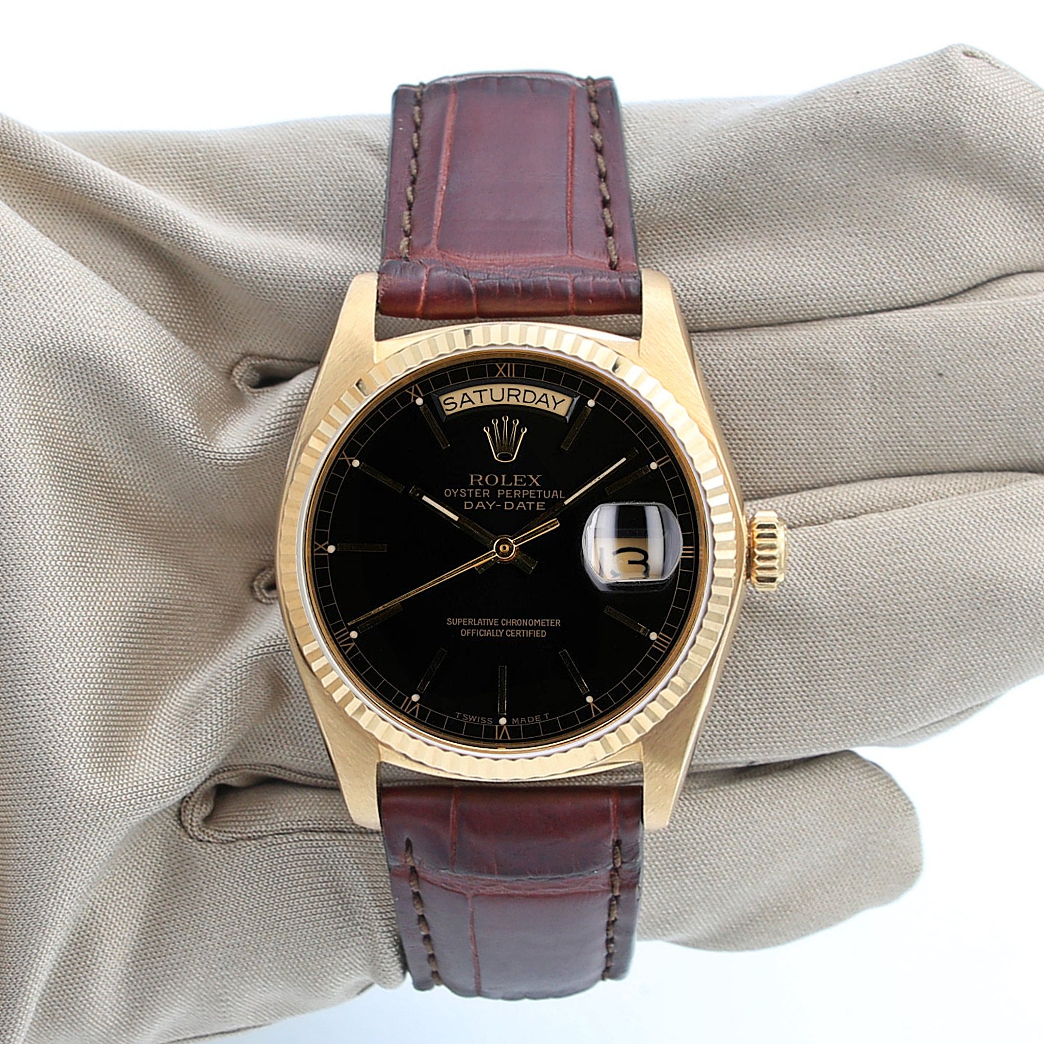 For sale at Debonar Watches: pre-owned Rolex Day-Date 36 ref. 18038 with a deep black dial, on a generic leather strap.