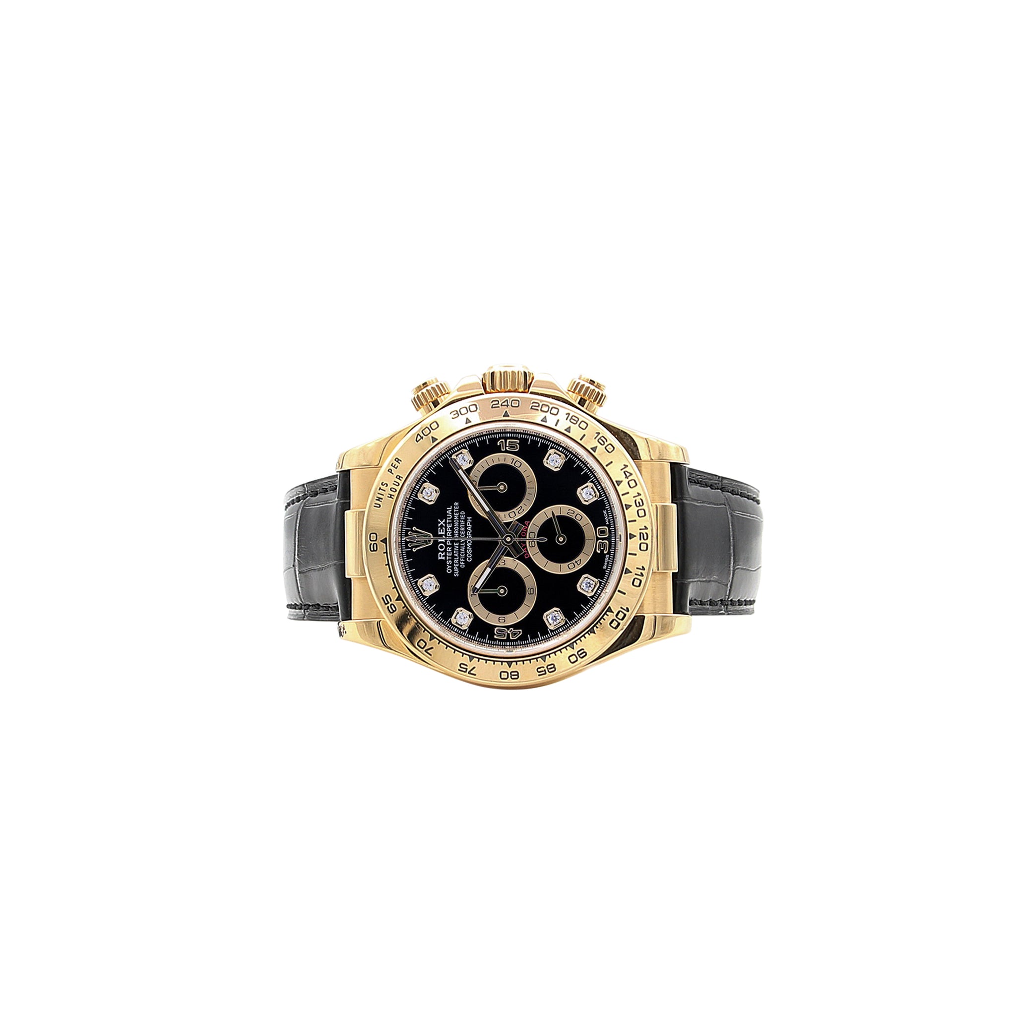 The 116518 is engineered with a 40mm yellow gold case, leather strap, yellow gold bezel, and sapphire crystal.
