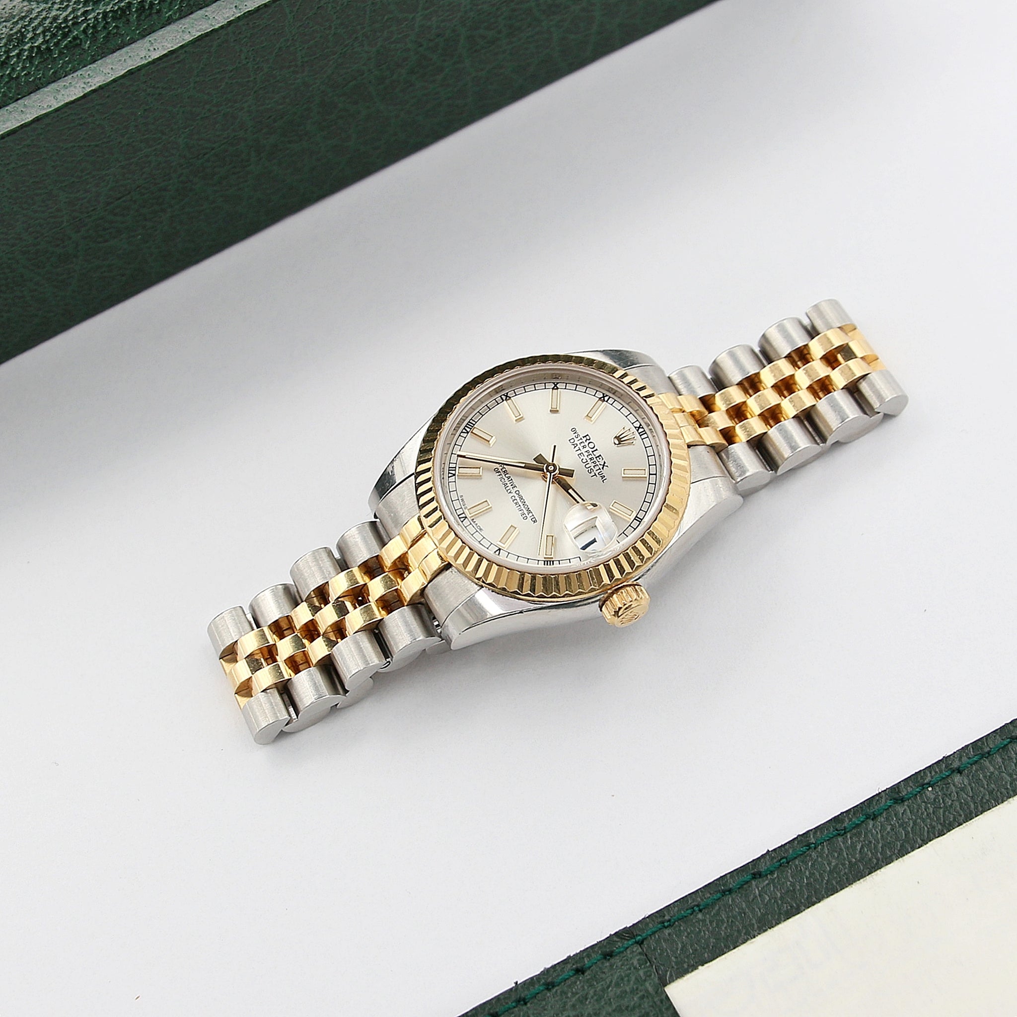 This pre-owned Rolex Lady-Datejust Ref. 178273, with a 31mm Oystersteel and yellow gold case, fluted yellow gold bezel, silver and date indicator at 3 o'clock, sapphire crystal, automatic movement calibre 2235. Oystersteel and yellow gold bracelet with folding clasp.