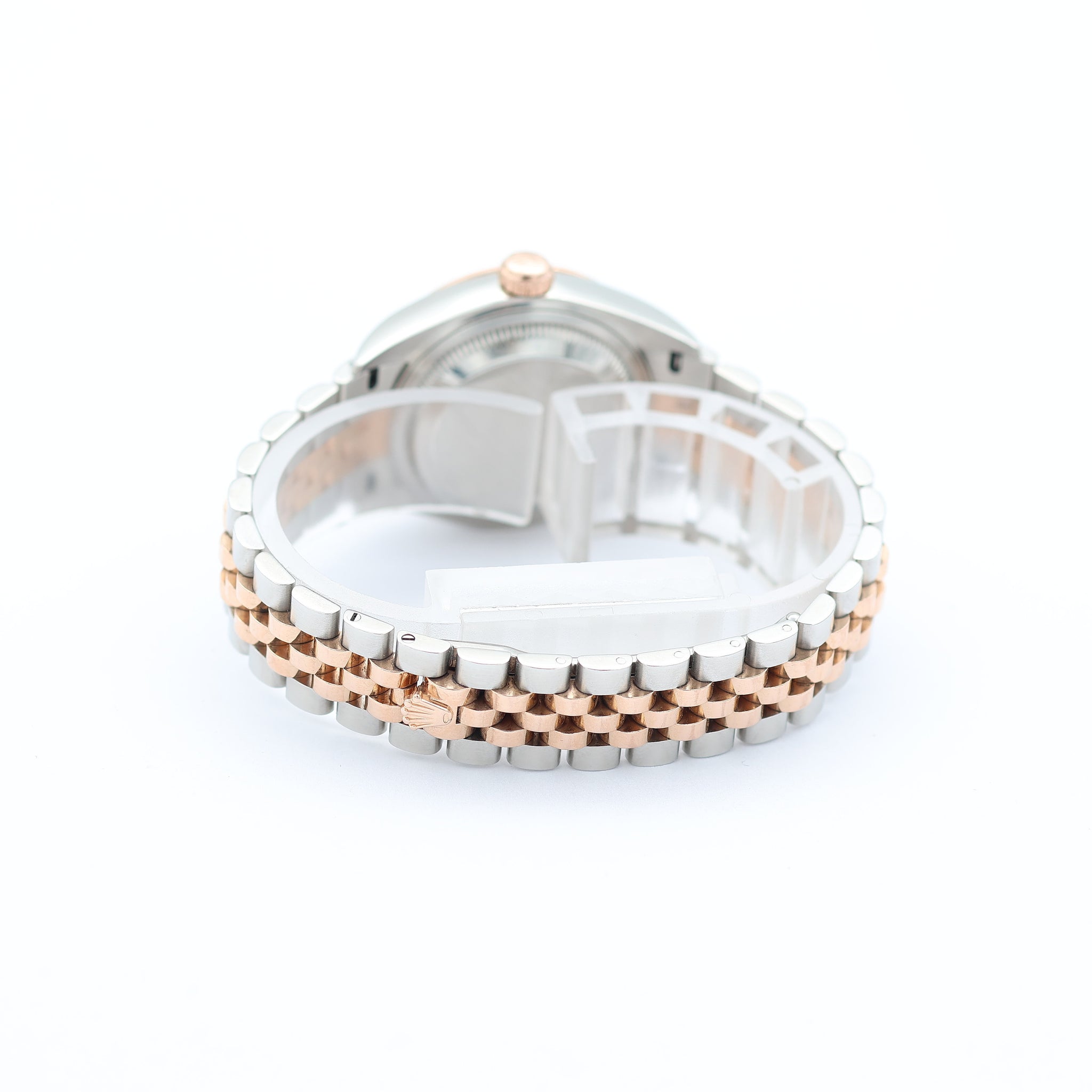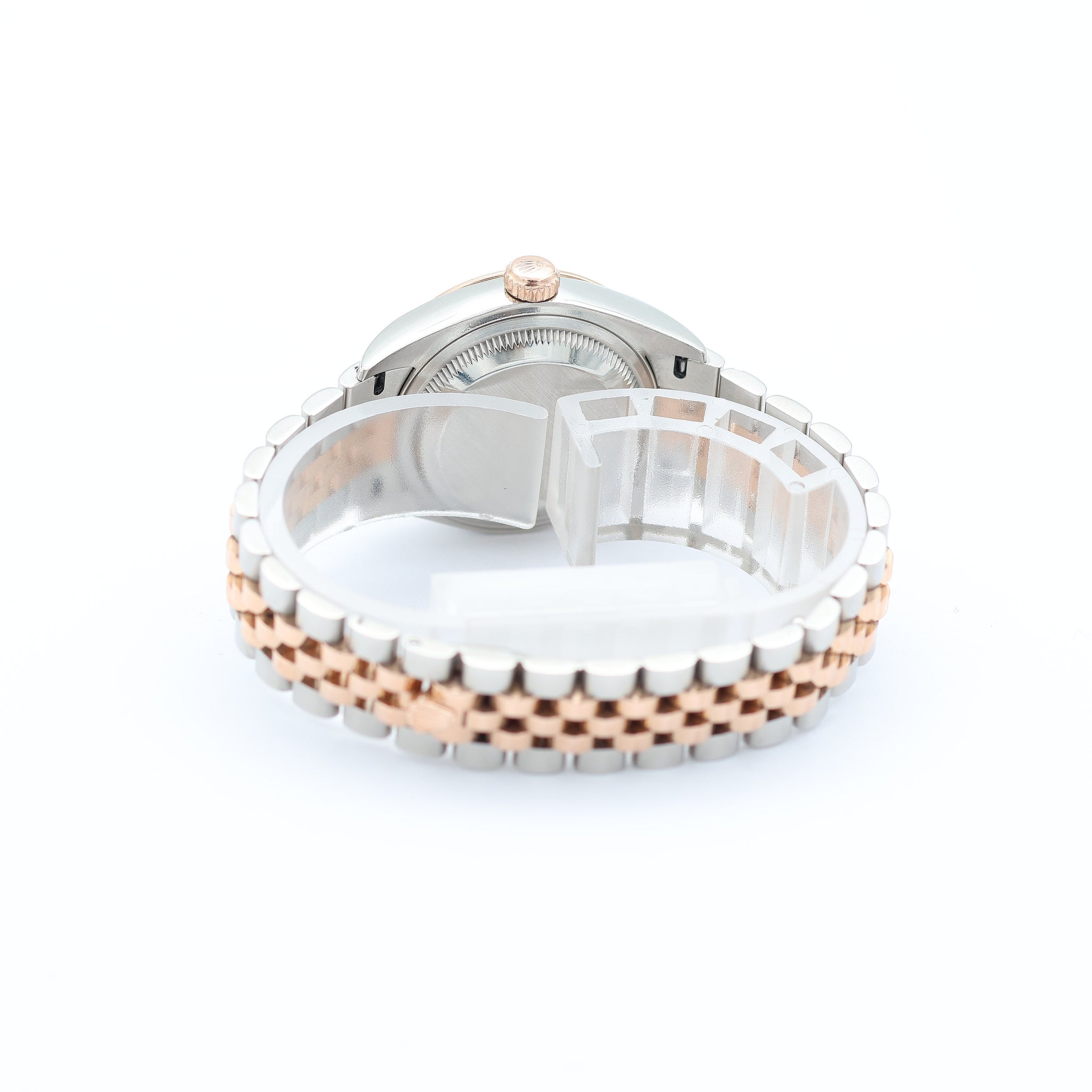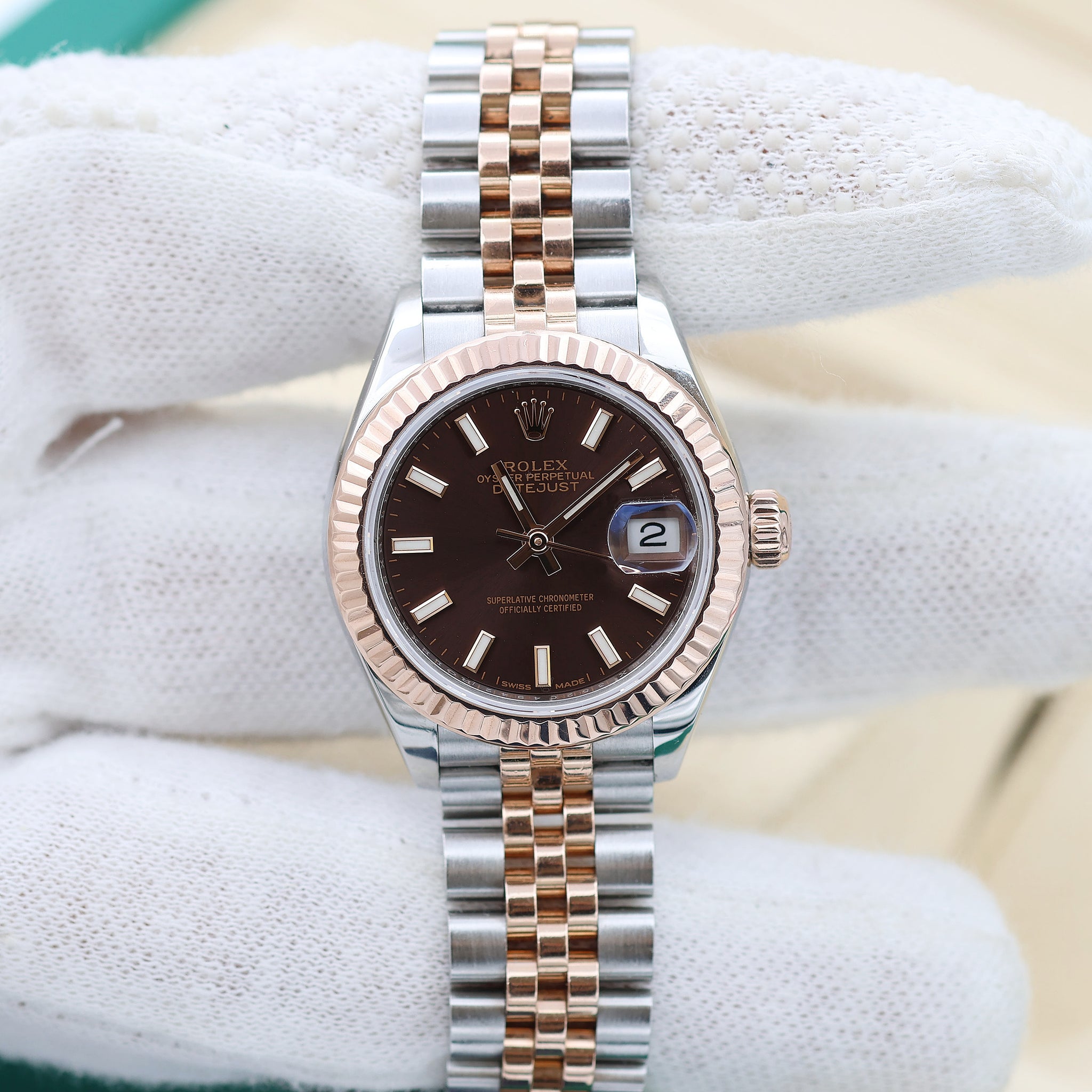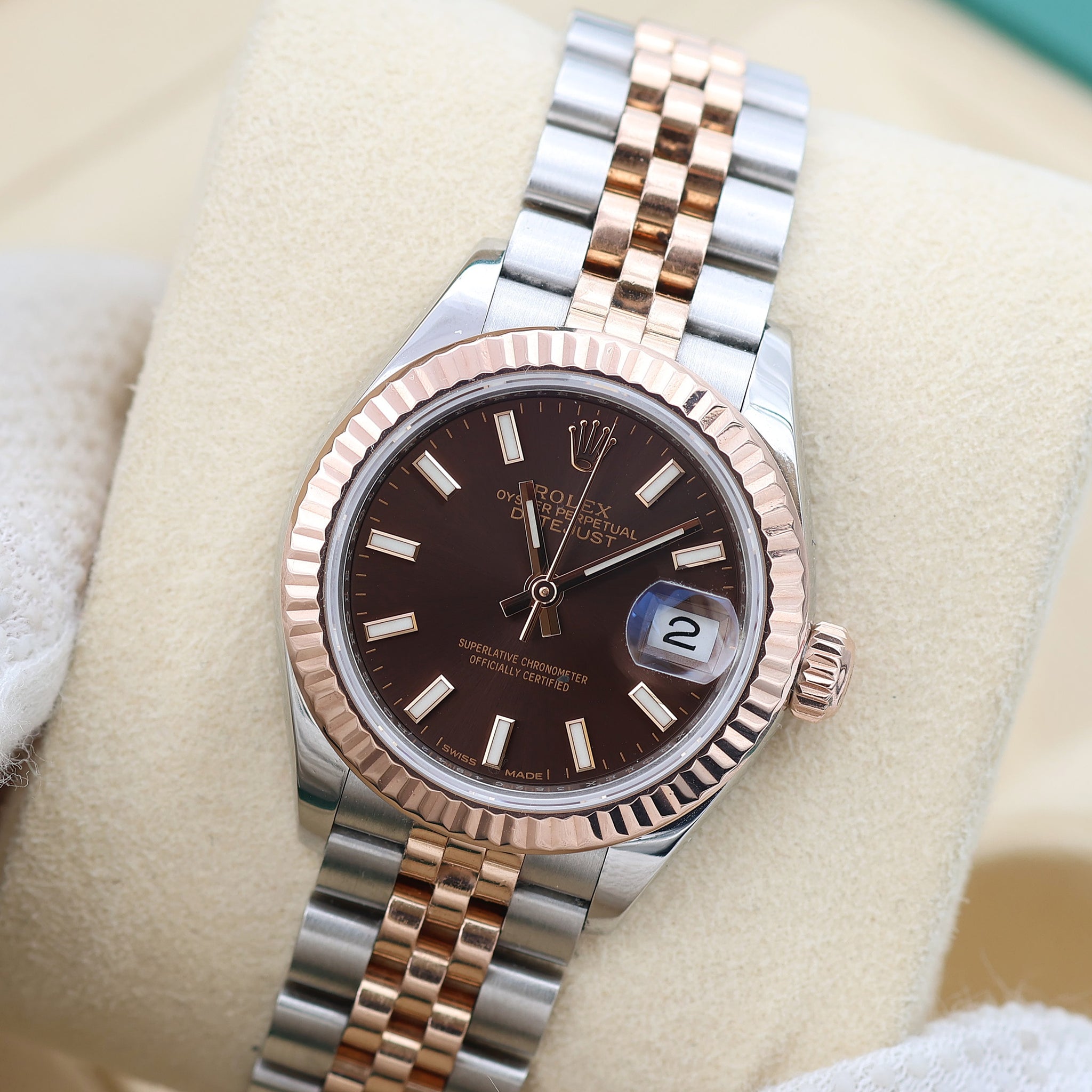 The Lady Datejust 28 is a charming watch with chocolate dial and diamonds that strikes the perfect balance between romantic and functional. The two-tone stainless steel and everose gold 28 mm case is assembled with a fluted, everose gold bezel, cyclops lens over the date, and screw-down crown with twinlock double waterproofness system.