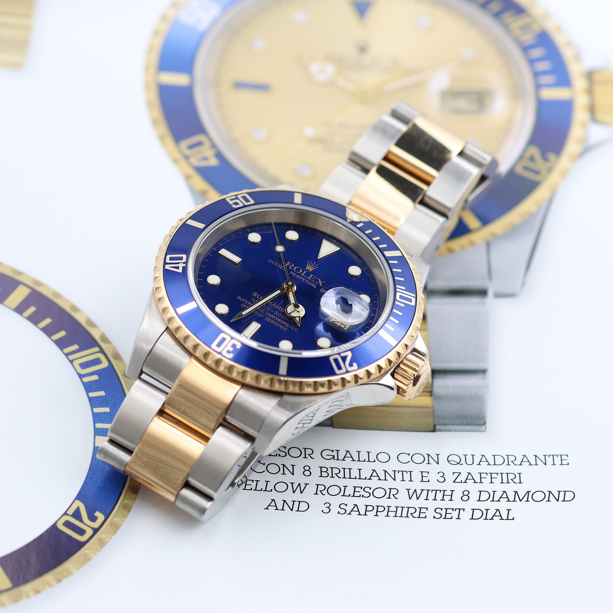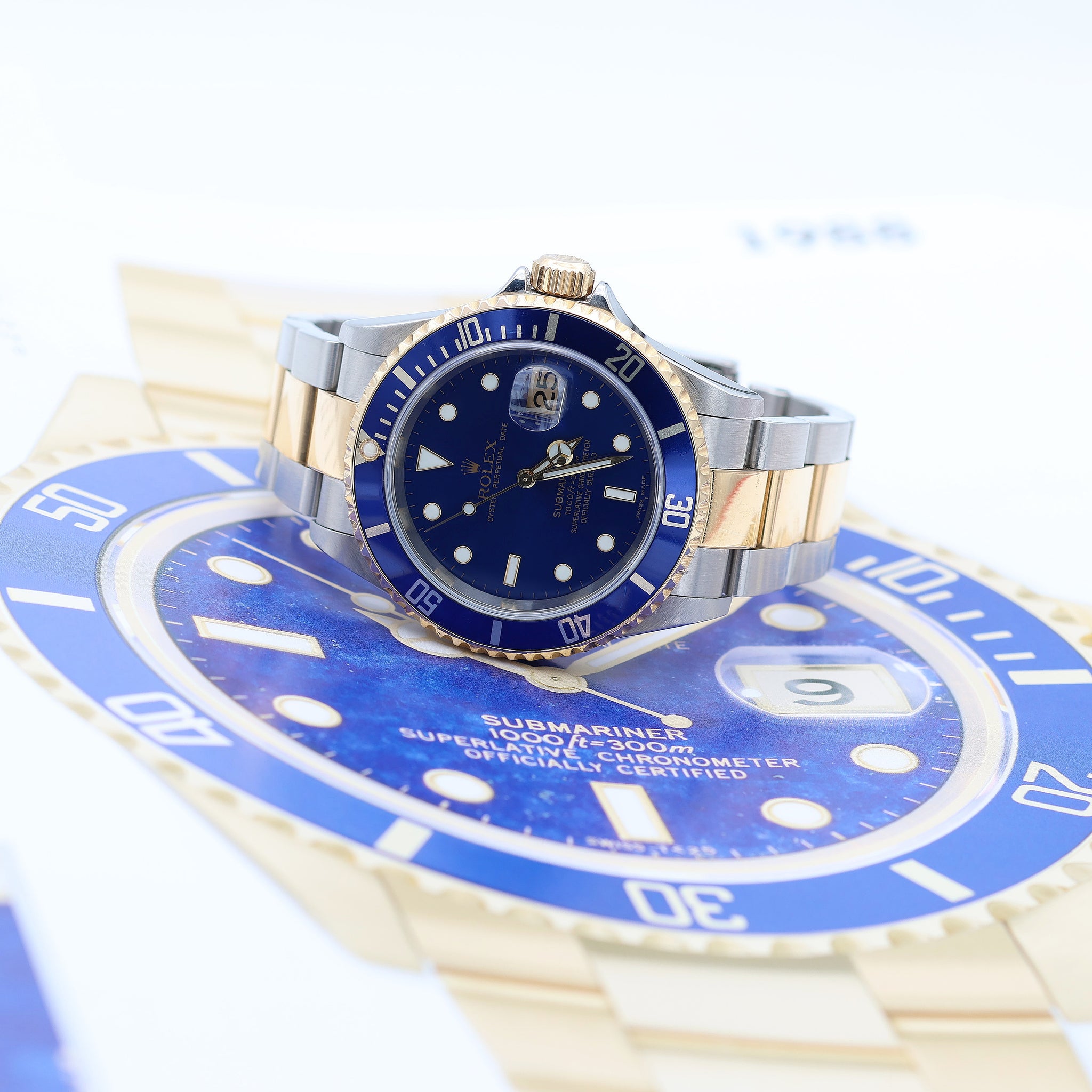 The 16613 retains a vintage charm with its aluminum bezel insert and slightly thinner case profile, compared to the modern ref. 116613. The unidirectional rotatable bezel of the Rolex 16613 is both a functional diving tool and a design element.
