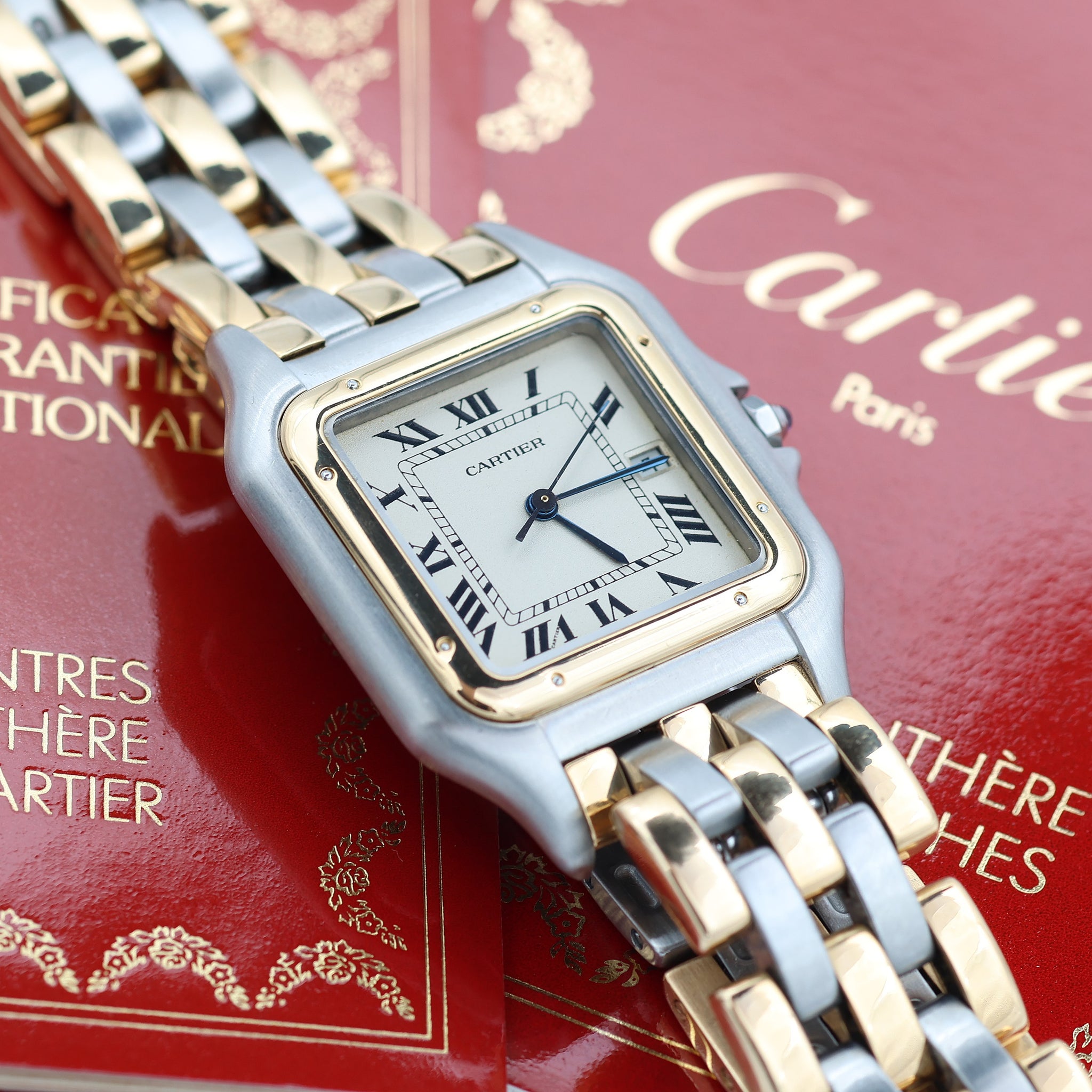 For sale at Debonar Watches: pre-owned Cartier Panthere ref. 187957 from the '90s, in steel and gold 18k, full set. It is a very rare piece with its 3 yellow gold lines.