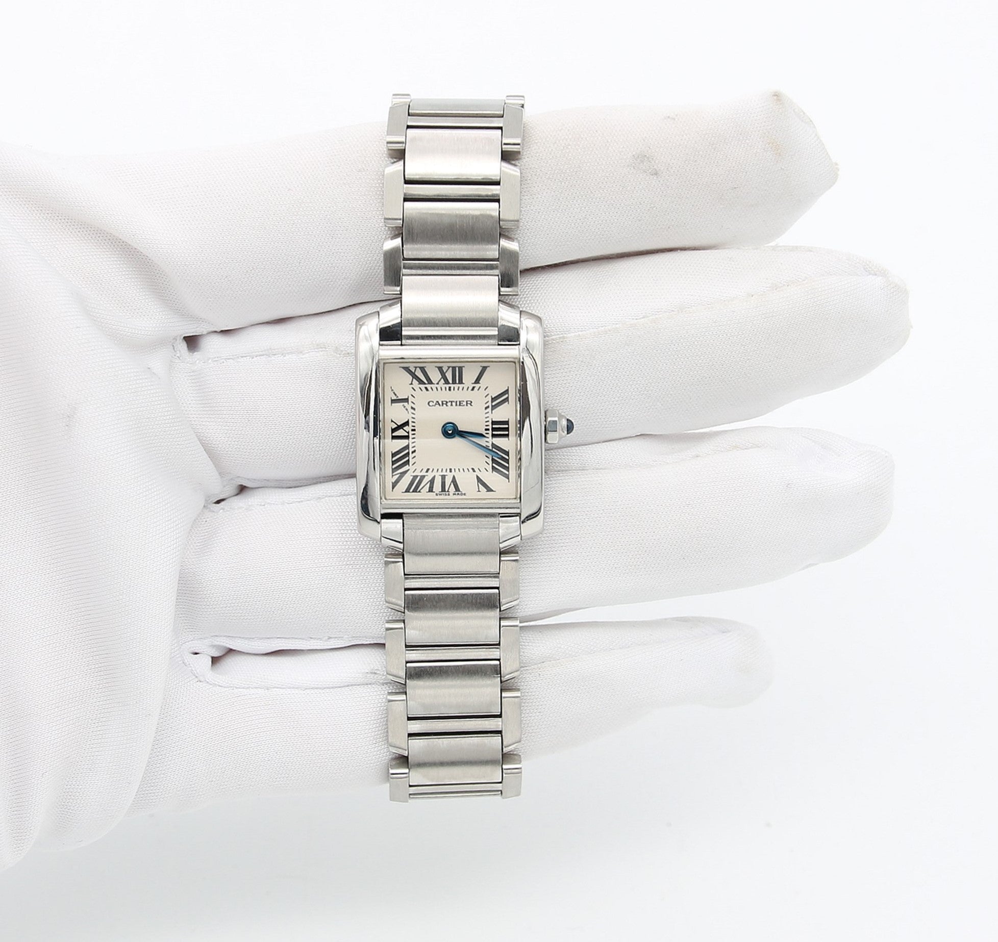 This Cartier “Tank Francaise” reference 2384 in an elegant waterproof lady’s watch, with steel case and bracelet. The rectangular-shaped steel case is water resistant with case back secured with 4 screws, and original steel crown with sapphire cabochon.